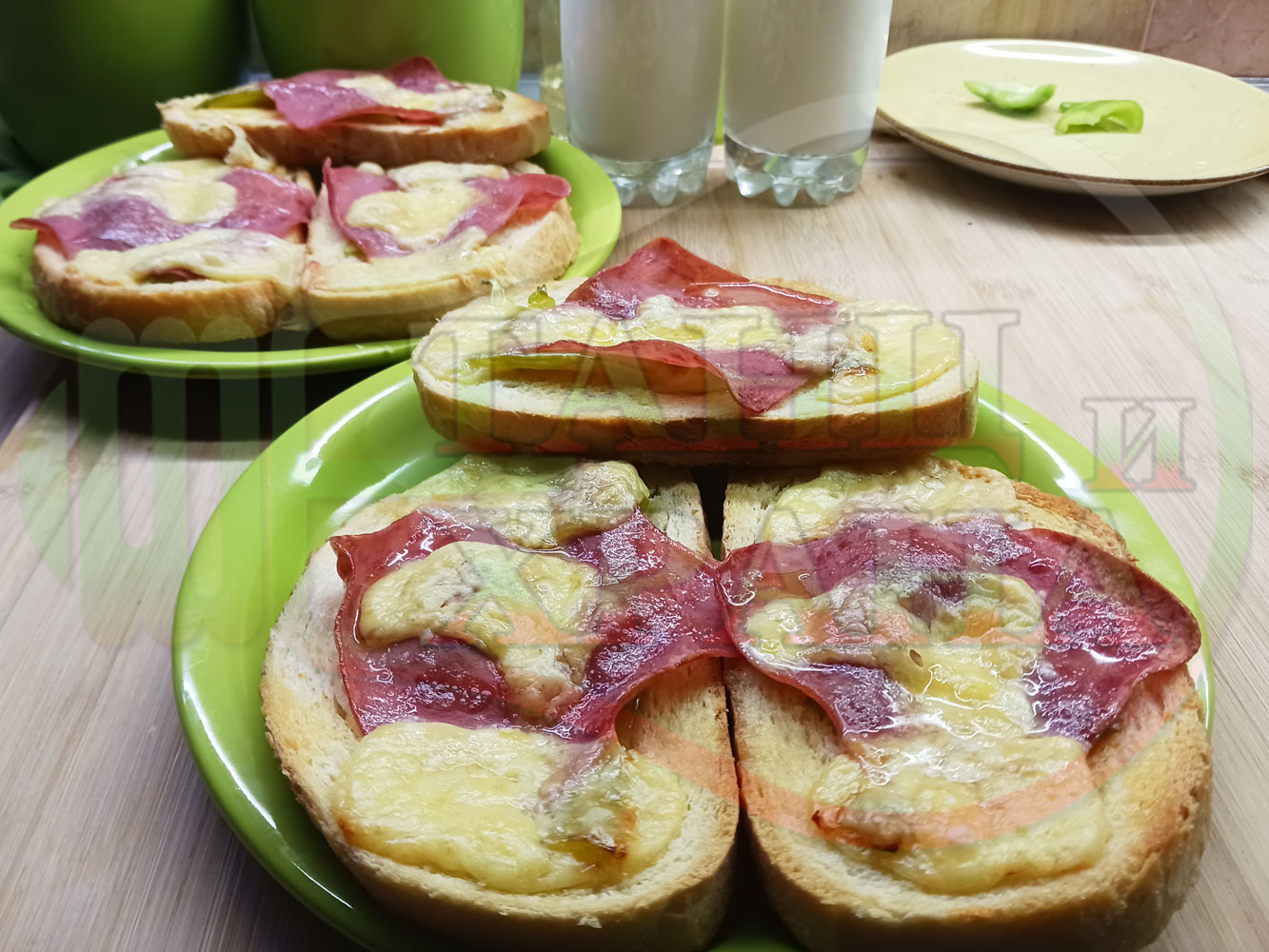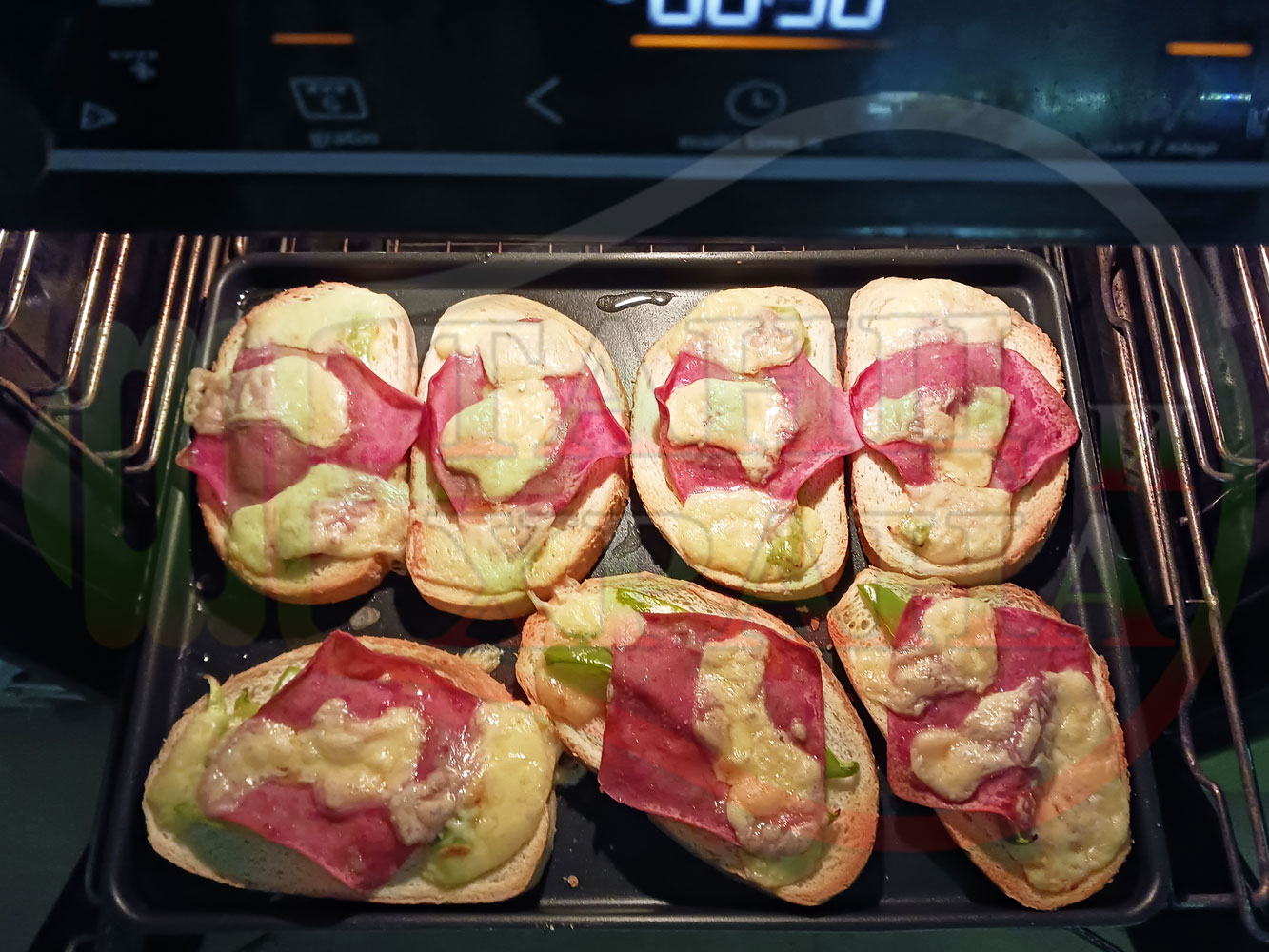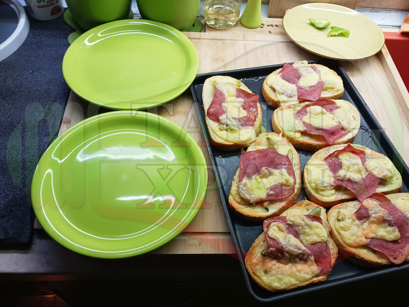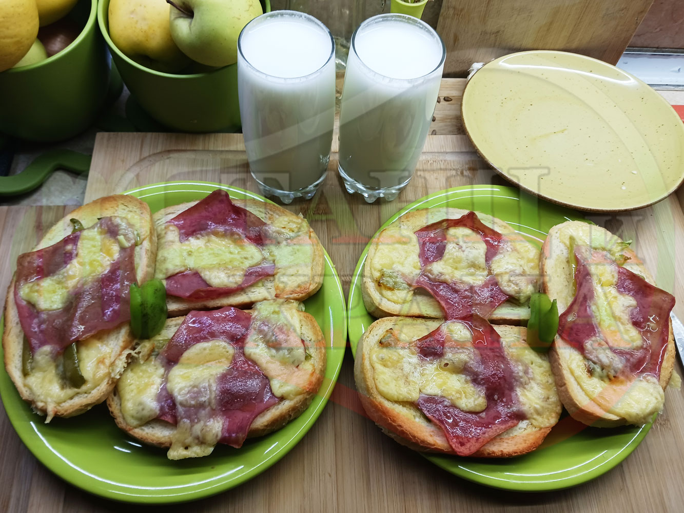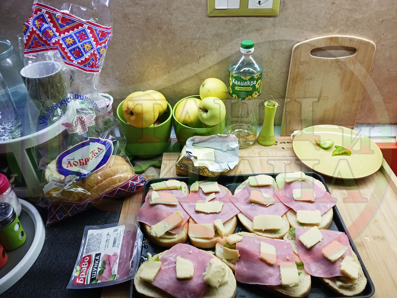 Български филийки "Шункови зеленочушкови кашкавалени" запечени на фурна с краве масло, зелени пресни чушки, шунка и млечен кашкавал