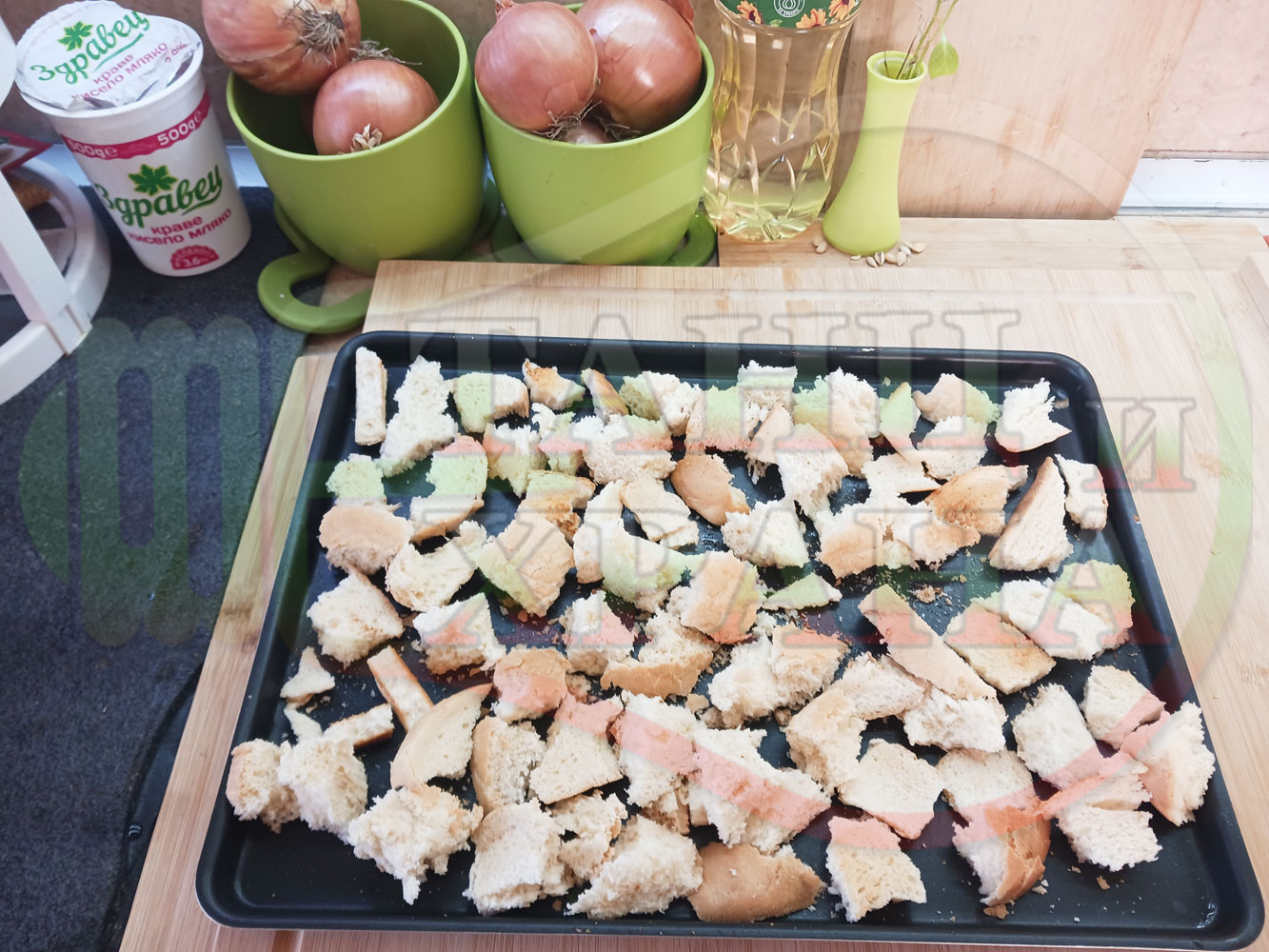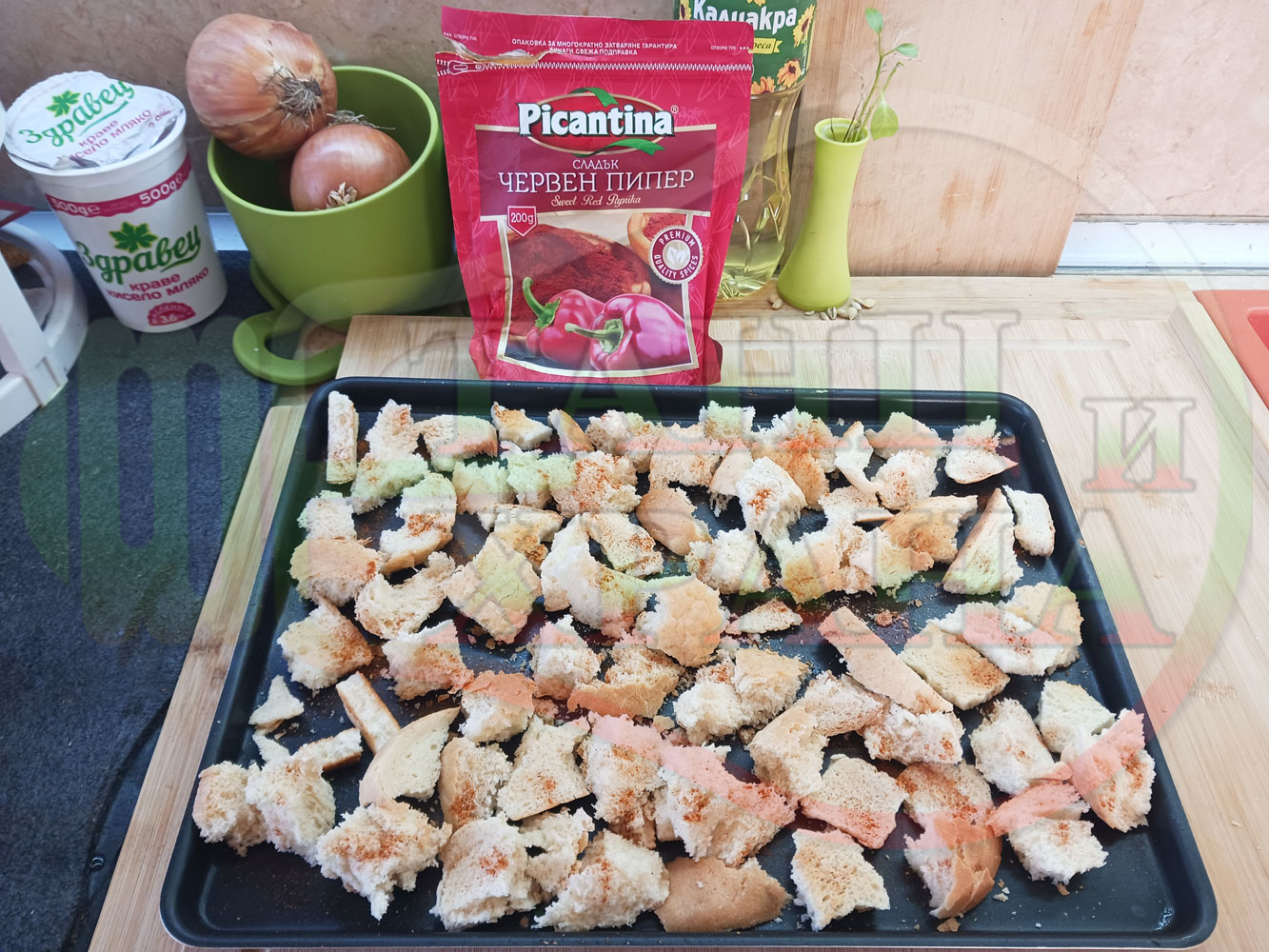 Сипете половината от слънчогледовото олио в тънка тава за печене и го размажете равномерно по тавата чрез накланяне или с четка. Надробете или нарежете хляба на едри парченца и го поръсете с червения сладък пипер. Обелете и измийте кромид лука, нарежете го на средно широки ивички и го добавете в тавата (запазете вътрешната част на лука за украса). Сипете втората част от олиото върху хлебните крутони и лука и ги разбъркайте за да се овкусят и усвоят в някаква степен олиото и пипера (да полепнат по хляба и лука в максимална степен). Поставете тавата в предварително загрятата фурна (загрейте я за поне 5 минути). Запечете на фурна без вентилатор на 180 градуса за около 17 минути.