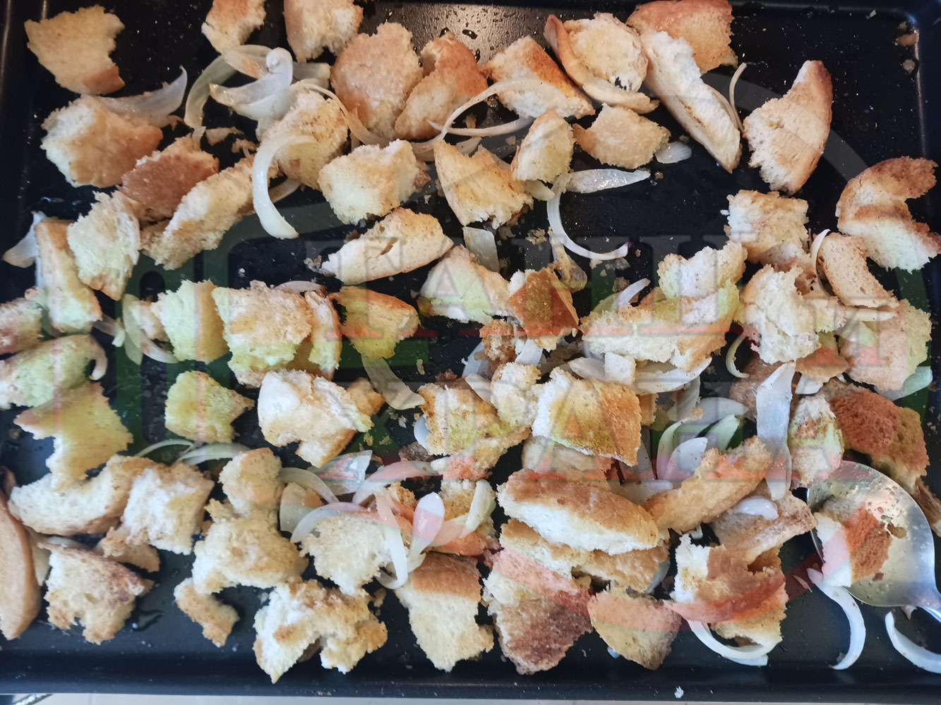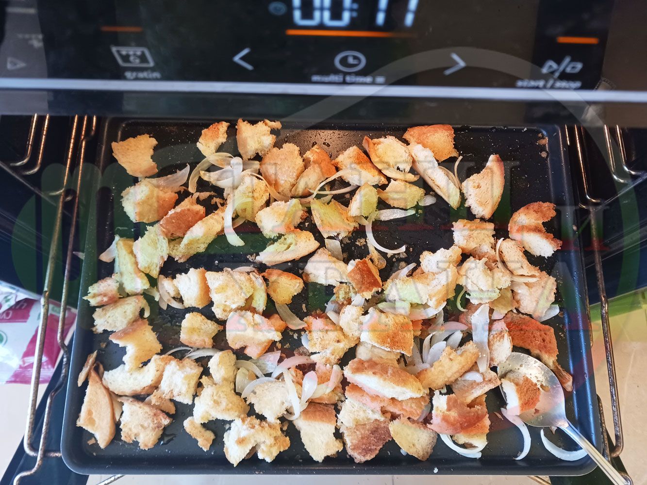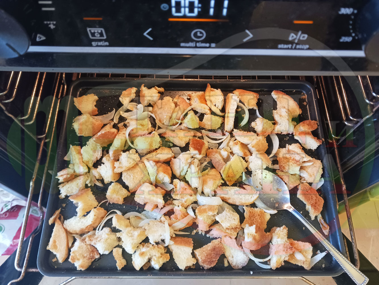 ВНИМАНИЕ: Фурните са различни и съответно времето за запичане е ориентировъчно. Наблюдавайте процеса на запичане и при необходимост, покрийте с хартия или фолио за печене. Разбърквайте често крутоните и лука за да се запекат равномерно от всички страни (задължително ги разбъркайте поне 1 път).