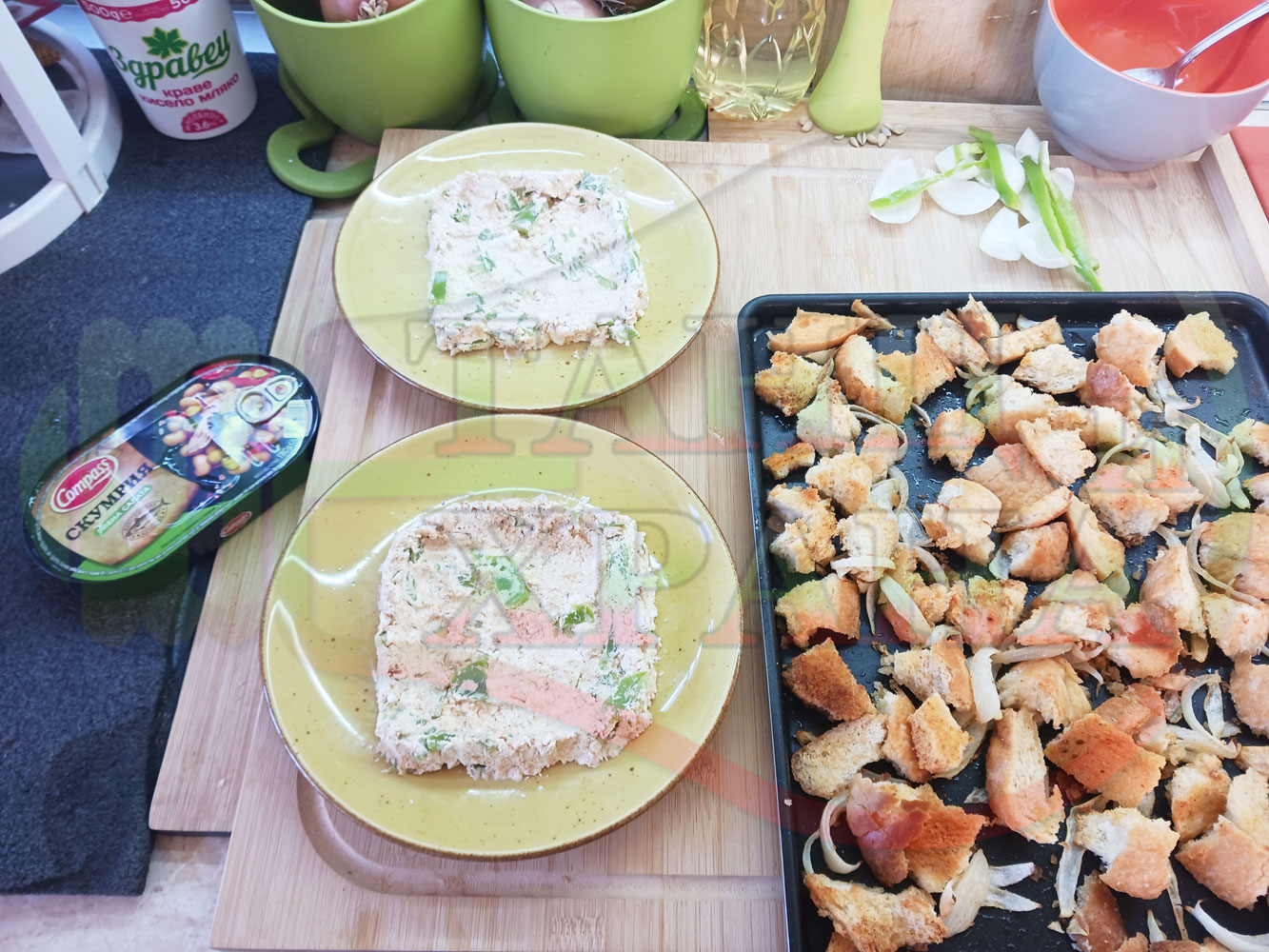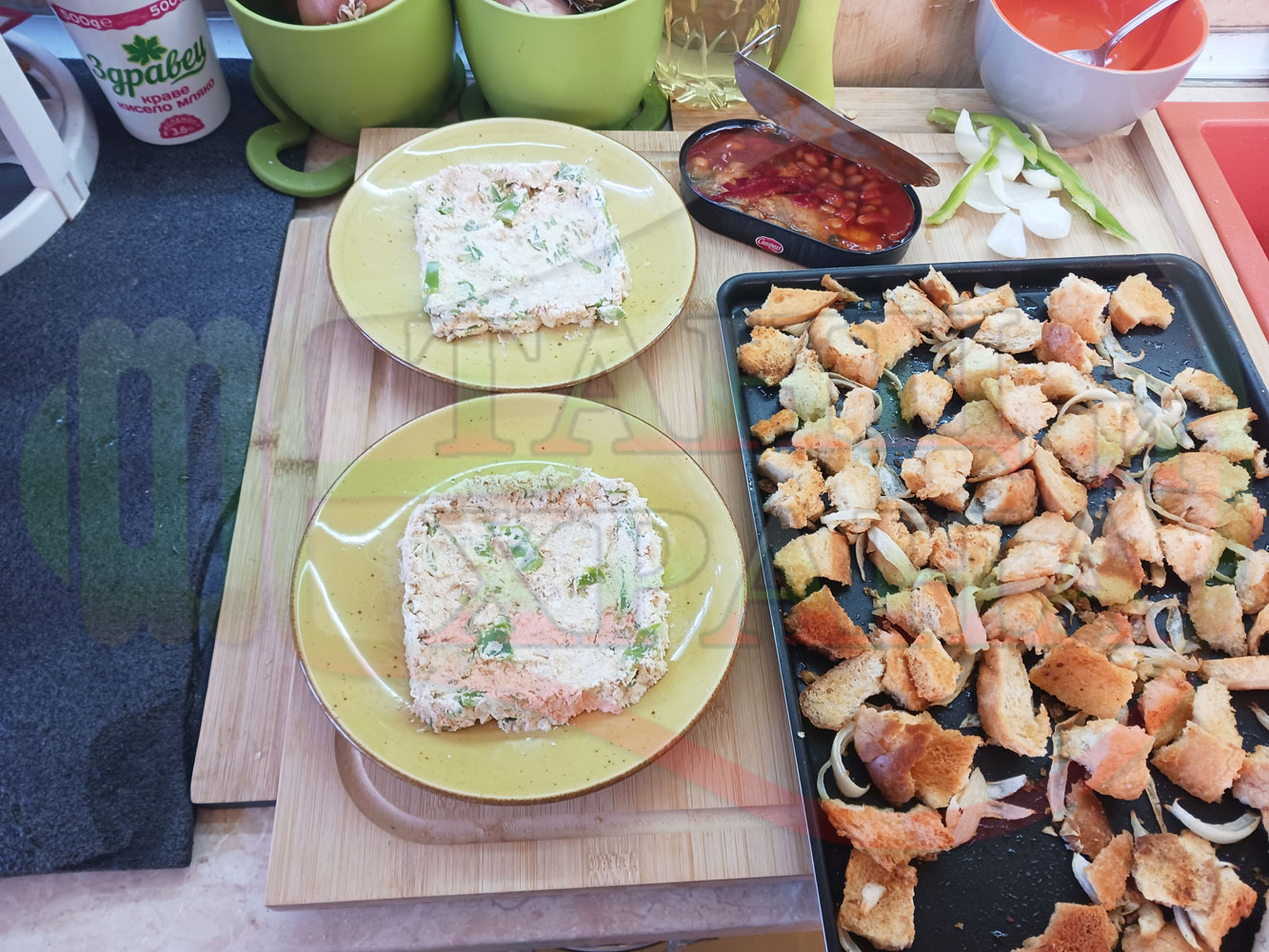 Крутони от бял хляб и добруджа "Червенопиперкови кромидлученоивичести" запечени на фурна със слънчогледово олио, червен сладък пипер и кромид лук нарязан на ивички