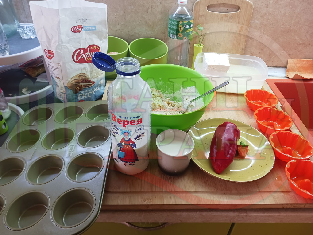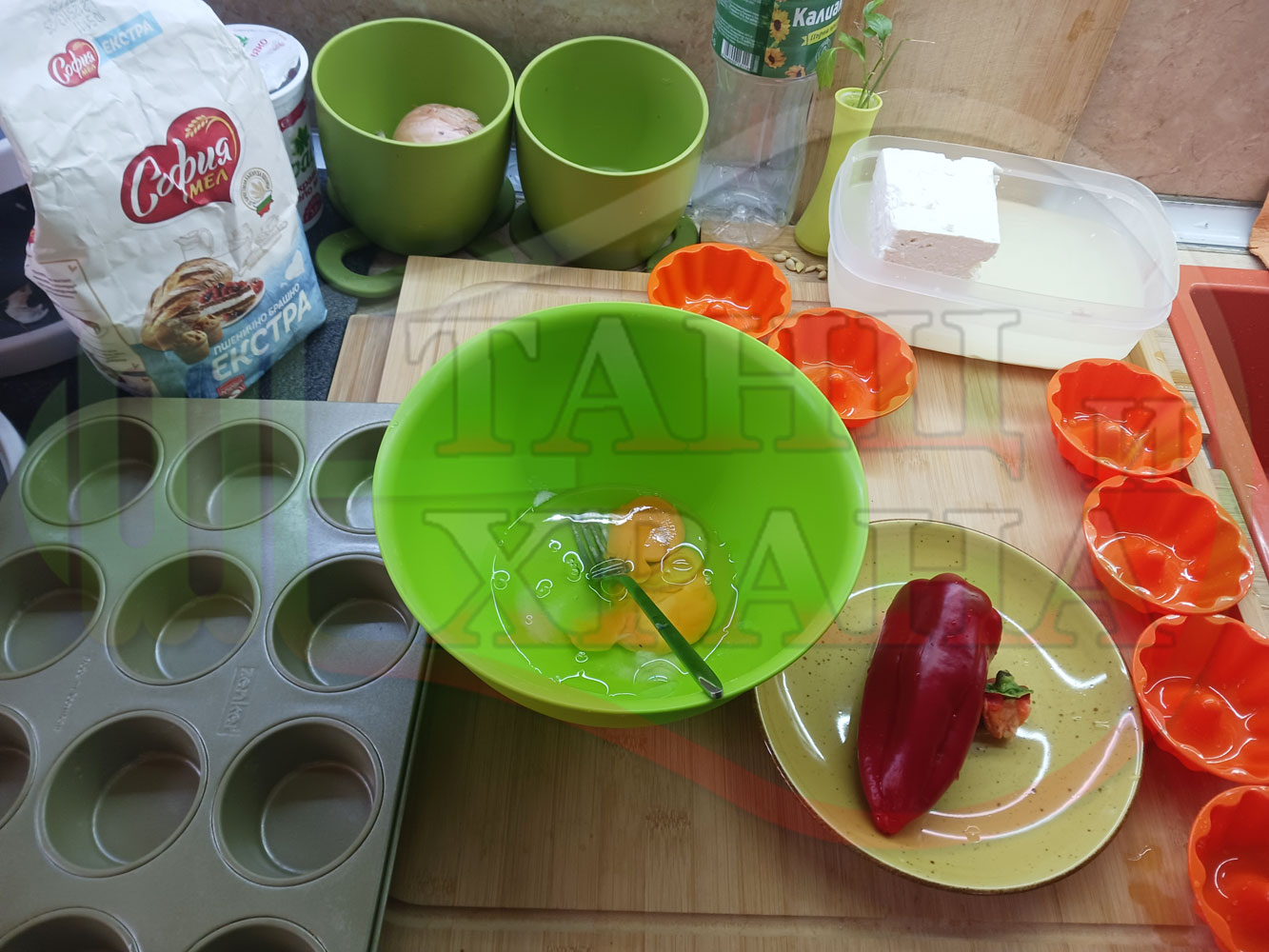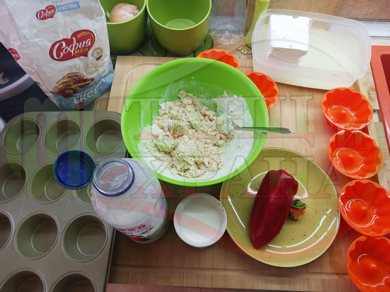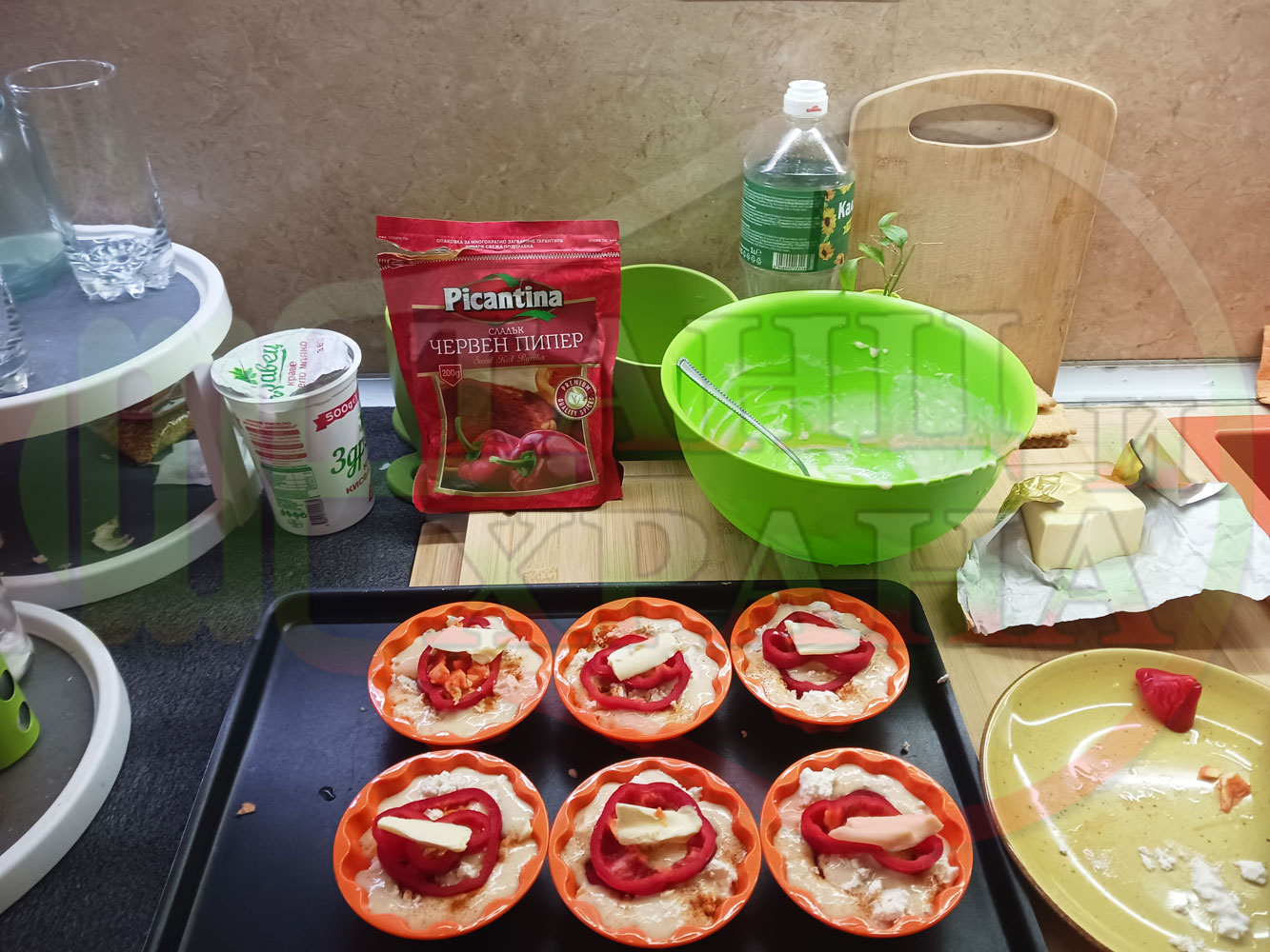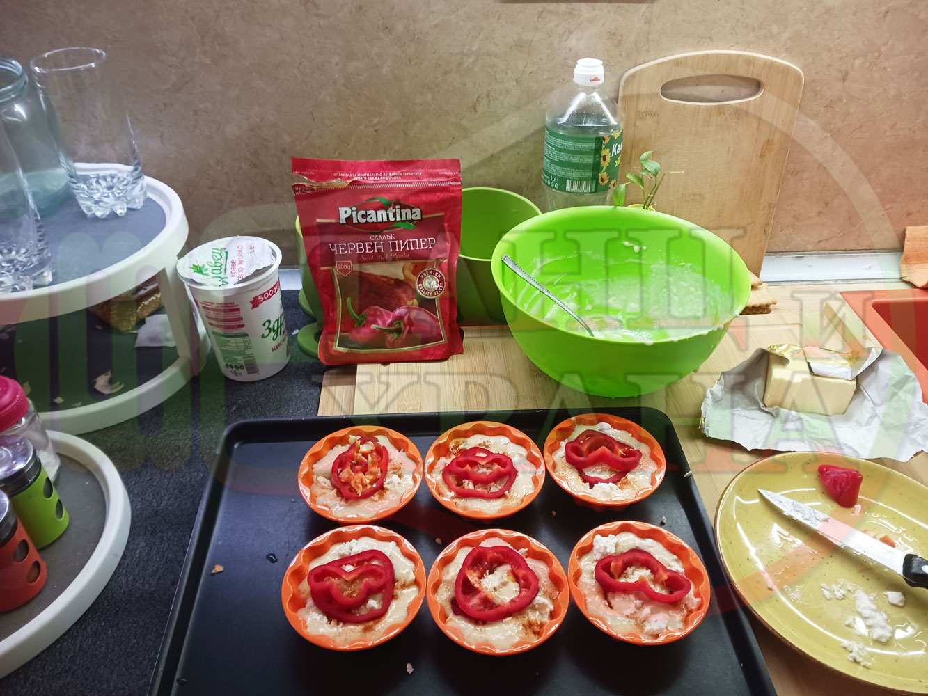 ПРОДУКТИ: Приблизителни количества за малки солени кексчета "Червеночушкови с БГсирене" изпечени на фурна с масло и пълнка от червени пресни чушки и краве бяло сирене (българско, саламурено), поръсени със сладък пипер омесени с прясно краве мляко и яйца