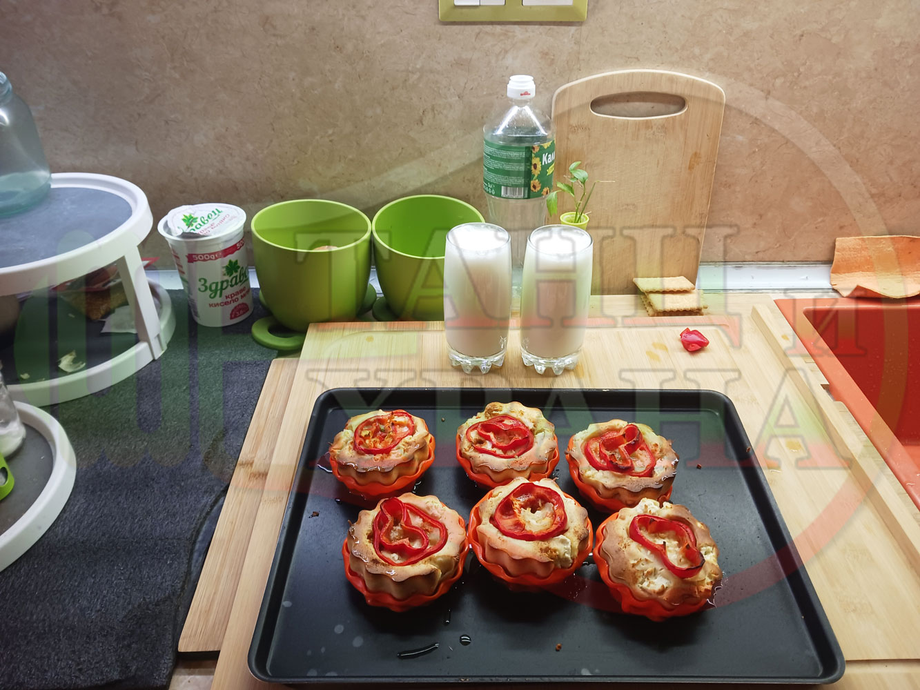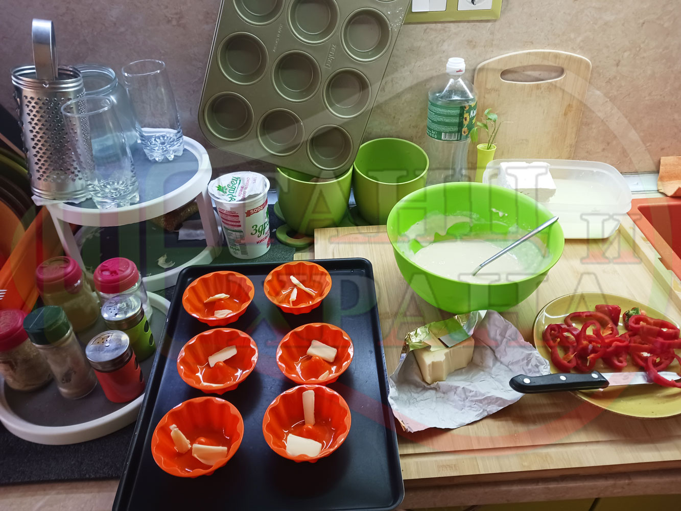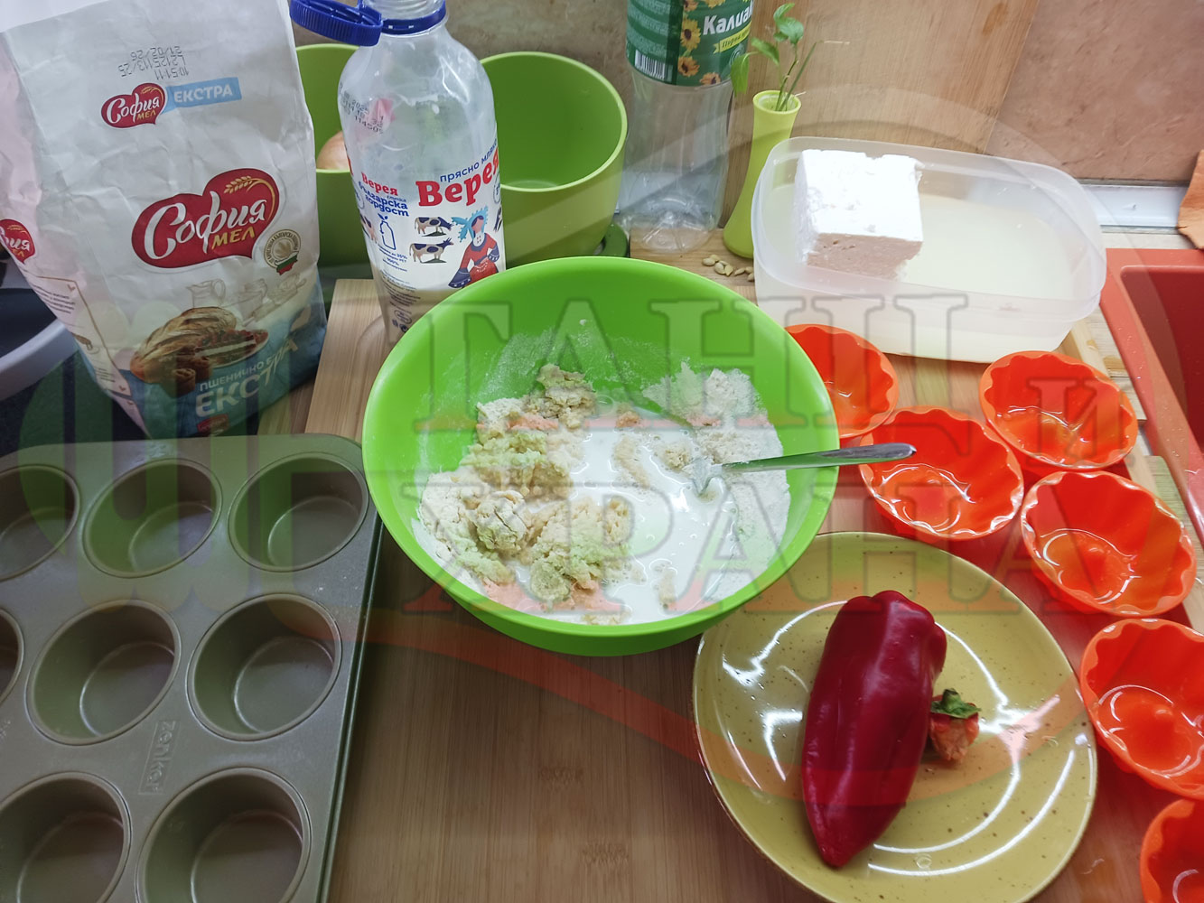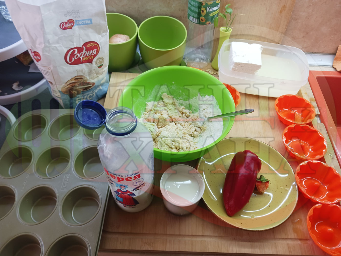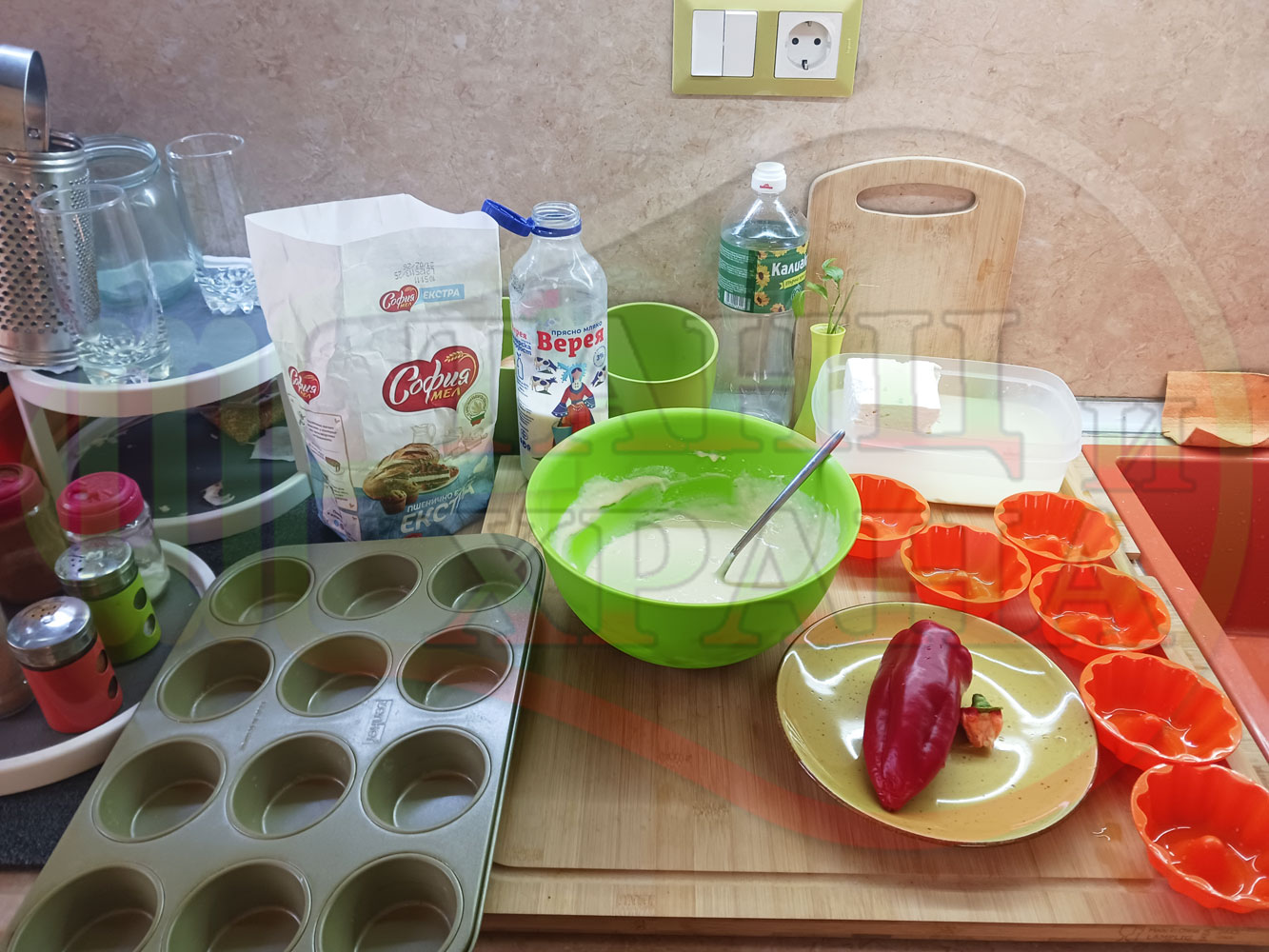 ПРОДУКТИ: Приблизителни количества за малки солени кексчета "Червеночушкови с БГсирене" изпечени на фурна с масло и пълнка от червени пресни чушки и краве бяло сирене (българско, саламурено), поръсени със сладък пипер омесени с прясно краве мляко и яйца