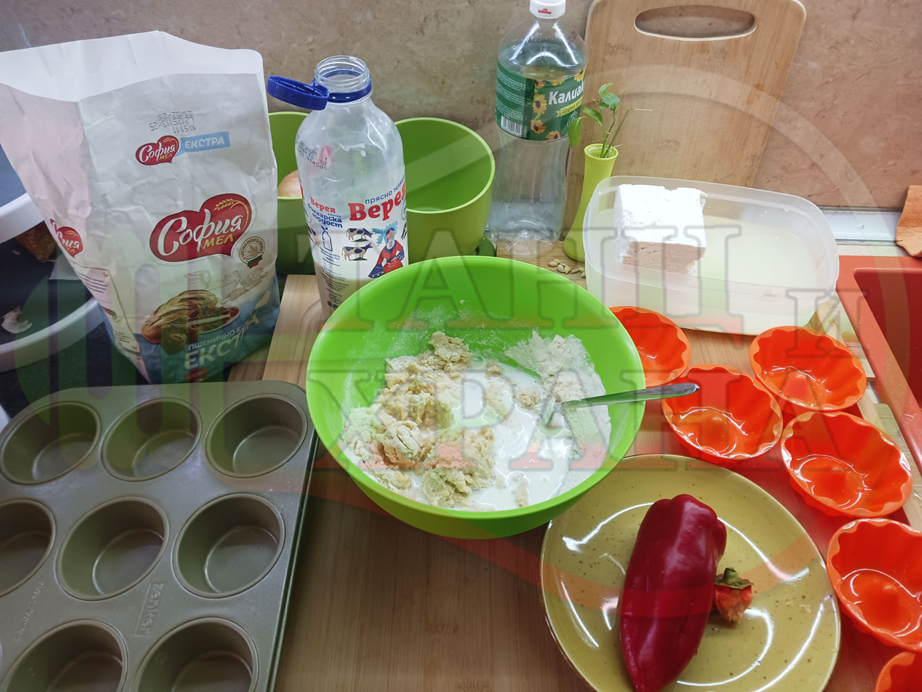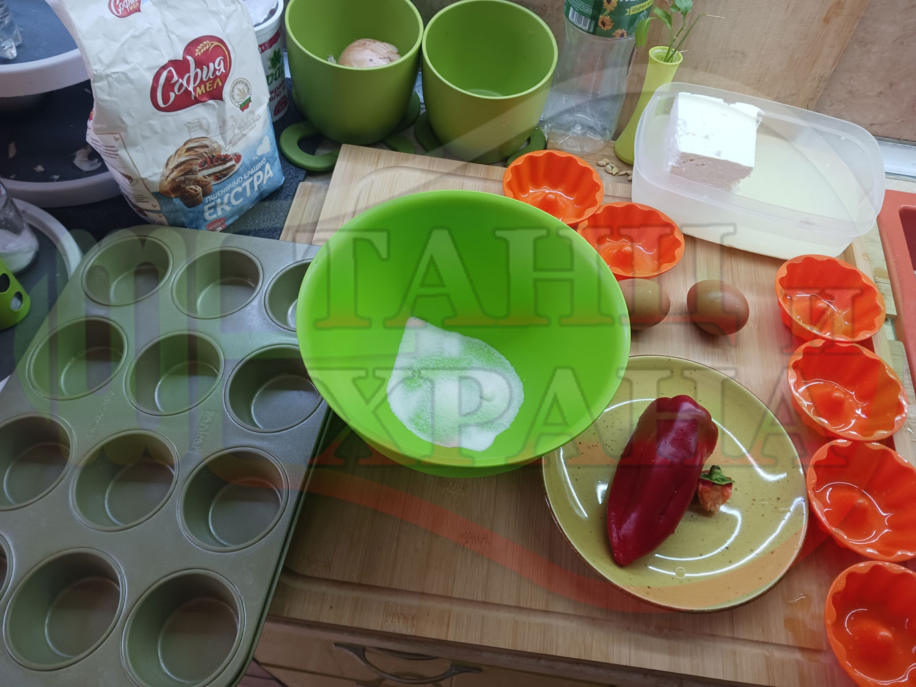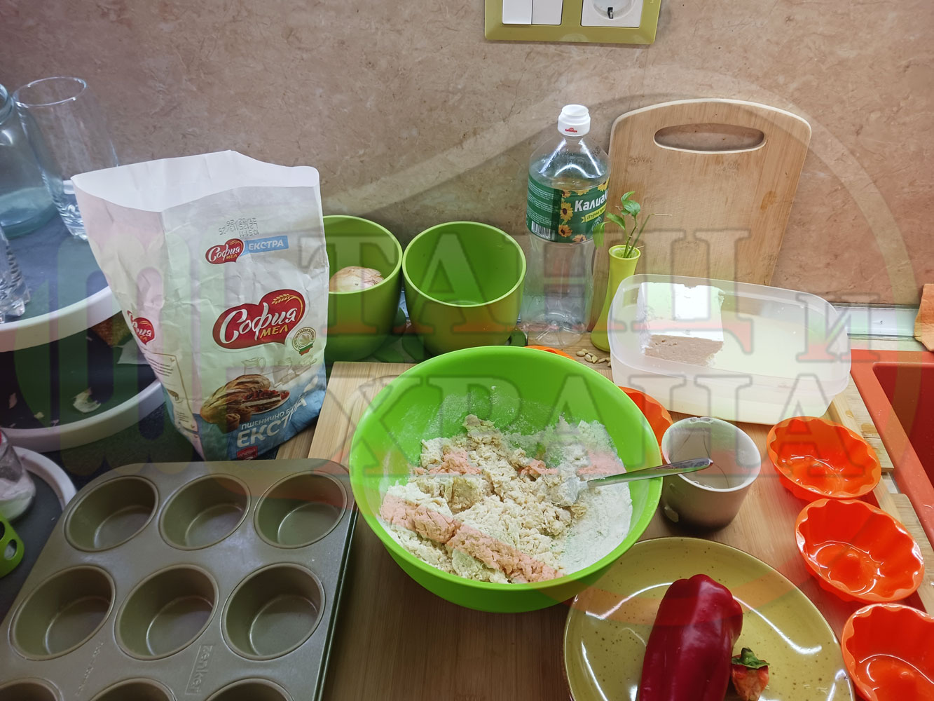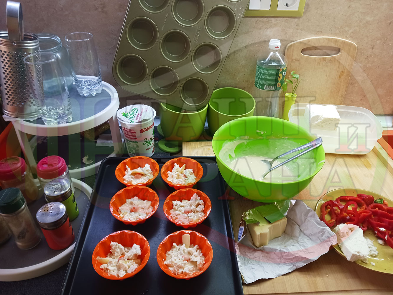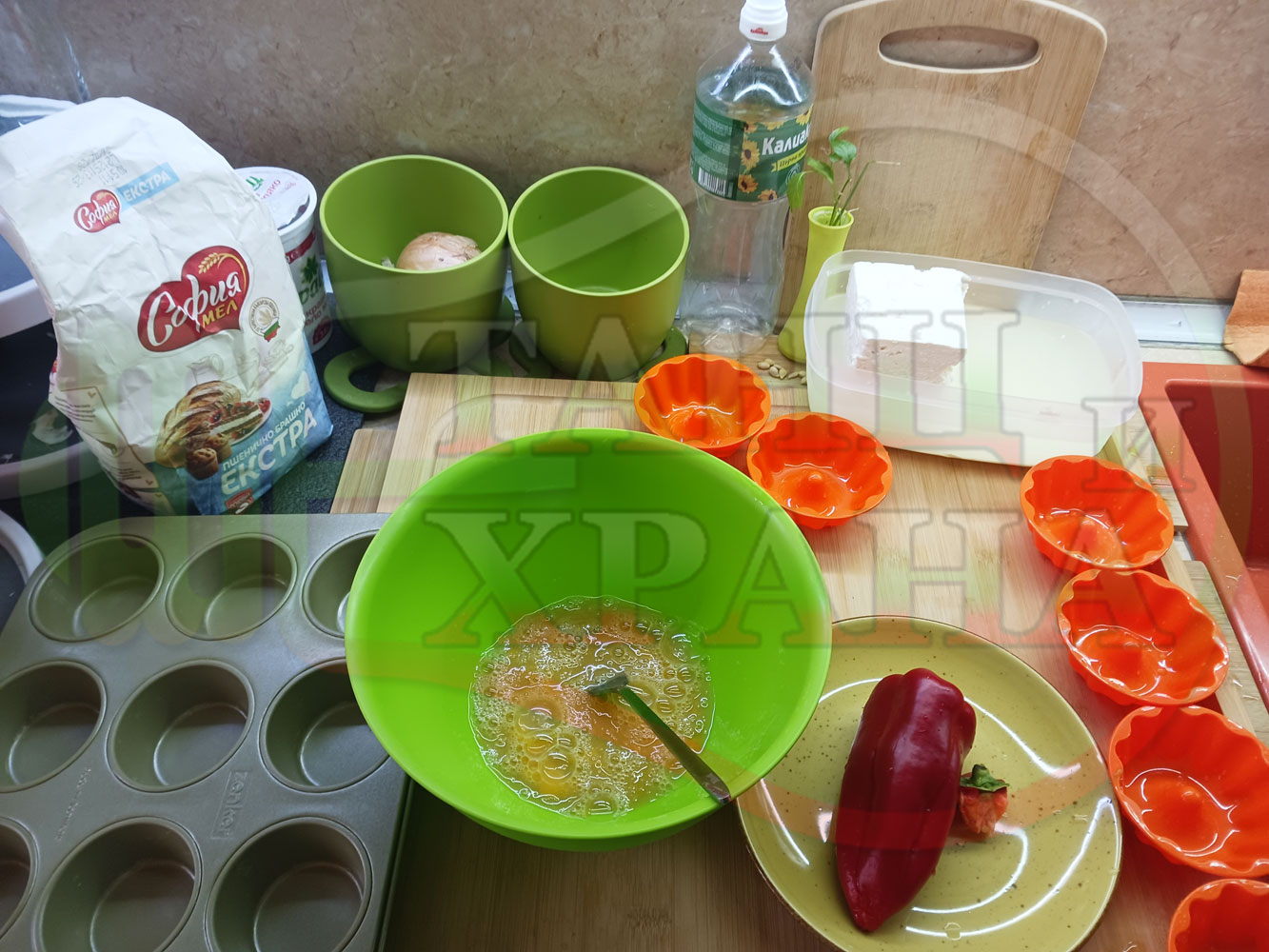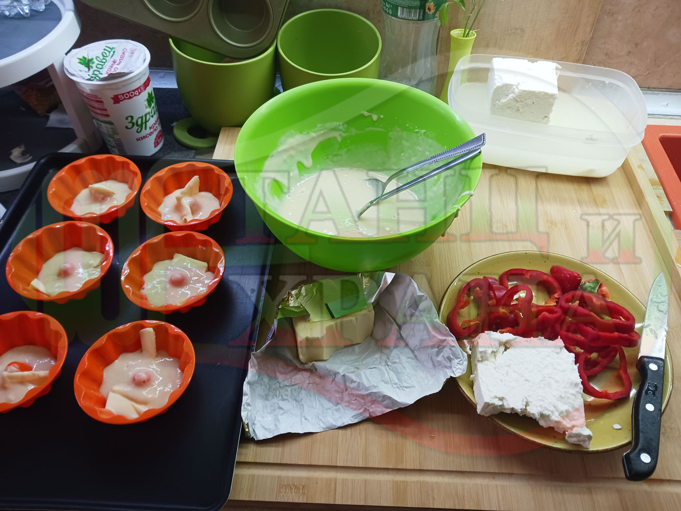 ПРОДУКТИ: Приблизителни количества за малки солени кексчета "Червеночушкови с БГсирене" изпечени на фурна с масло и пълнка от червени пресни чушки и краве бяло сирене (българско, саламурено), поръсени със сладък пипер омесени с прясно краве мляко и яйца