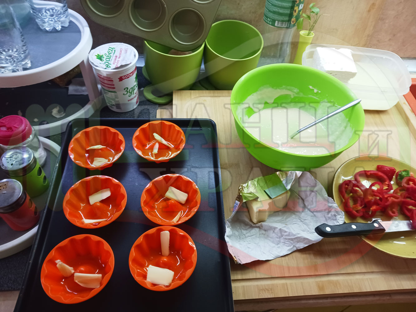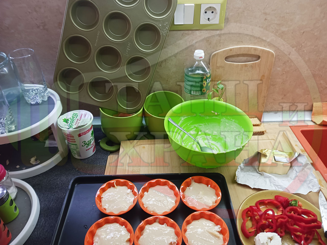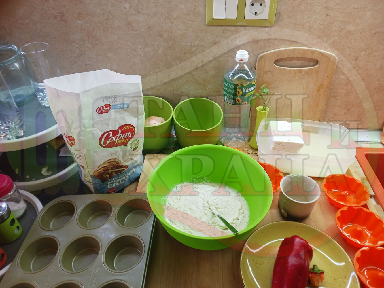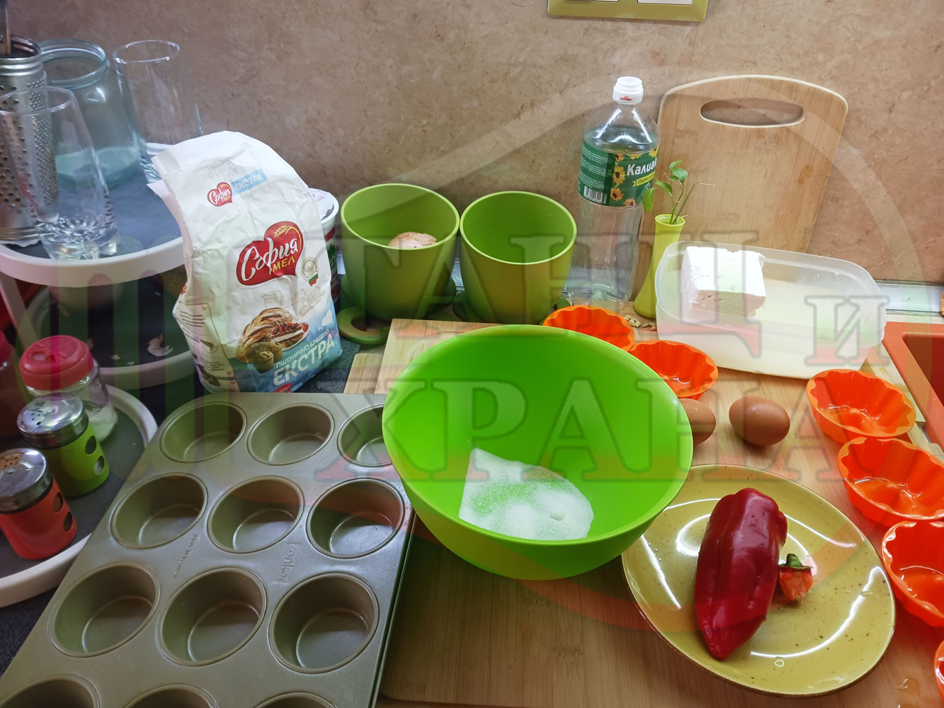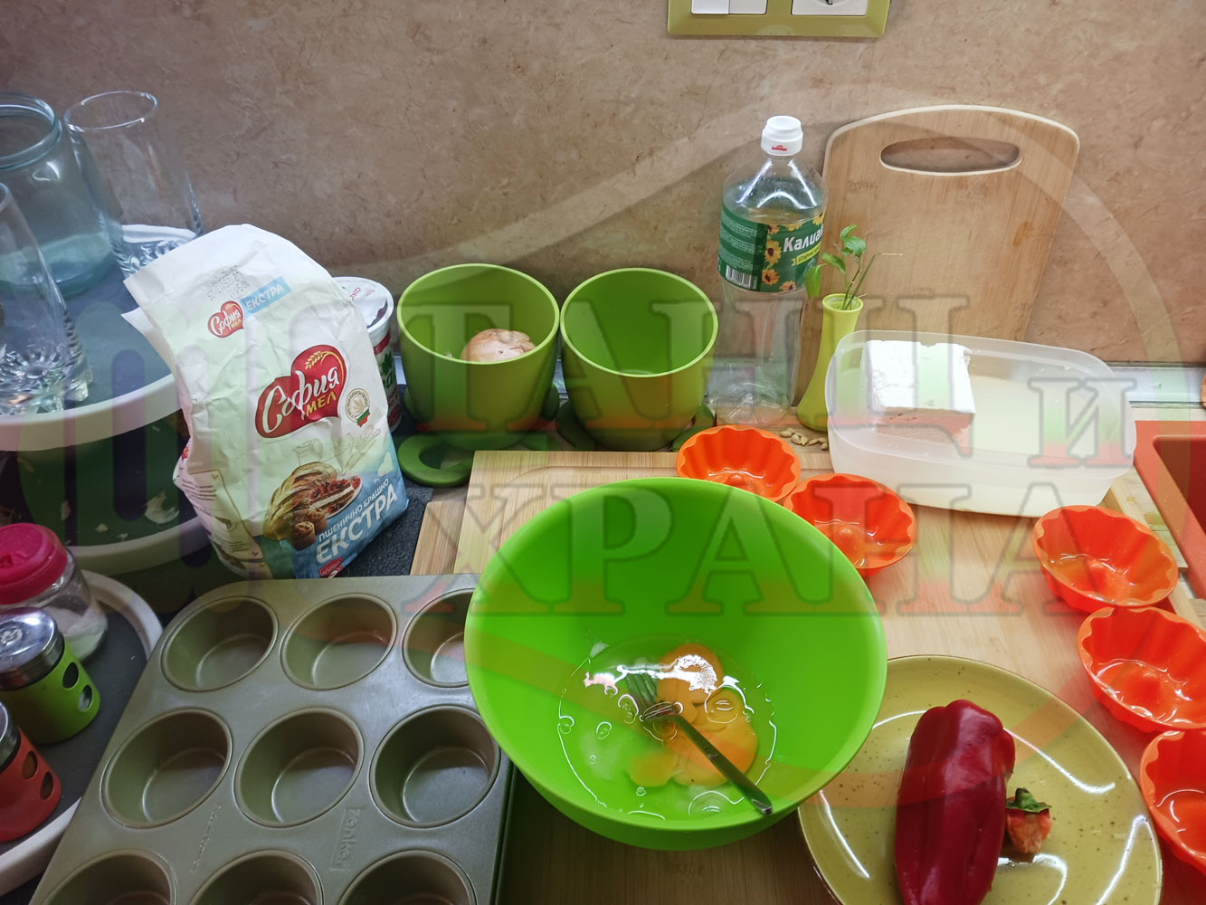 ПРОДУКТИ: Приблизителни количества за малки солени кексчета "Червеночушкови с БГсирене" изпечени на фурна с масло и пълнка от червени пресни чушки и краве бяло сирене (българско, саламурено), поръсени със сладък пипер омесени с прясно краве мляко и яйца