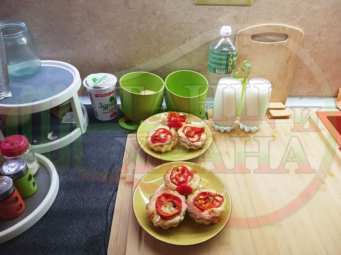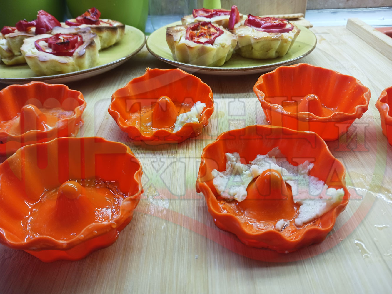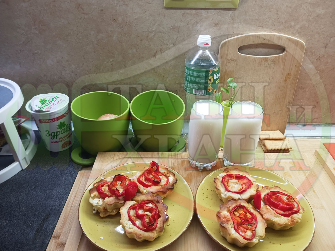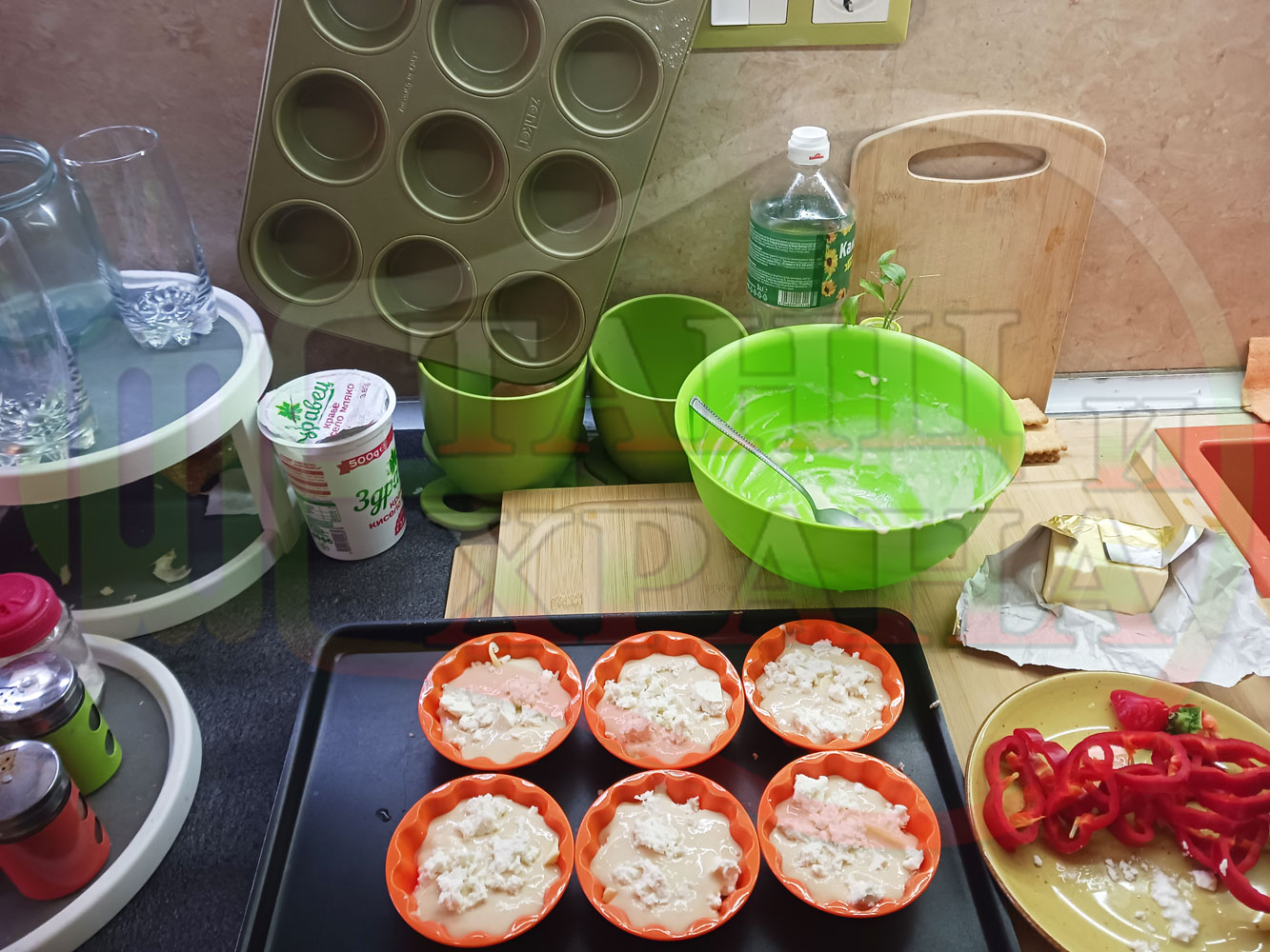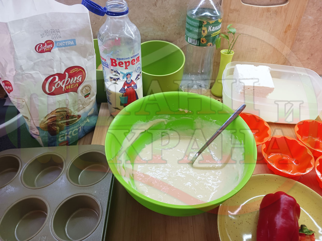ПРОДУКТИ: Приблизителни количества за малки солени кексчета "Червеночушкови с БГсирене" изпечени на фурна с масло и пълнка от червени пресни чушки и краве бяло сирене (българско, саламурено), поръсени със сладък пипер омесени с прясно краве мляко и яйца