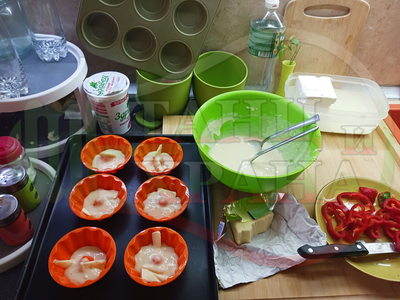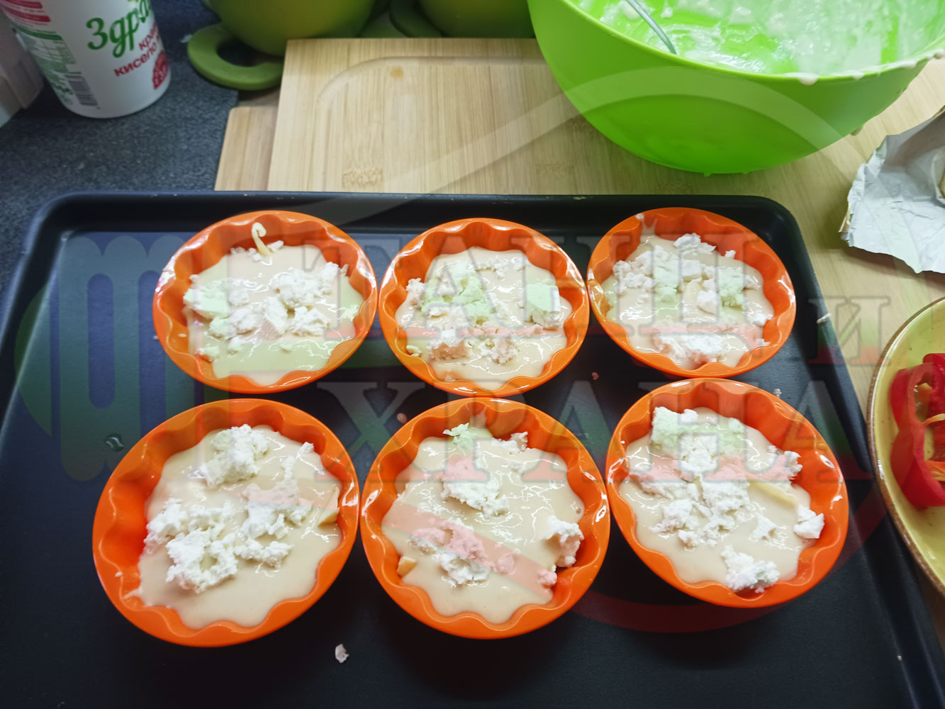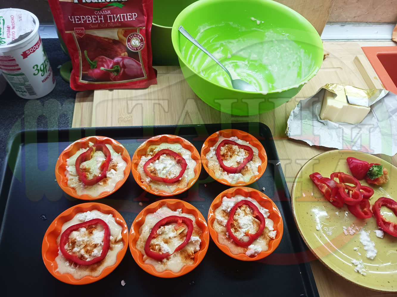 Разпределете част от кравето масло в кексовите формички, сипете малка част от кексовото тесто във всяка формичка и надробете малка част от кравето бяло сирене върху тестото. Покрийте сиренето с втората част от кексовото тестото, надробете втората част от сиренето и поръсете с червения сладък пипер. Измийте чушката, почистете я от семките чрез т.нар. "изтърбушване", нарежете я на "обръчи" и поставете по 1 или няколко чушкови обръча в кексовите форми. Притиснете обръчите съвсем леко и поставете парченца масло върху чушковите обръчи. Подредете кексовите форми в тънка тава и поставете тавата в предварително загрятата фурна (загрейте я за поне 5 минути). Запечете на фурна без вентилатор на 180 градуса за около 45 минути (винаги поставяйте различните кексови малки формички или форми с отварящи се дъна за печене на торти и др. върху плоска, тънка тава за печене на курабии с цел предпазване на фурната от изтичащи и преливащи сокове извън формите).