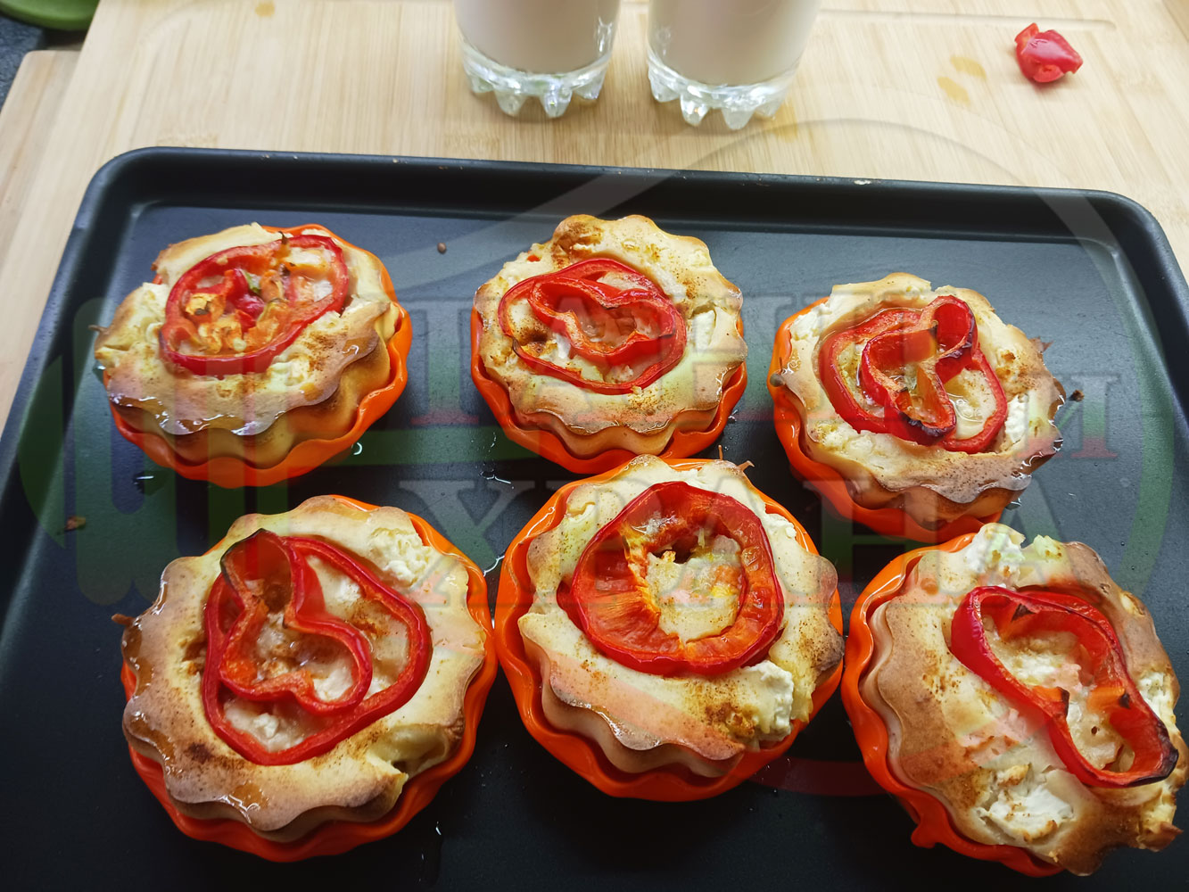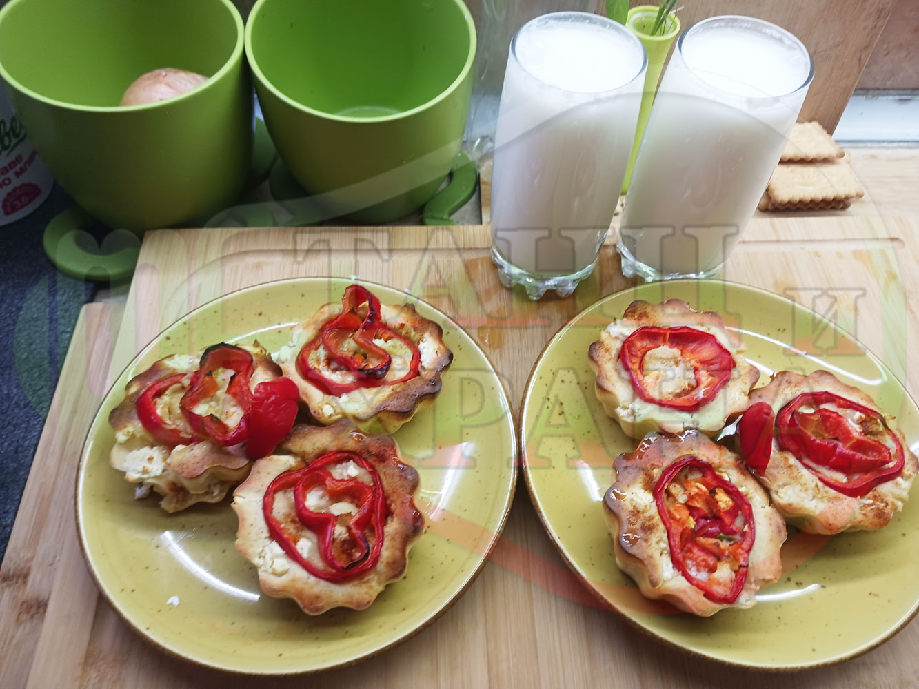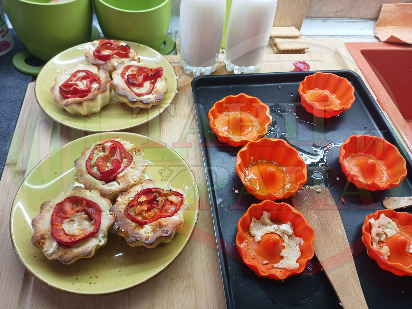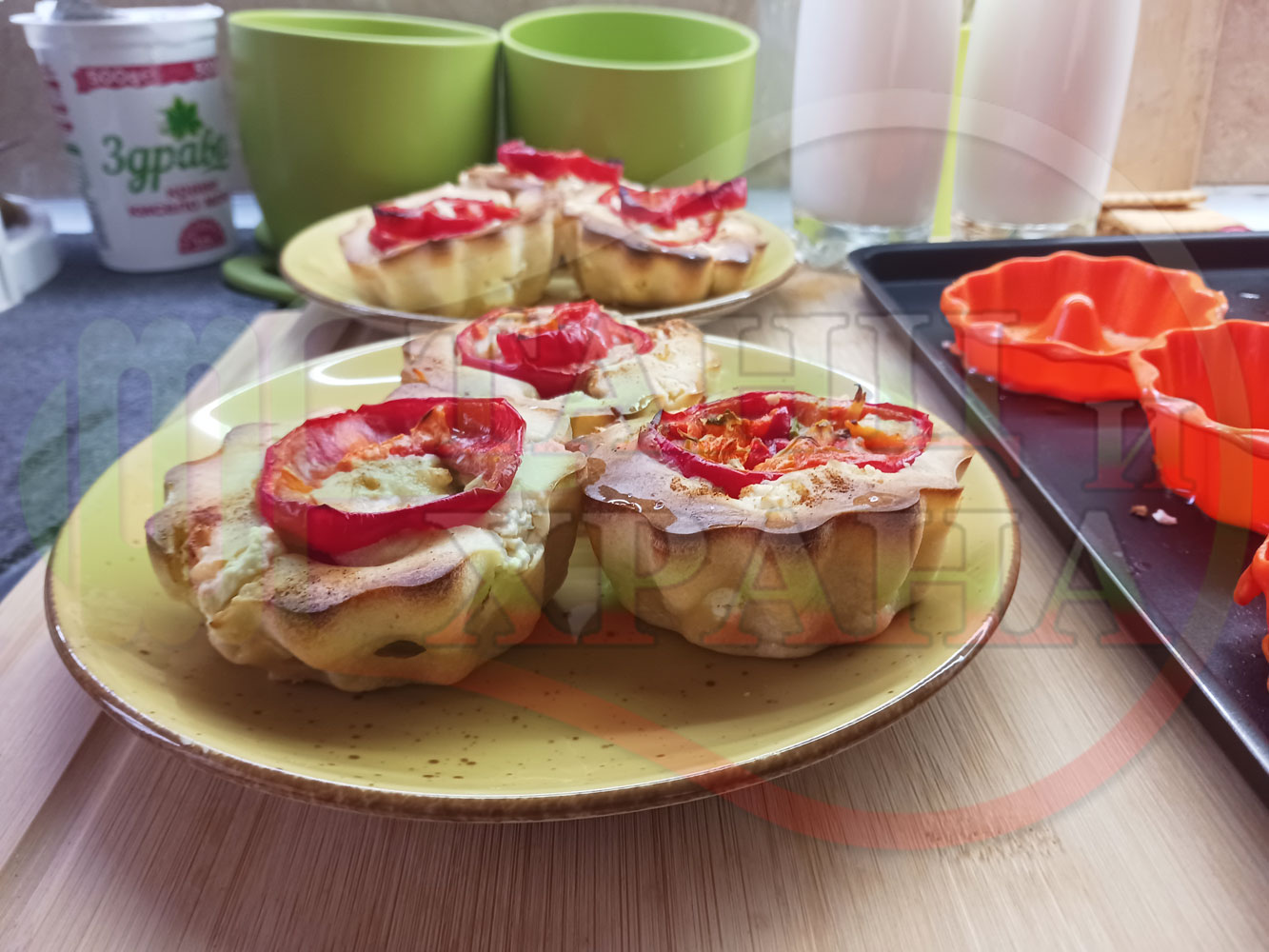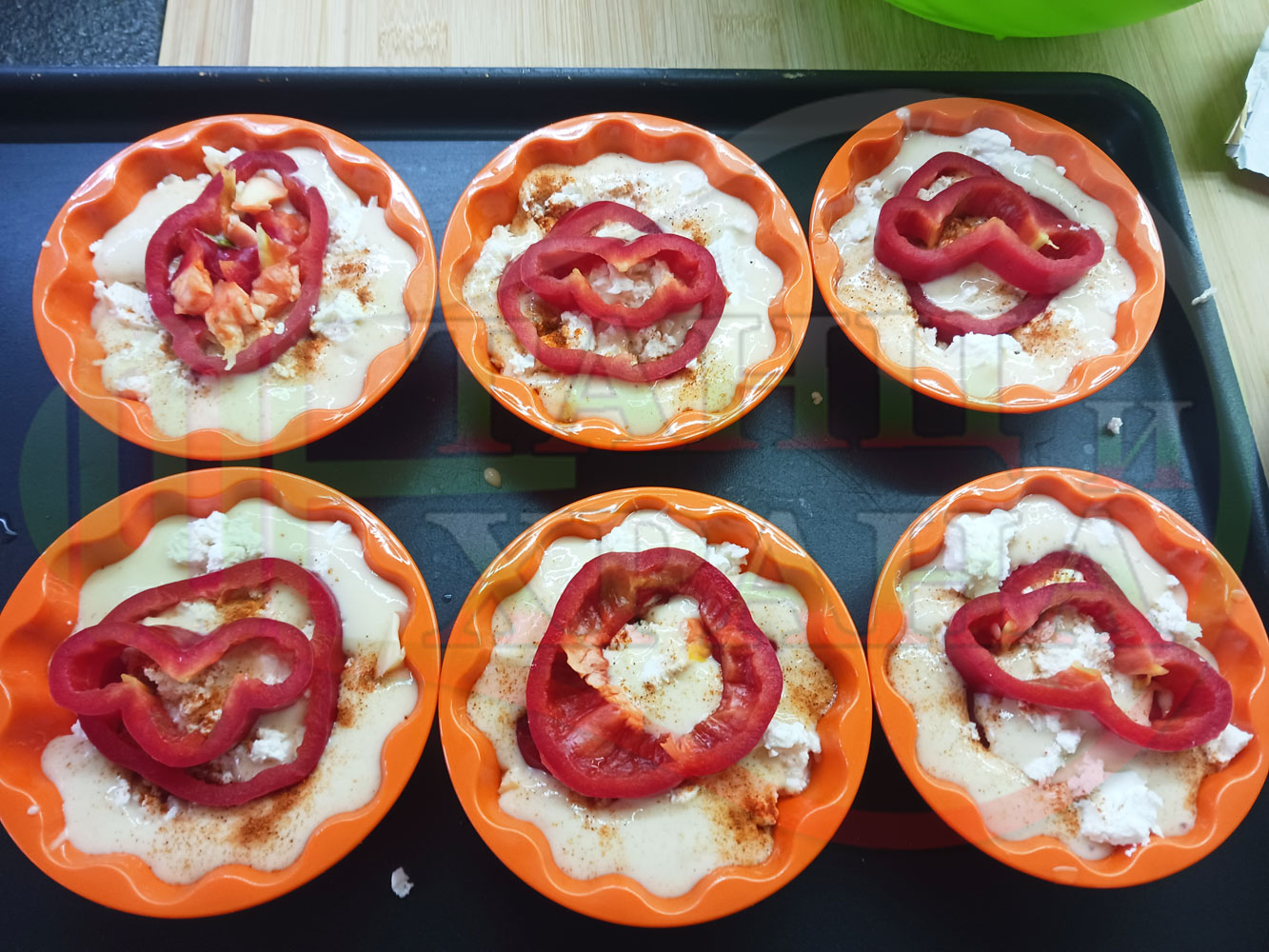 Малки солени кексчета "Червеночушкови с БГсирене" изпечени на фурна с масло и пълнка от червени пресни чушки и краве бяло сирене (българско, саламурено), поръсени със сладък пипер омесени с прясно краве мляко и яйца
