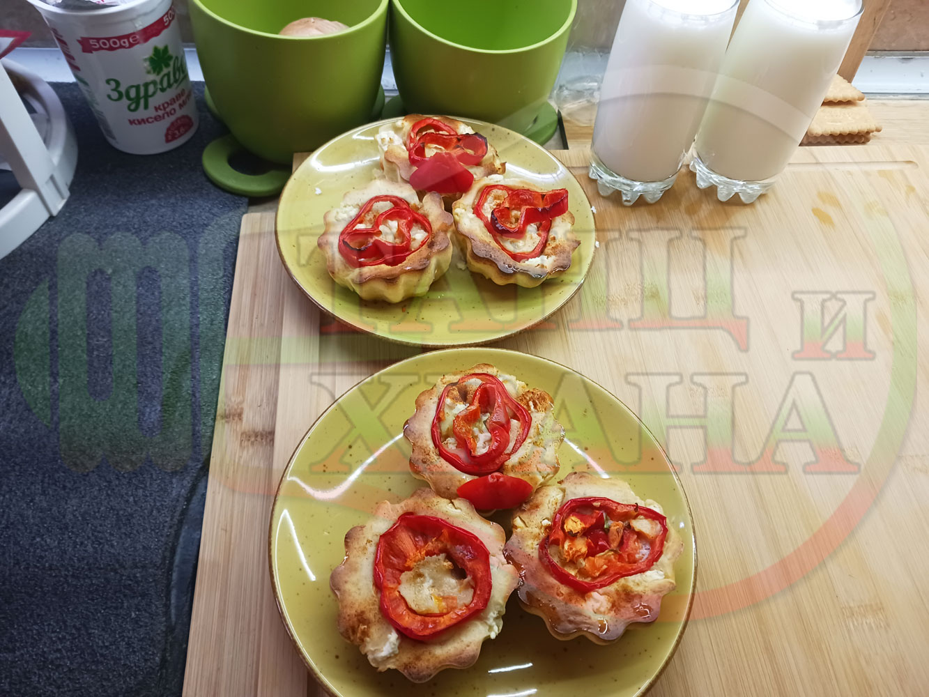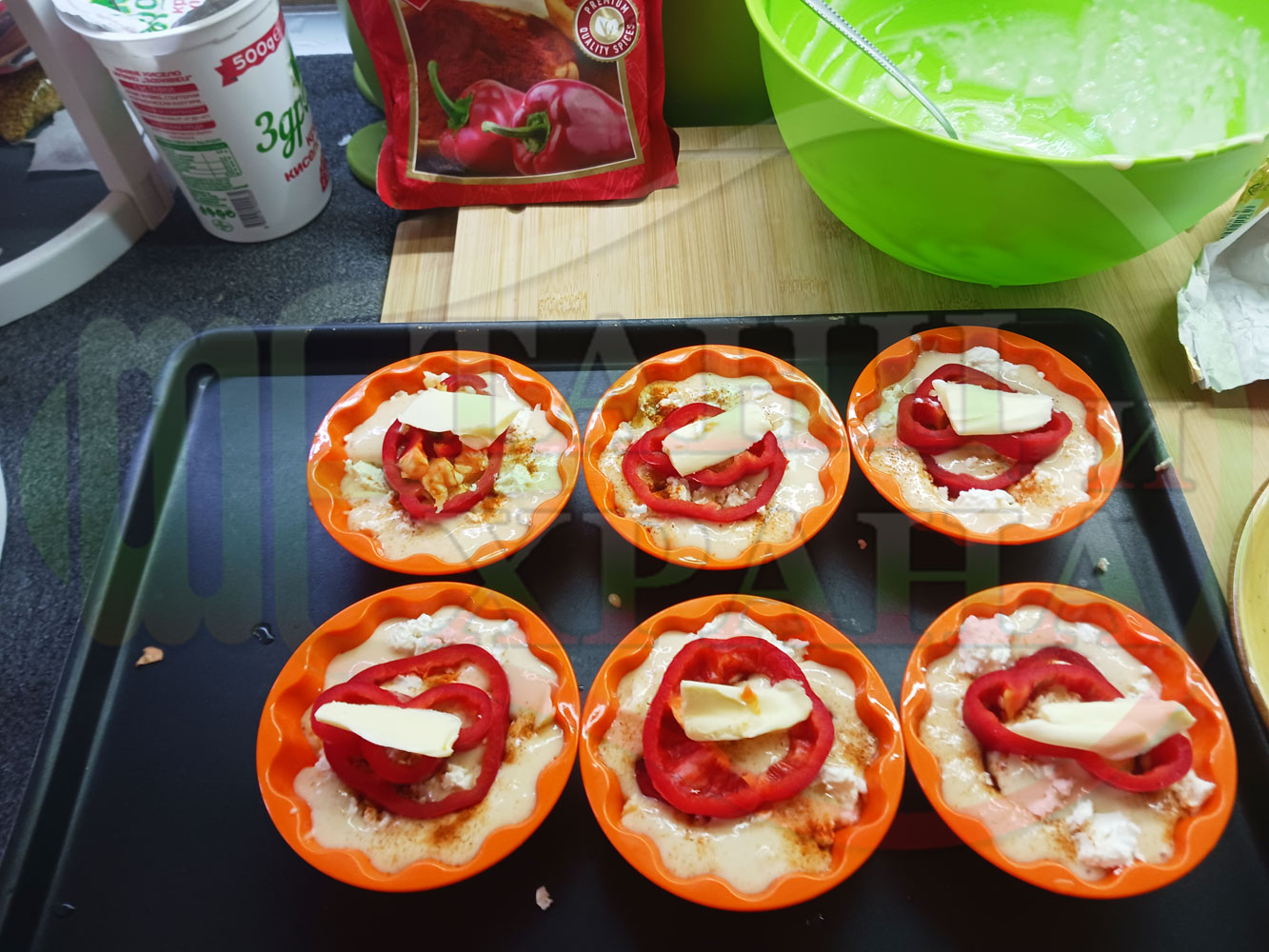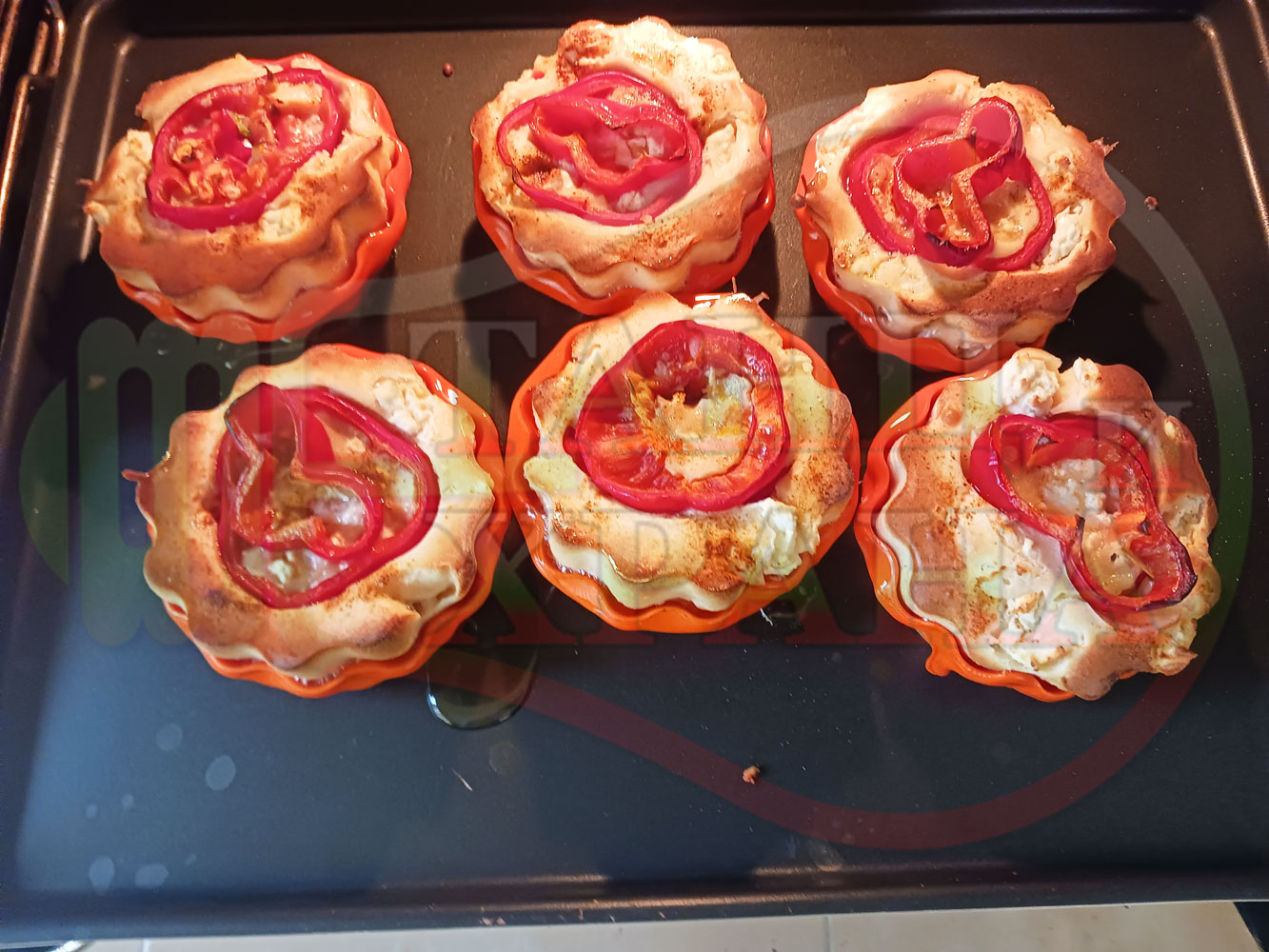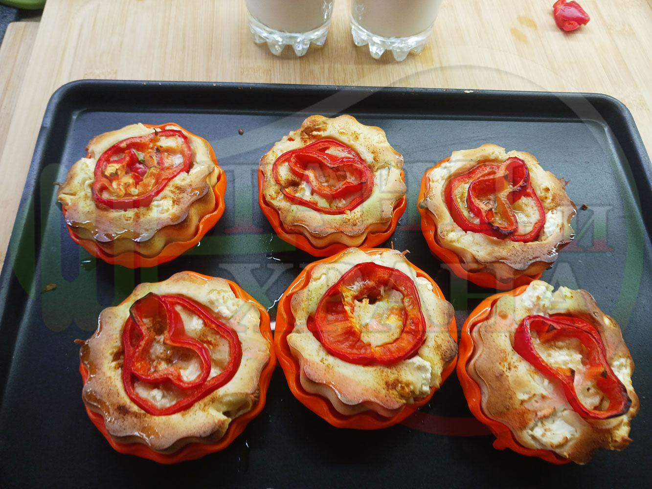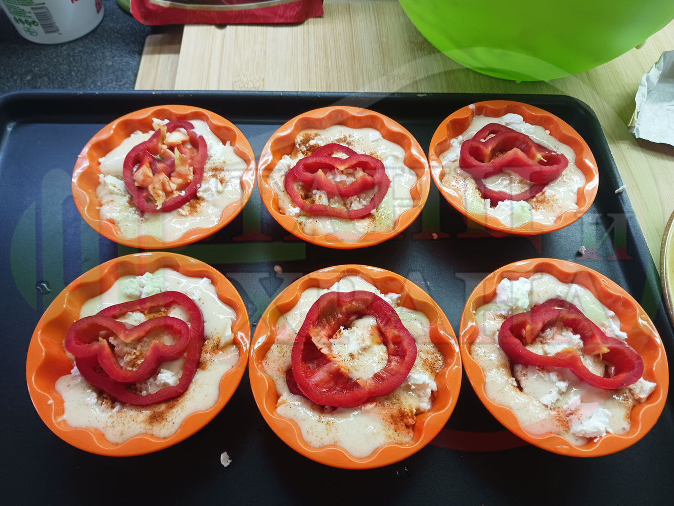 Малки солени кексчета "Червеночушкови с БГсирене" изпечени на фурна с масло и пълнка от червени пресни чушки и краве бяло сирене (българско, саламурено), поръсени със сладък пипер омесени с прясно краве мляко и яйца