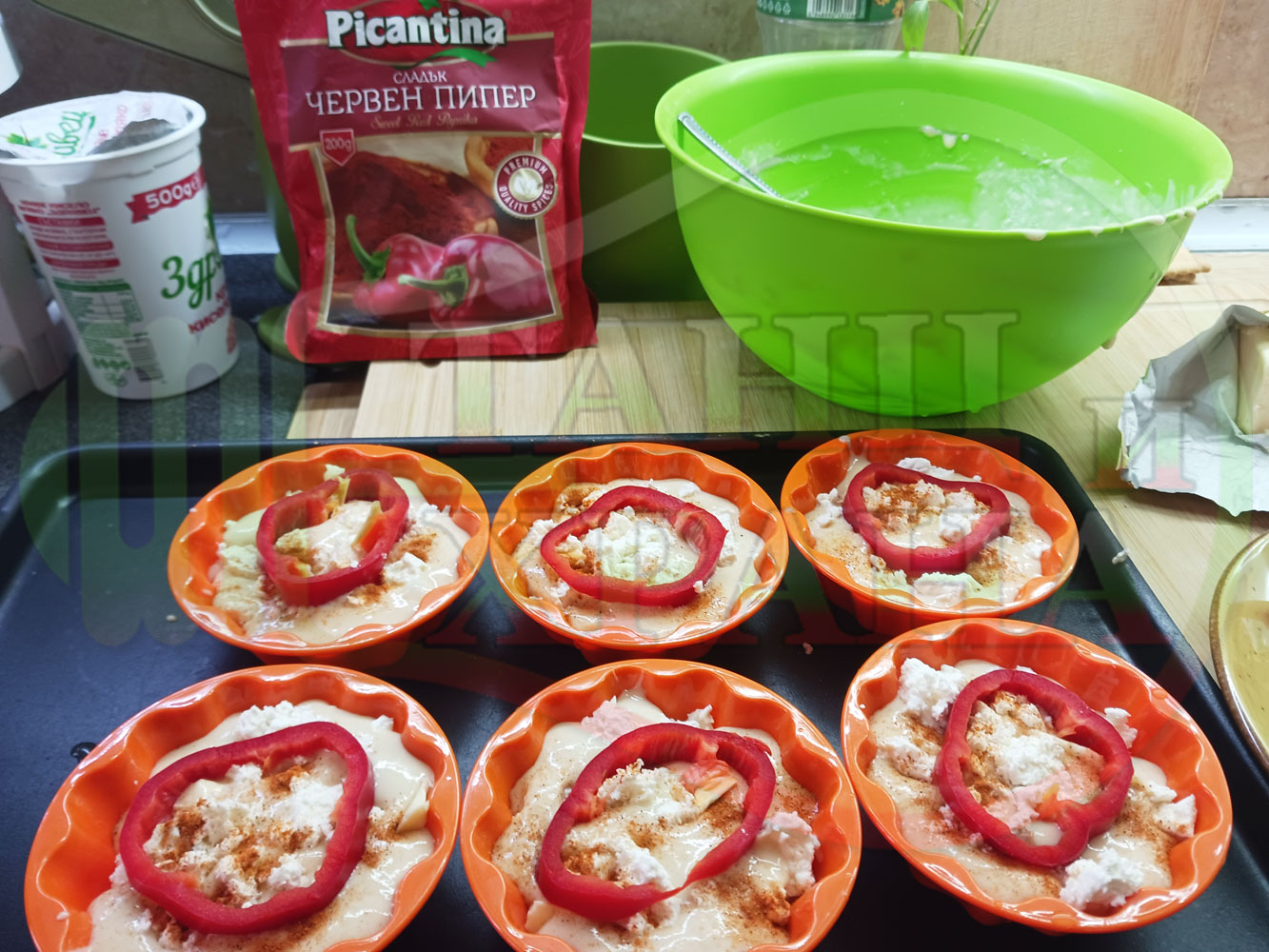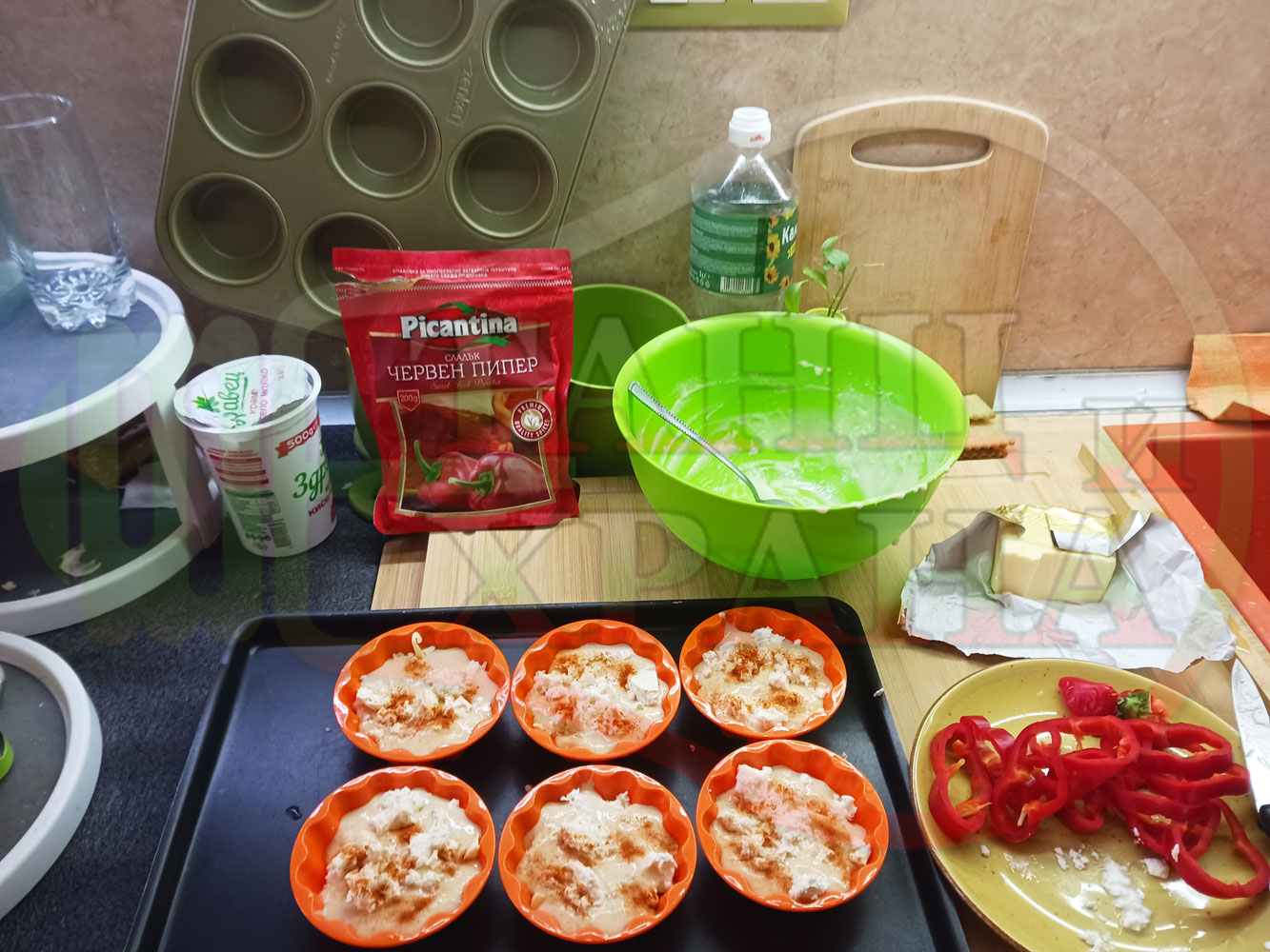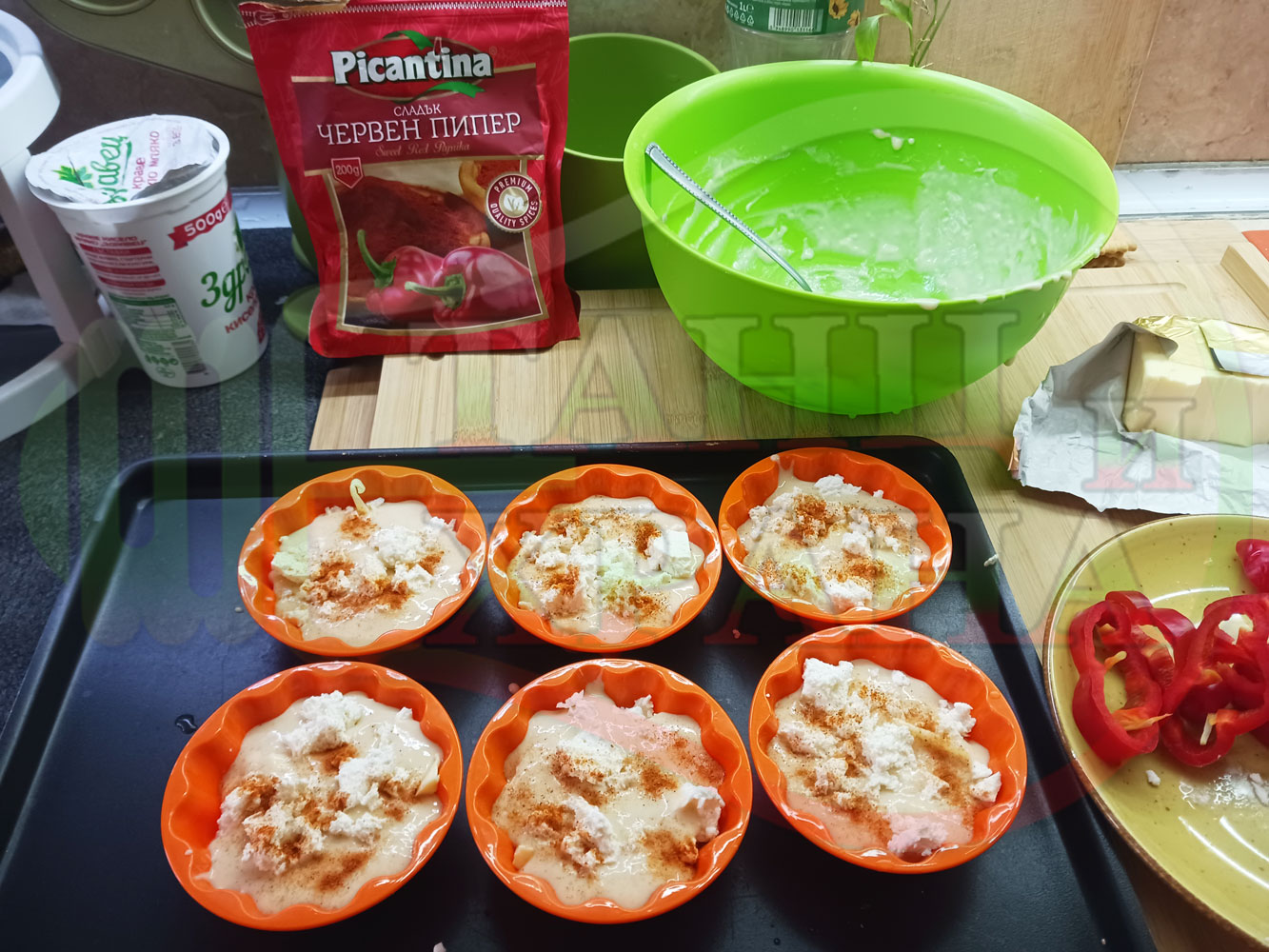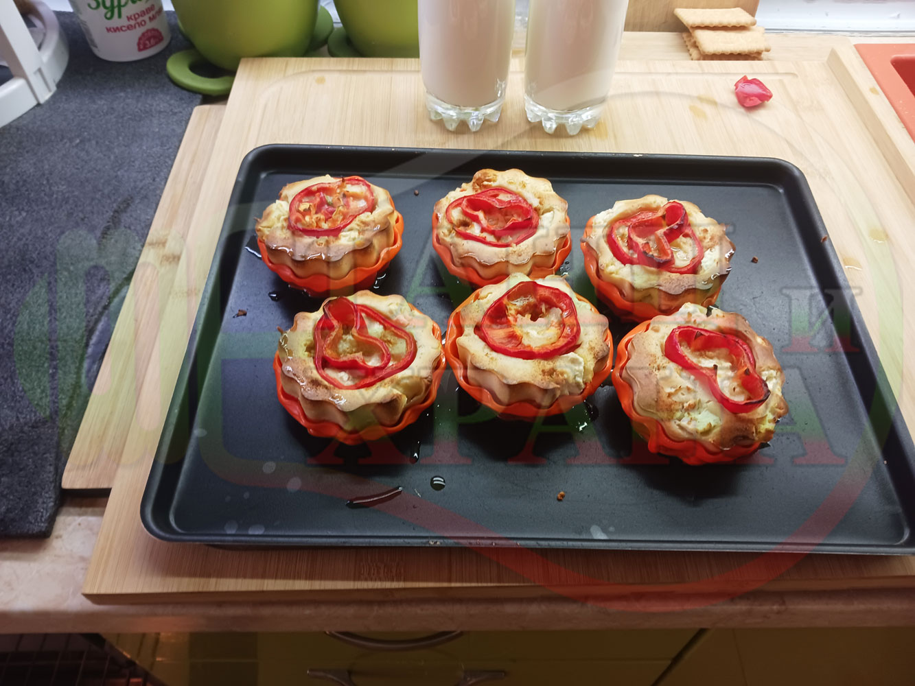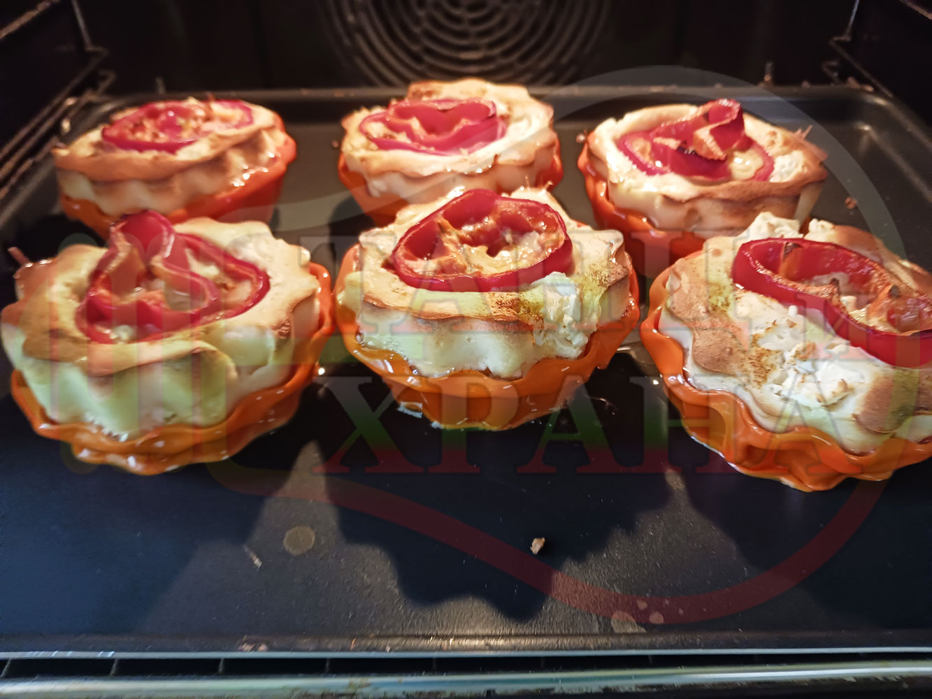 Малки солени кексчета "Червеночушкови с БГсирене" изпечени на фурна с масло и пълнка от червени пресни чушки и краве бяло сирене (българско, саламурено), поръсени със сладък пипер омесени с прясно краве мляко и яйца
