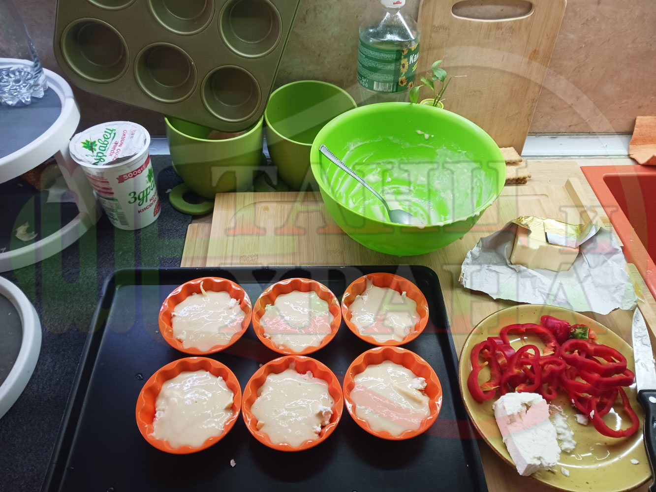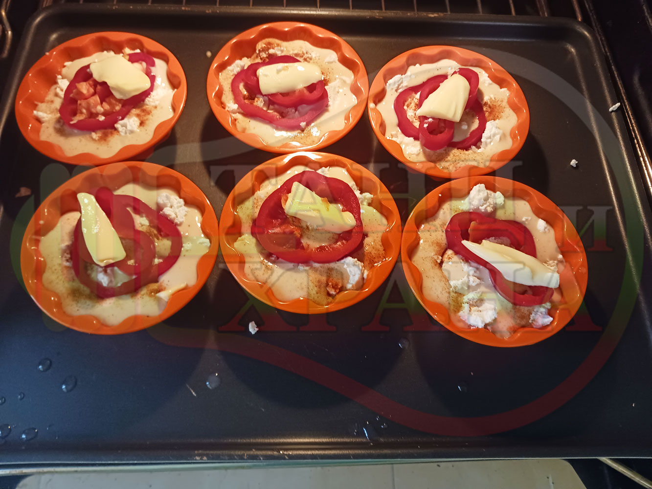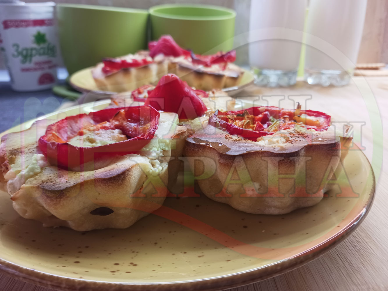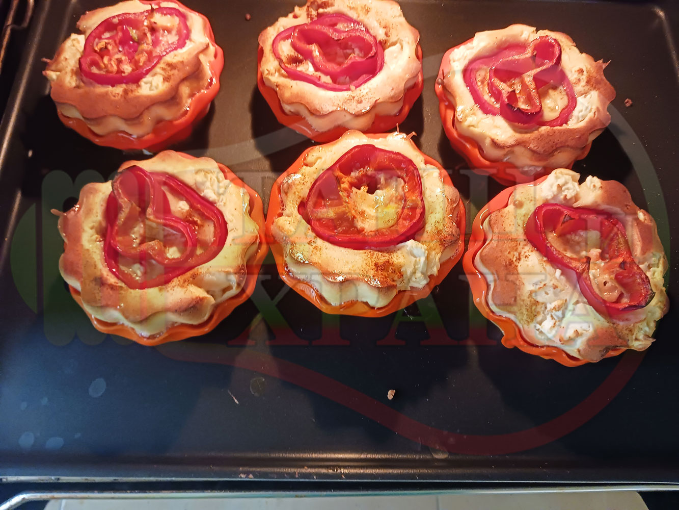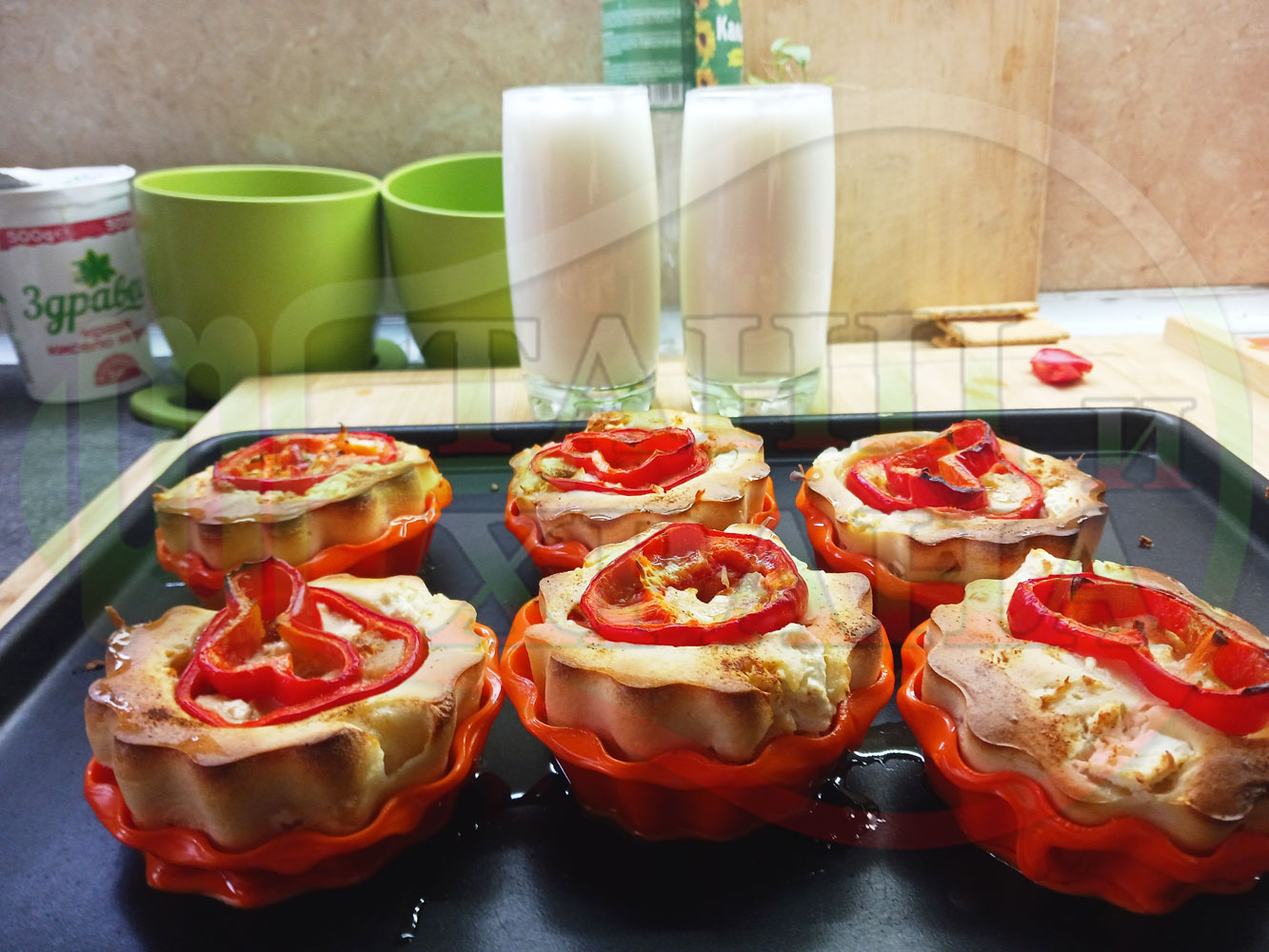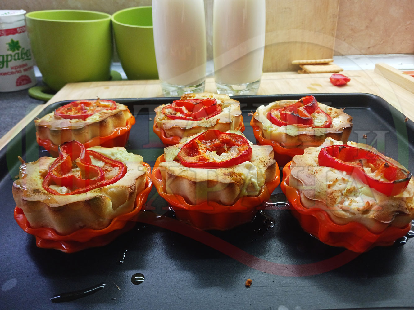 Малки солени кексчета "Червеночушкови с БГсирене" изпечени на фурна с масло и пълнка от червени пресни чушки и краве бяло сирене (българско, саламурено), поръсени със сладък пипер омесени с прясно краве мляко и яйца