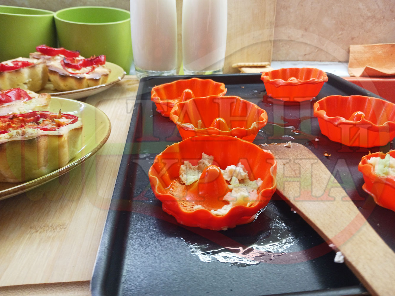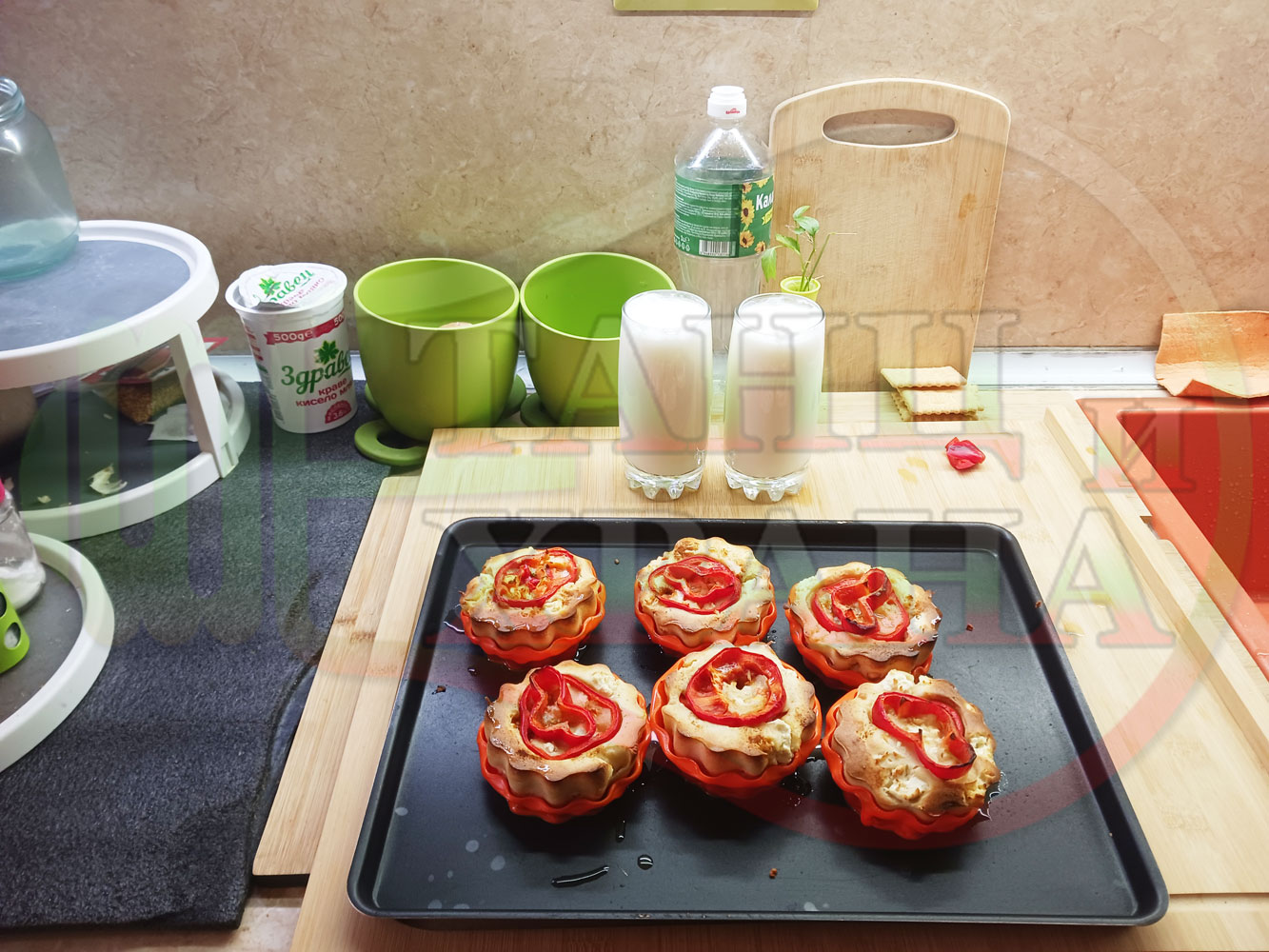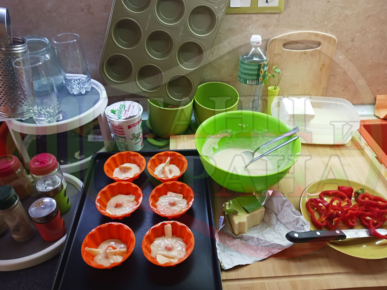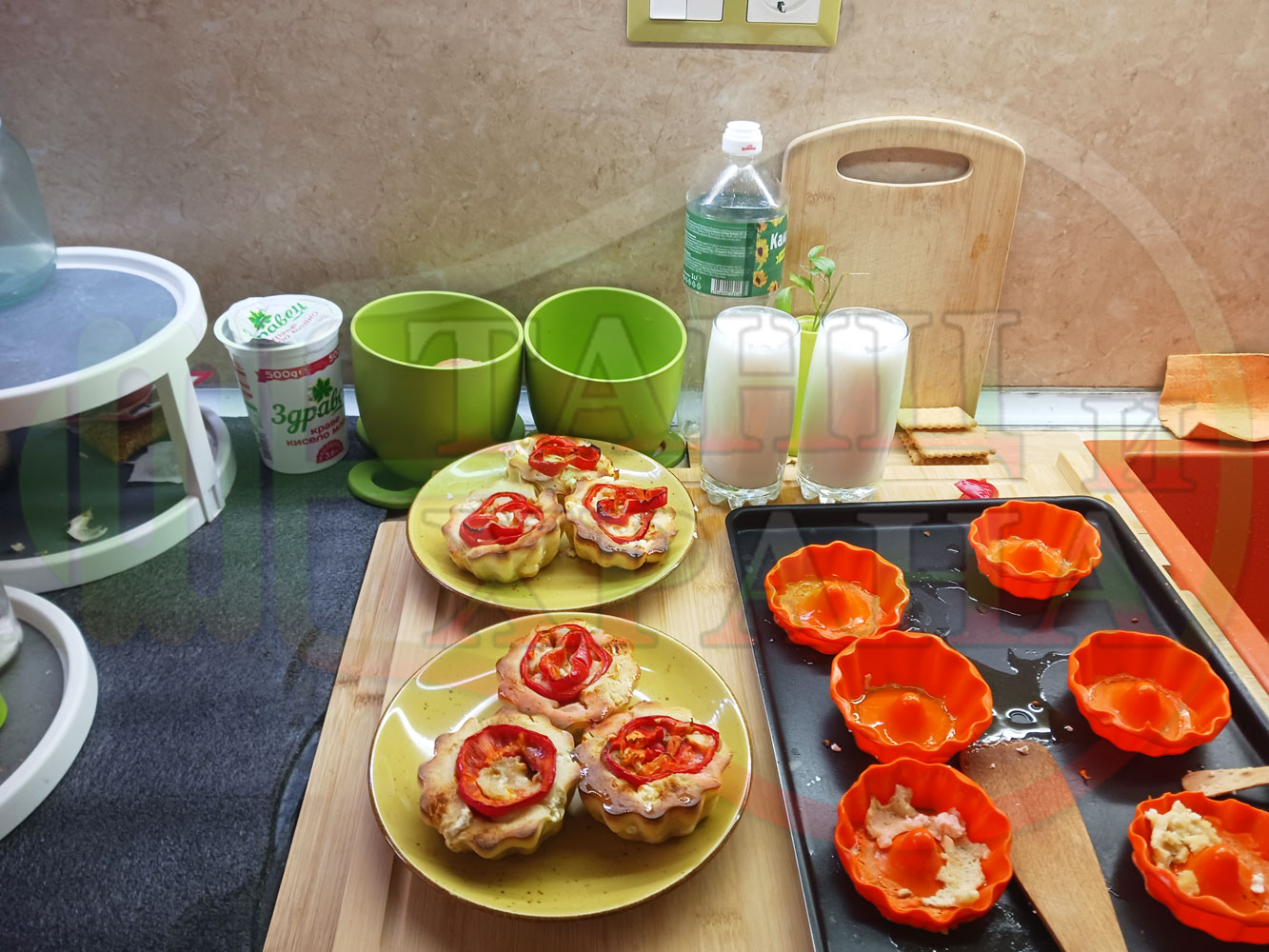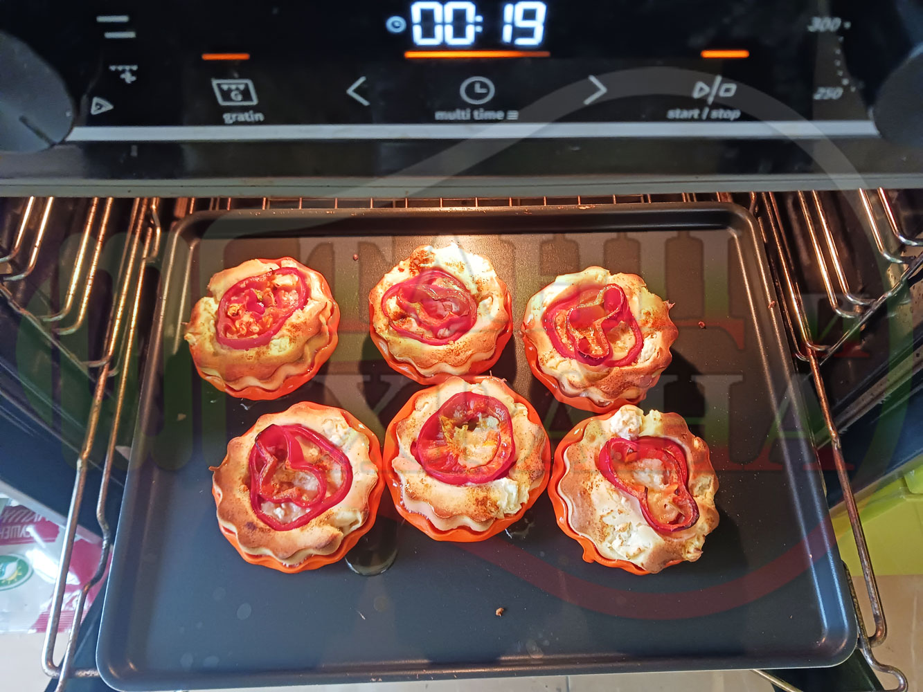 Малки солени кексчета "Червеночушкови с БГсирене" изпечени на фурна с масло и пълнка от червени пресни чушки и краве бяло сирене (българско, саламурено), поръсени със сладък пипер омесени с прясно краве мляко и яйца