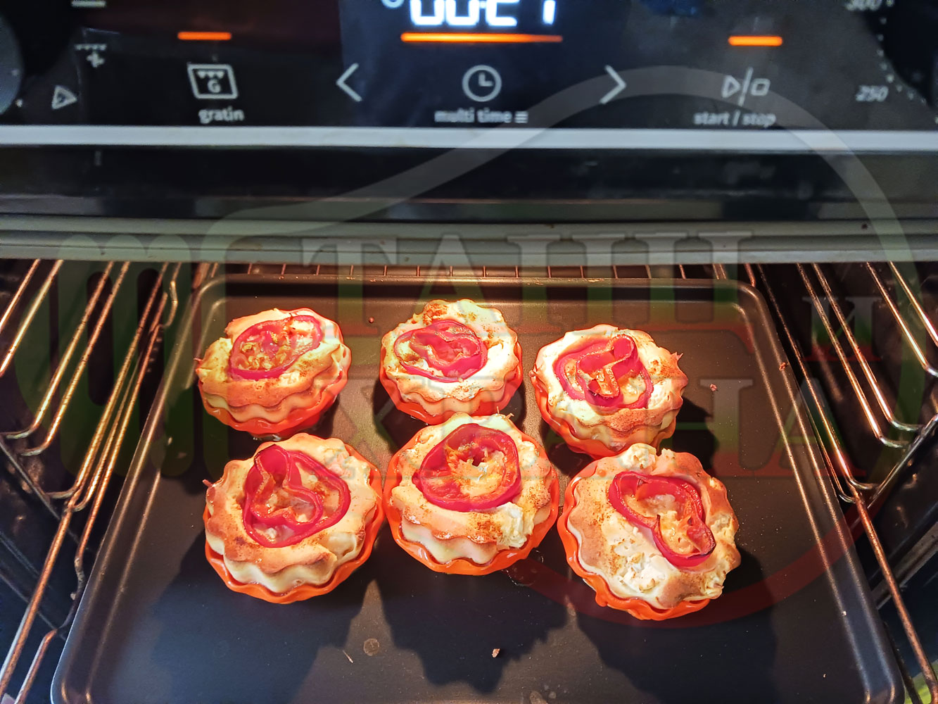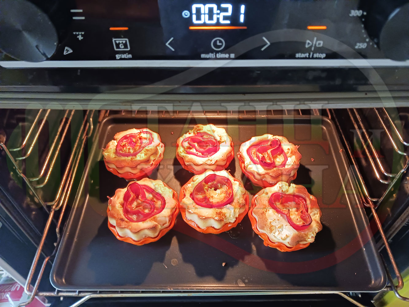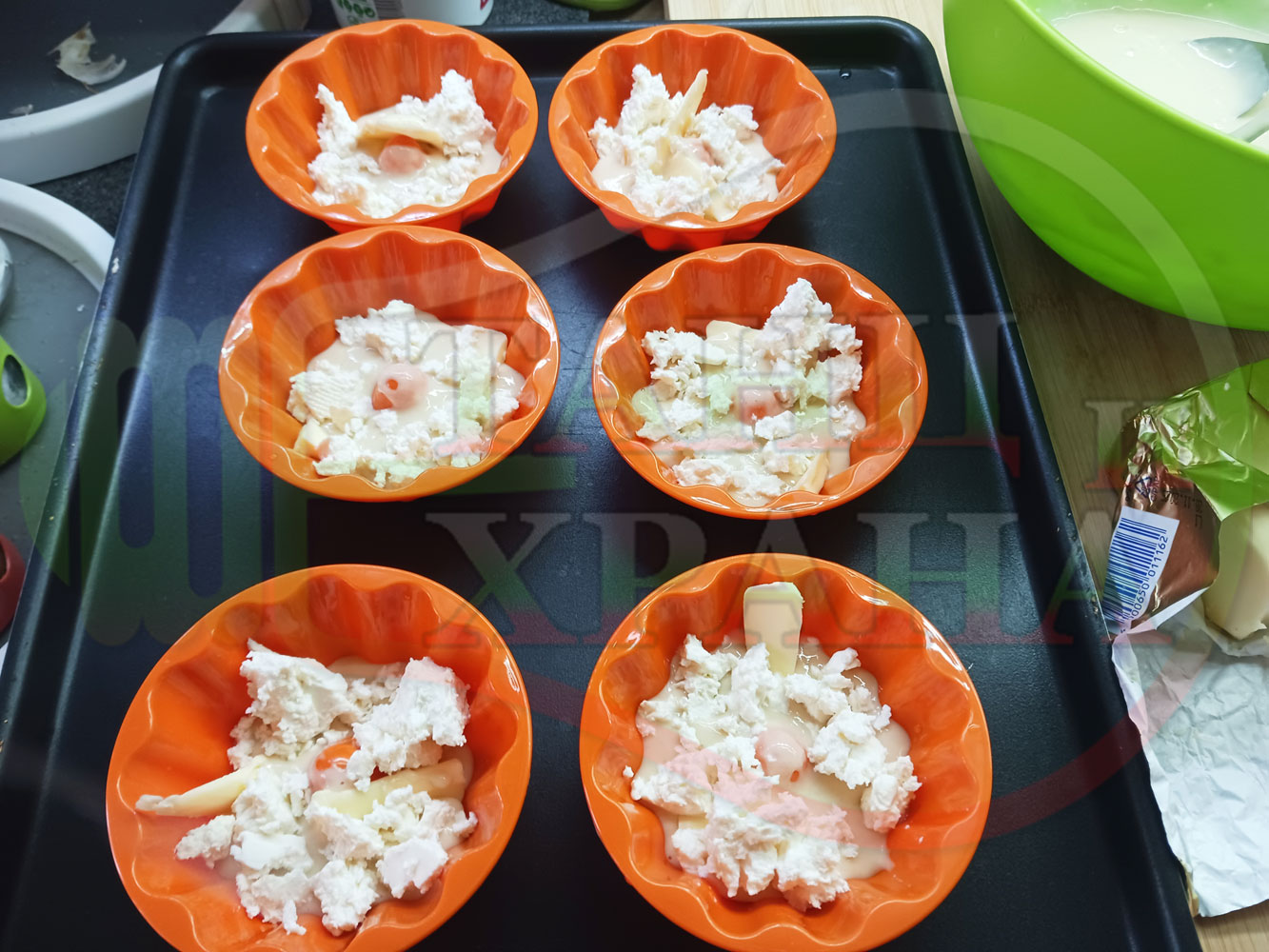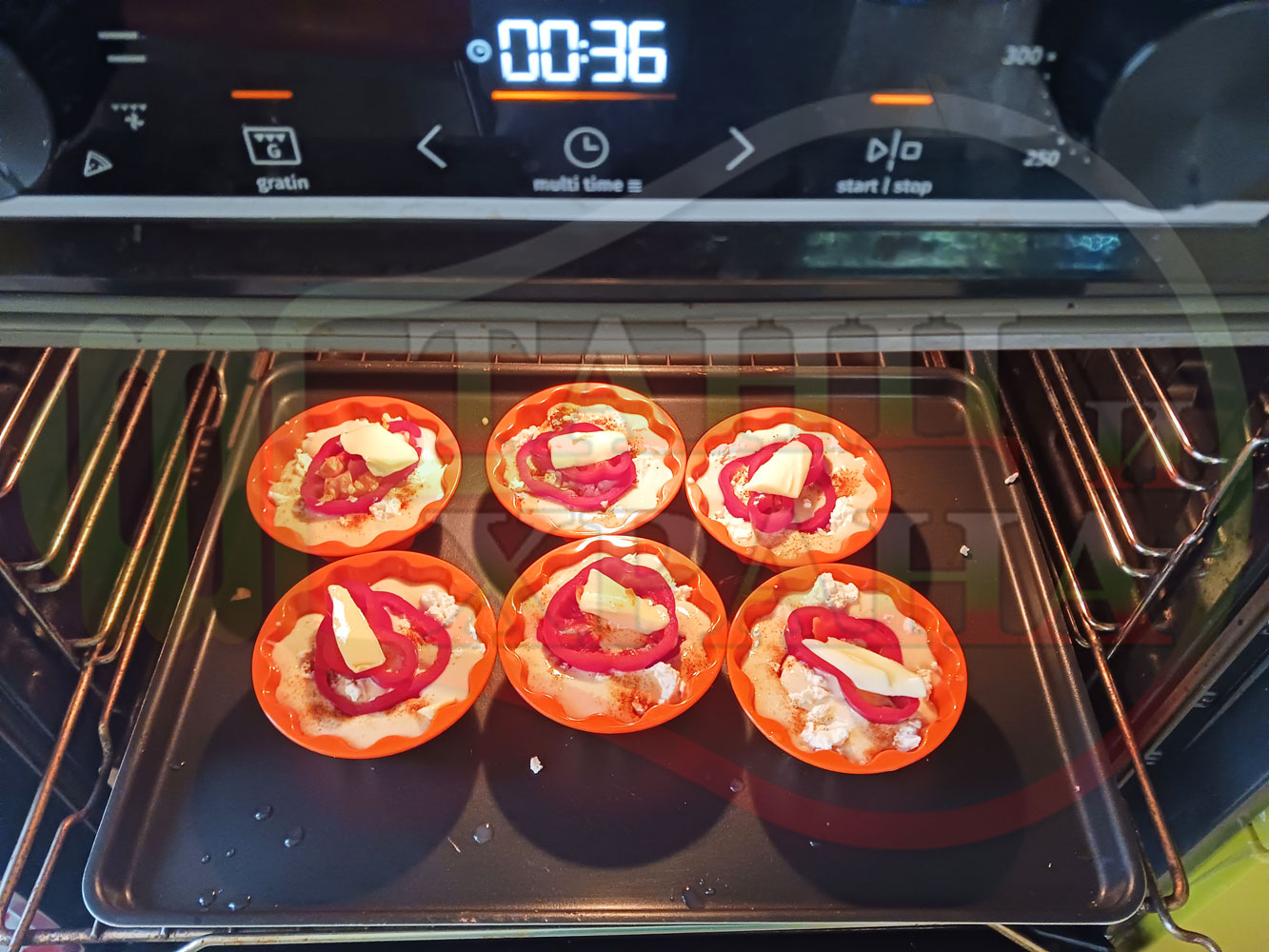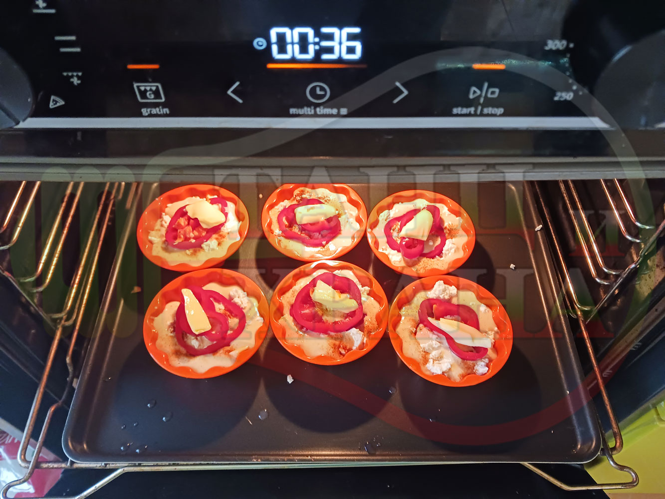 Малки солени кексчета "Червеночушкови с БГсирене" изпечени на фурна с масло и пълнка от червени пресни чушки и краве бяло сирене (българско, саламурено), поръсени със сладък пипер омесени с прясно краве мляко и яйца