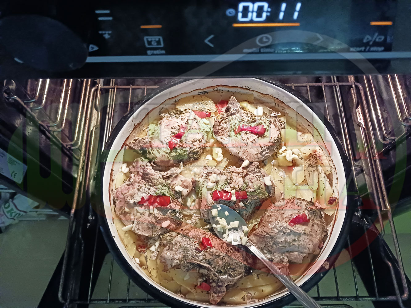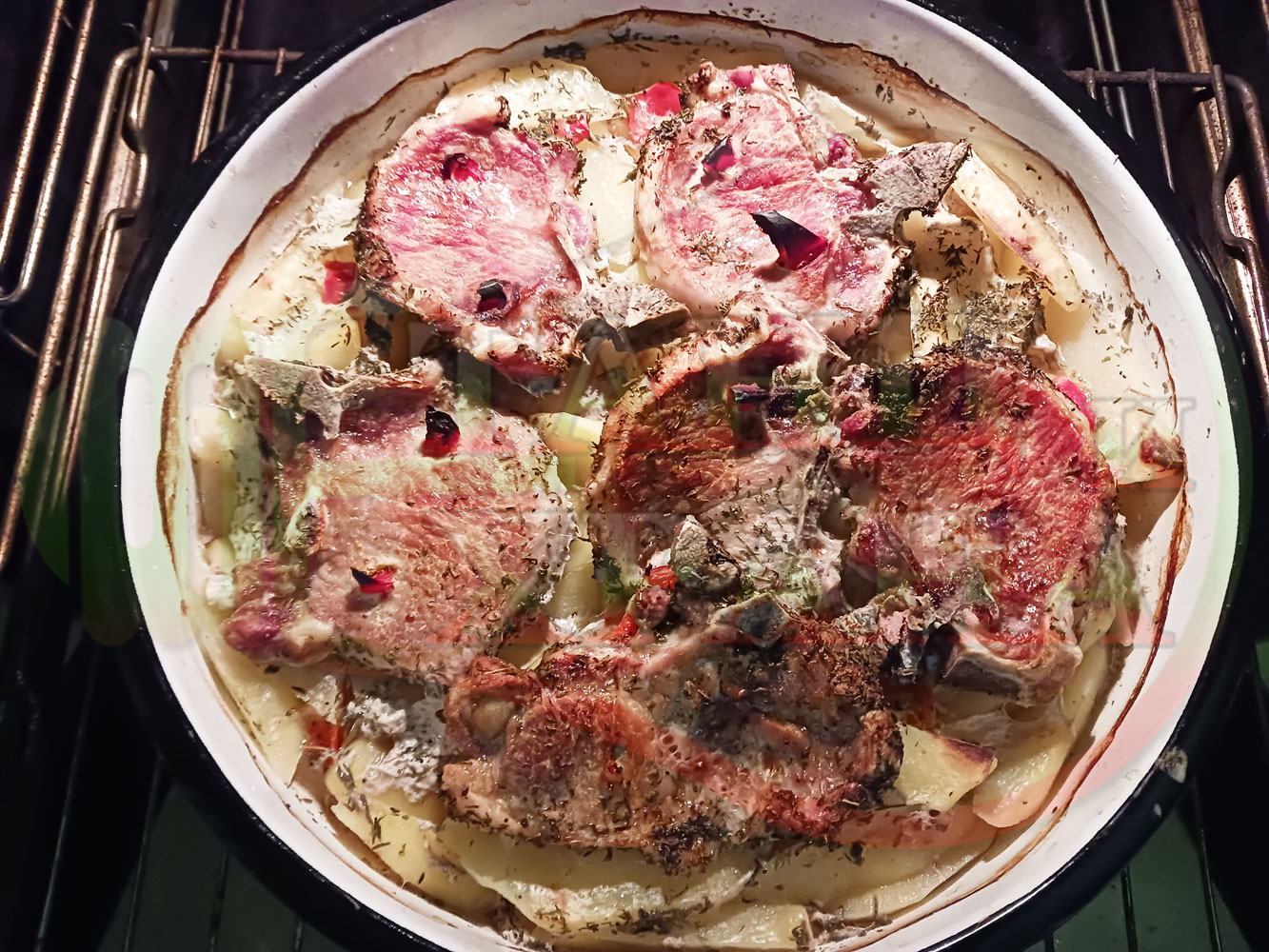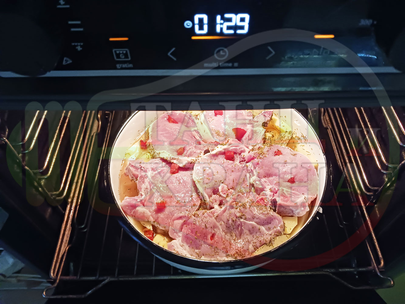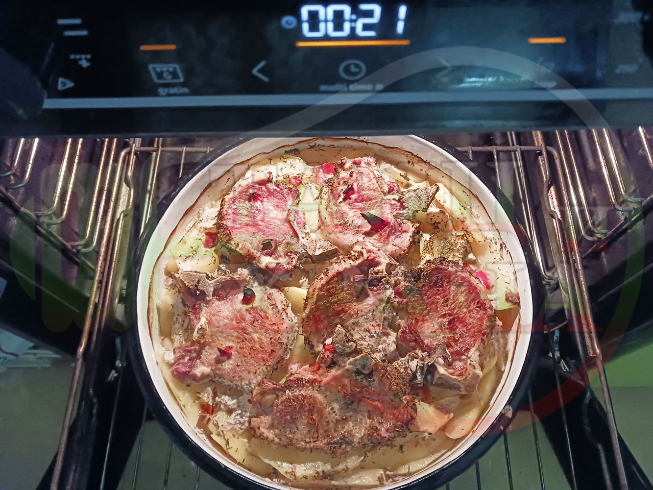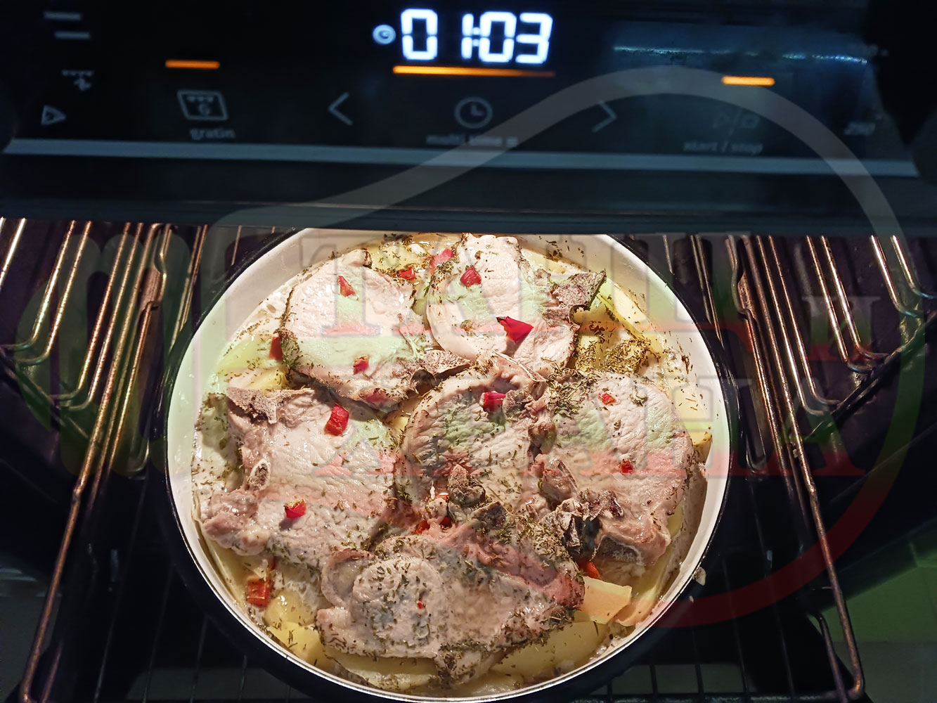 ВНИМАНИЕ: Фурните са различни и съответно времето за сваряване и запичане е ориентировъчно. Наблюдавайте процеса на запичане и при необходимост, покрийте с капак или отстранете тавата от фурната. Разбърквайте картофите от време на време за да се запекат равномерно от всички страни и обърнете пържолите около 15 минути преди края на зададеното време за да се запекат от горната страна. Обливайте често пържолите с образувалия се сос за да запазят сочността си.