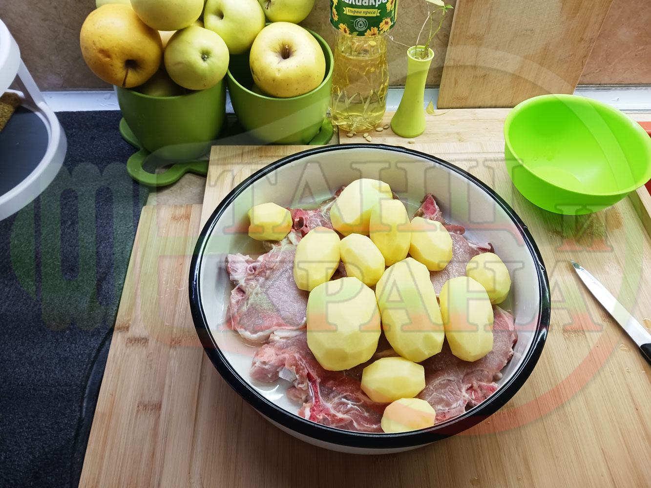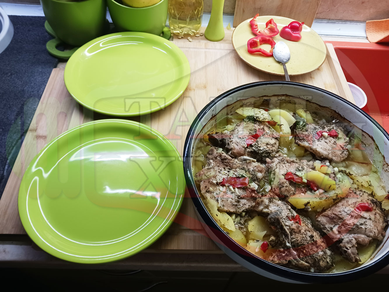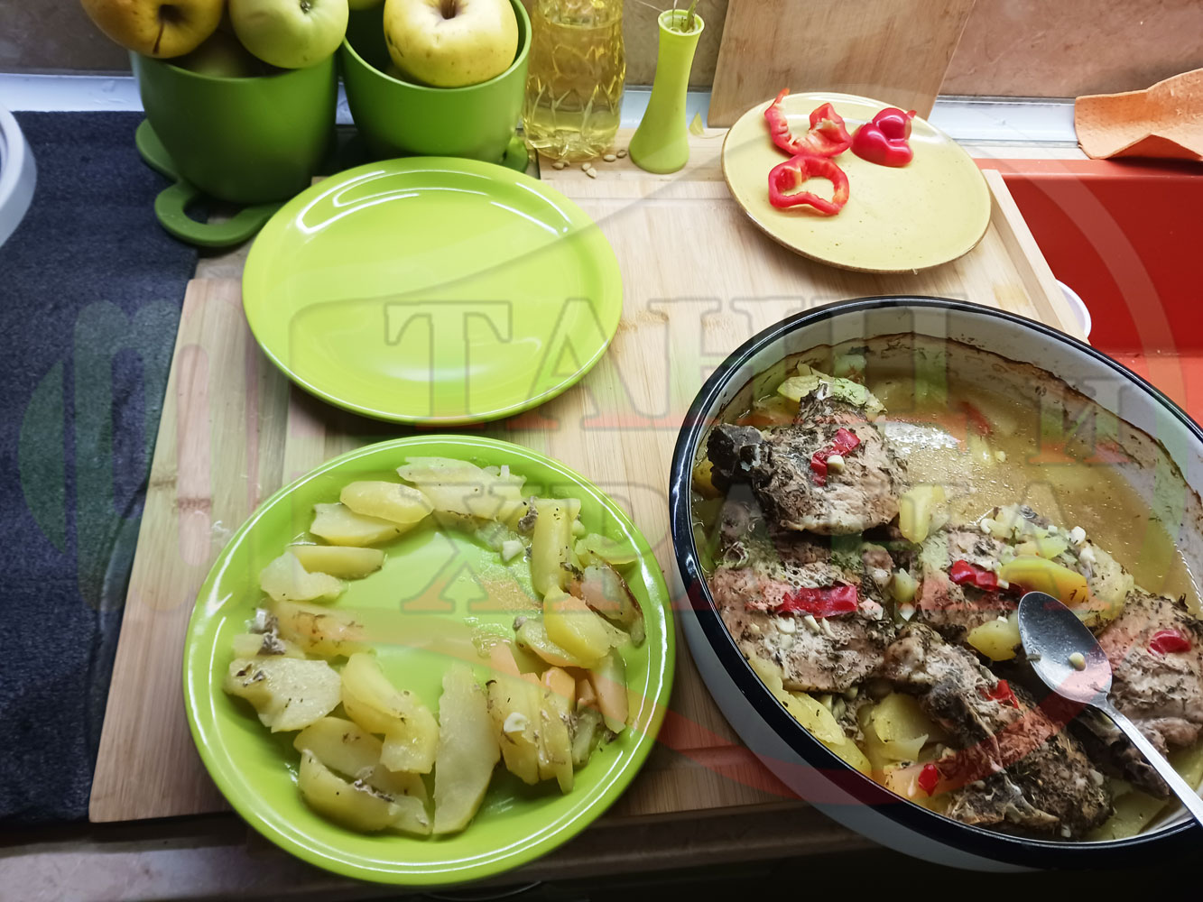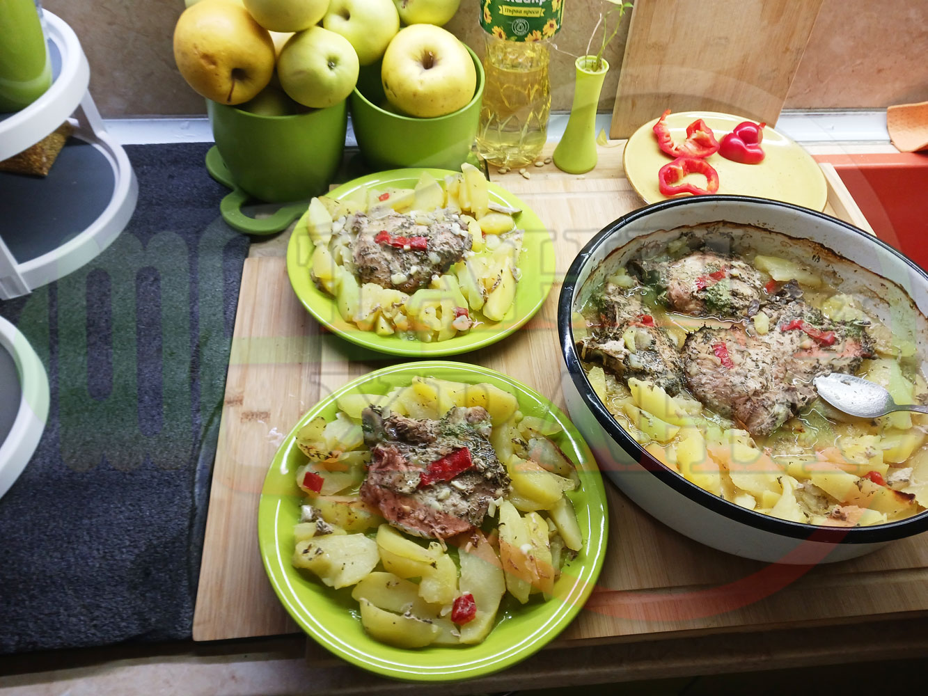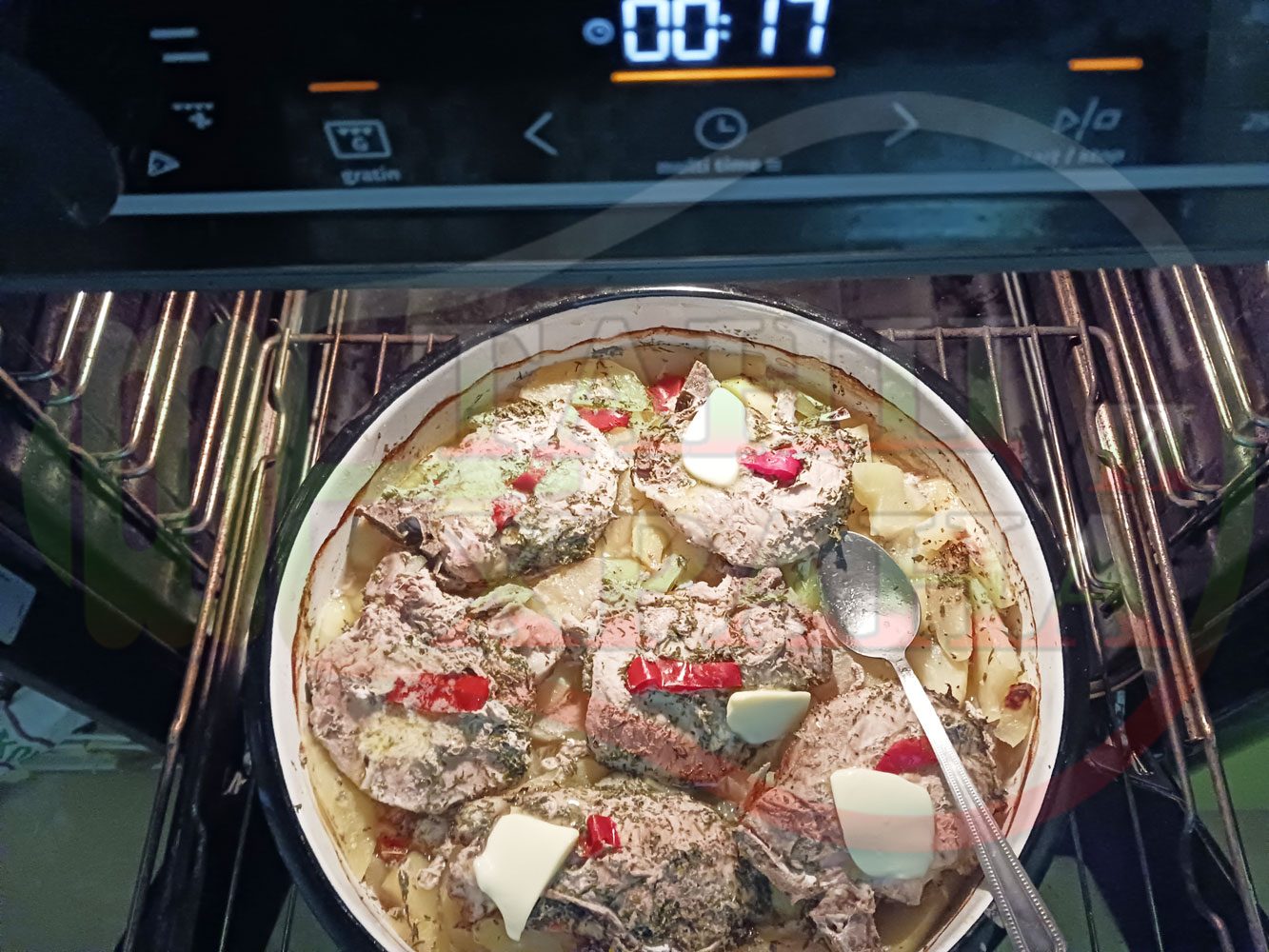 ВНИМАНИЕ: Фурните са различни и съответно времето за сваряване и запичане е ориентировъчно. Наблюдавайте процеса на запичане и при необходимост, покрийте с капак или отстранете тавата от фурната. Разбърквайте картофите от време на време за да се запекат равномерно от всички страни и обърнете пържолите около 15 минути преди края на зададеното време за да се запекат от горната страна. Обливайте често пържолите с образувалия се сос за да запазят сочността си.