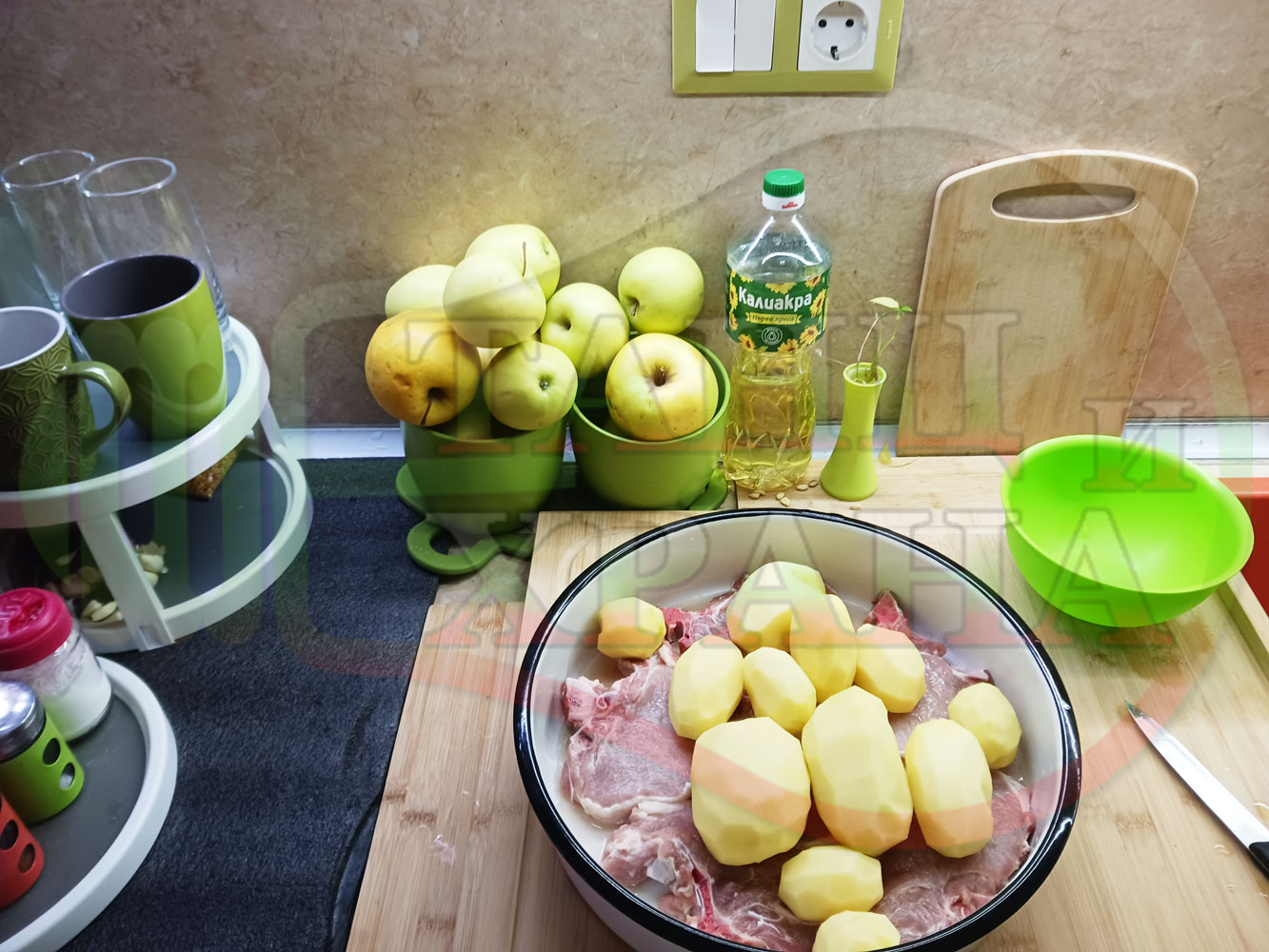 Измийте котлетите с хладка вода и ги подредете в тава за печене. Измийте и обелете картофите, нарежете ги по дължина или на каквито форми искате и ги добавете в тавата.