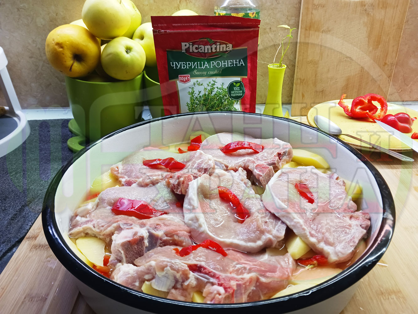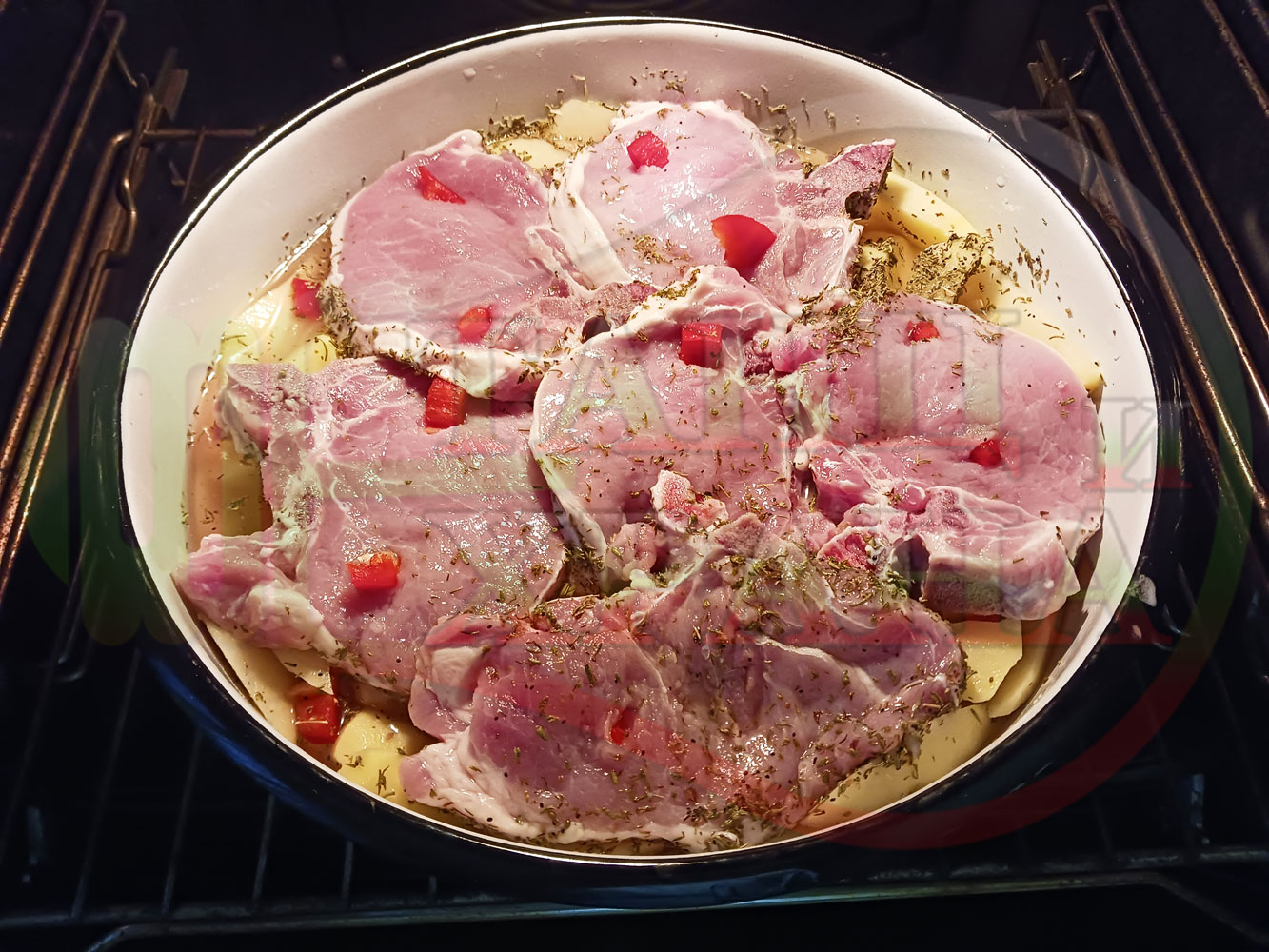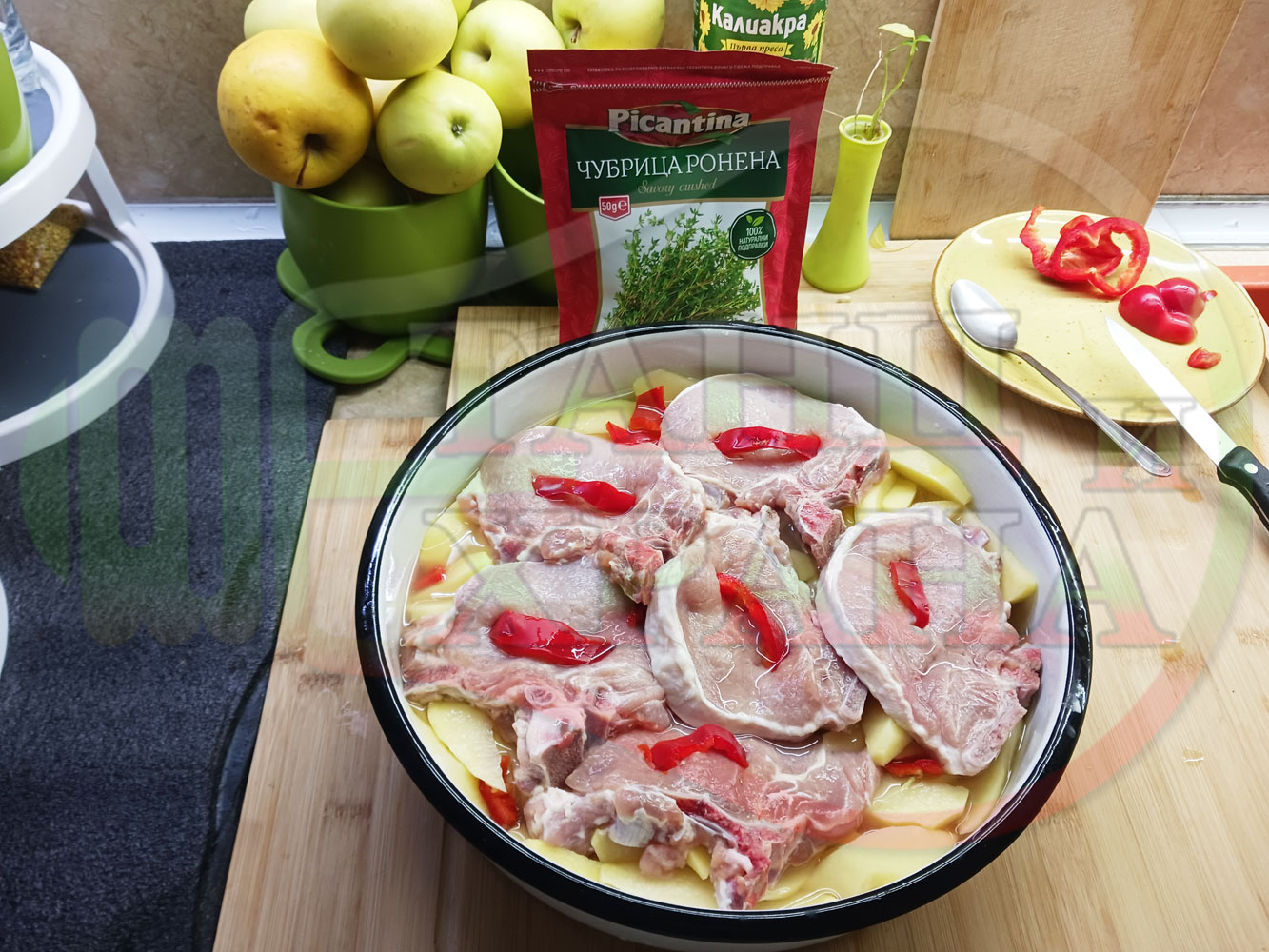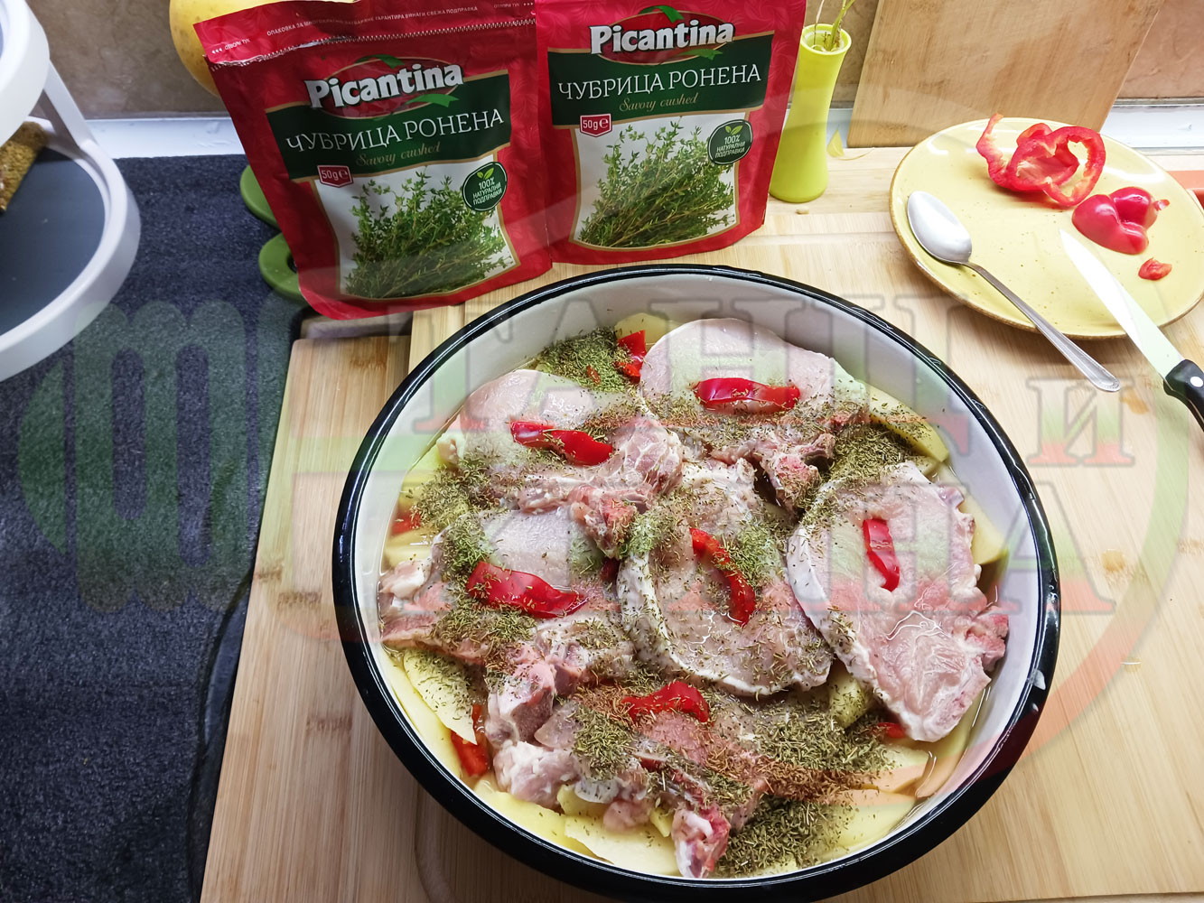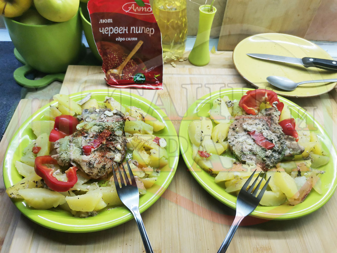 Свински пържоли "Червеночушкови роненочубрицови БГмерудийни картофени" шпиковани с червени пресни чушки запечени на фурна с картофи, ронена чубрица, стар чесън и краве масло