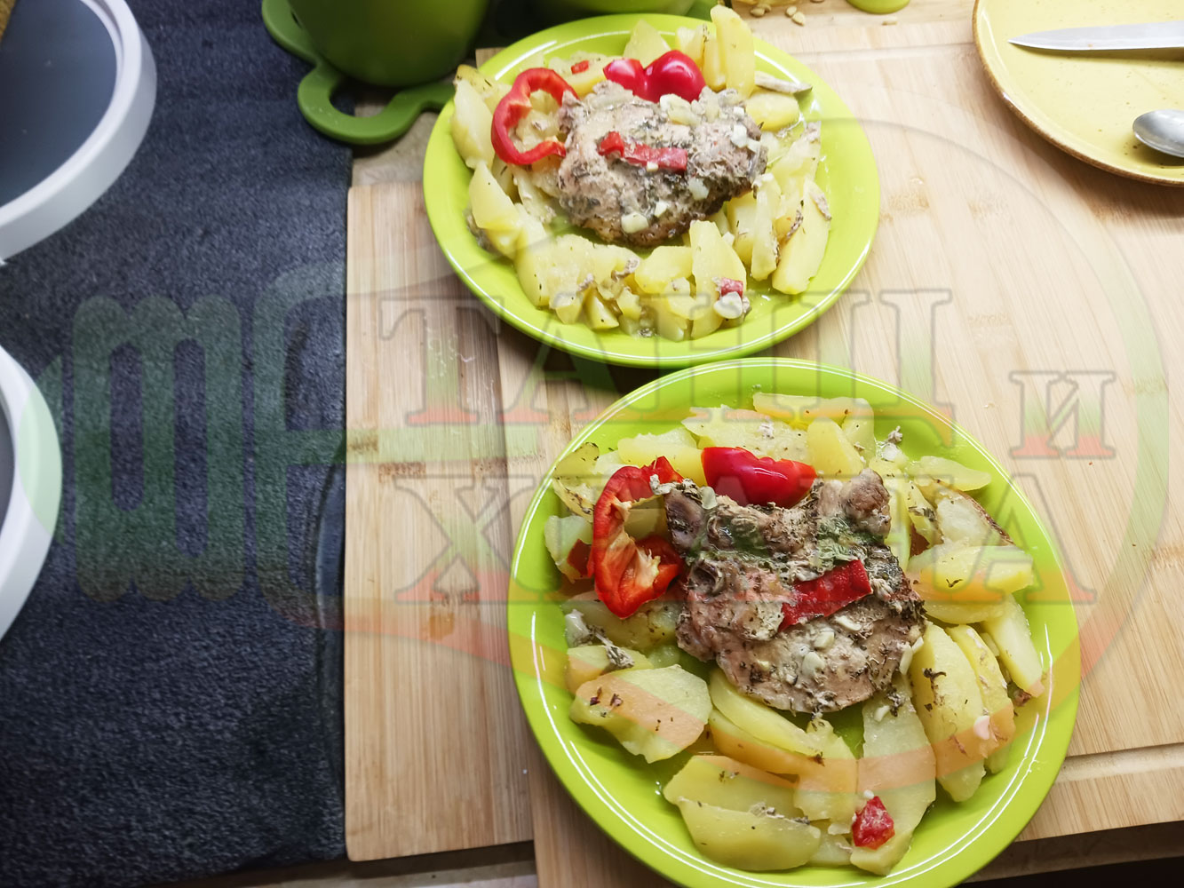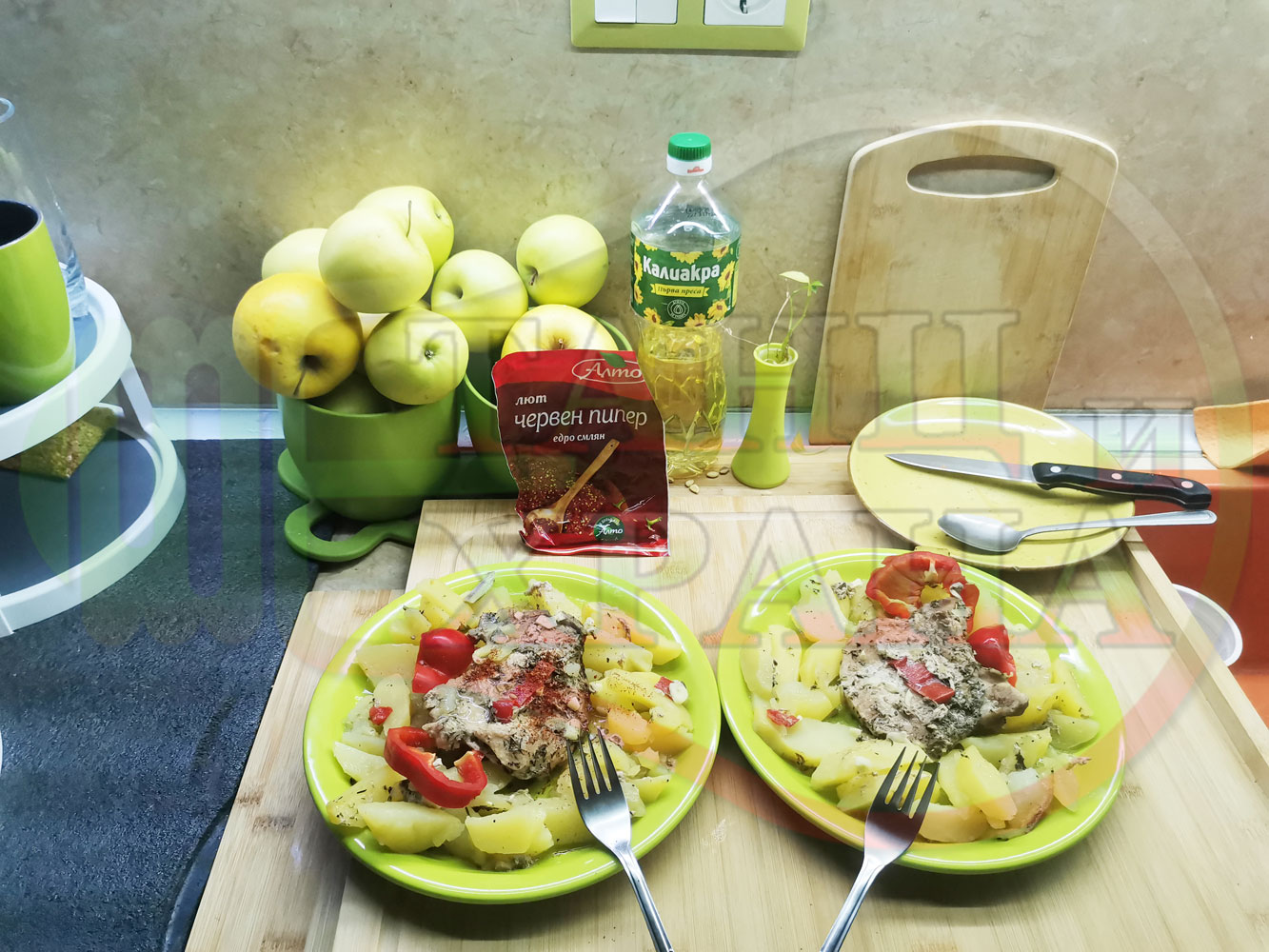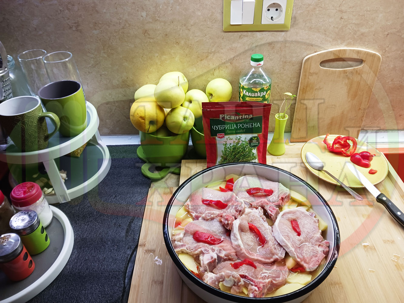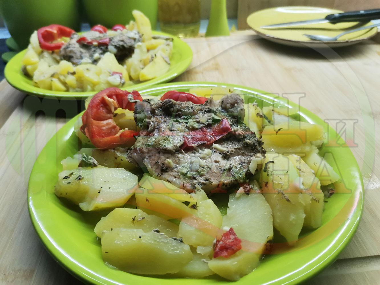 Свински пържоли "Червеночушкови роненочубрицови БГмерудийни картофени" шпиковани с червени пресни чушки запечени на фурна с картофи, ронена чубрица, стар чесън и краве масло