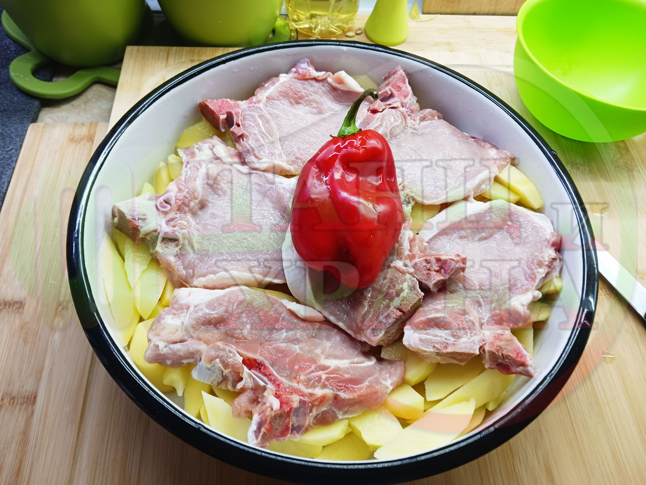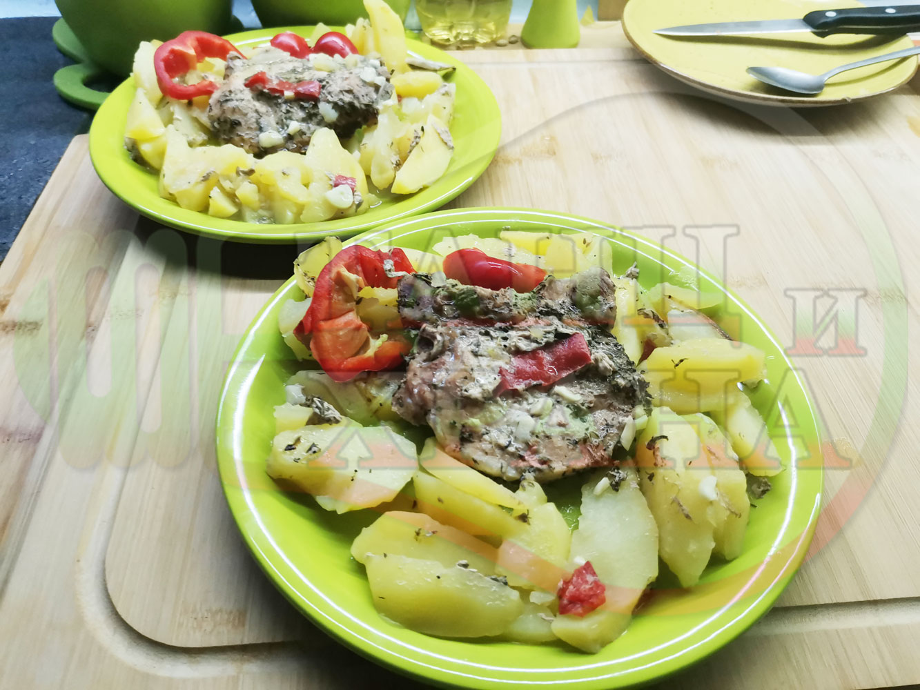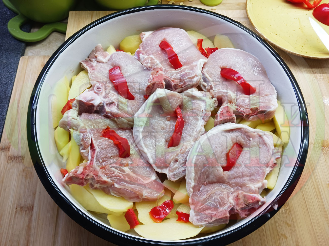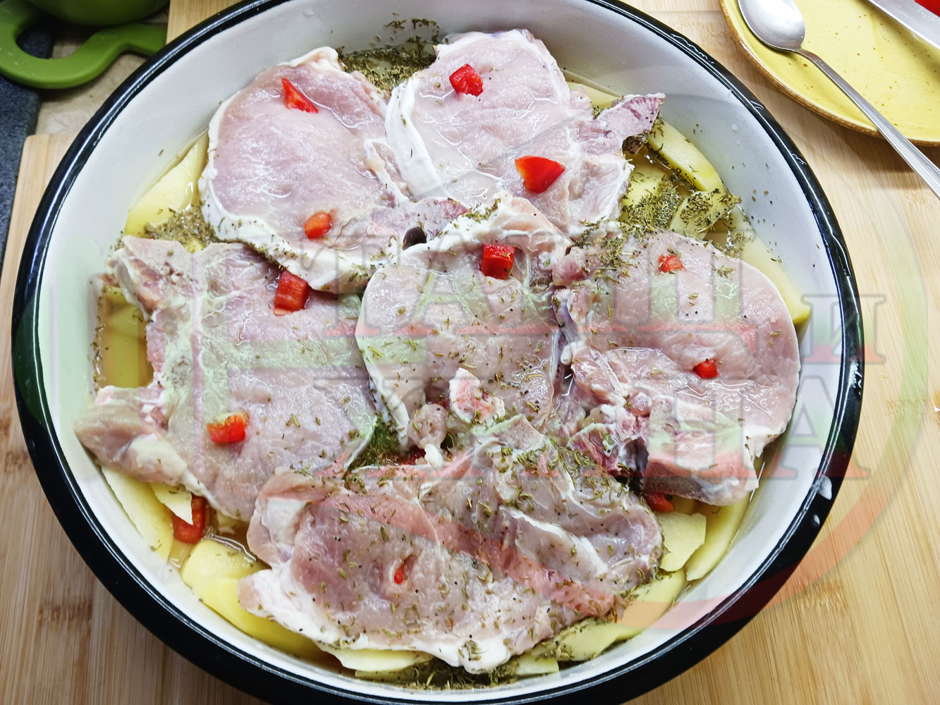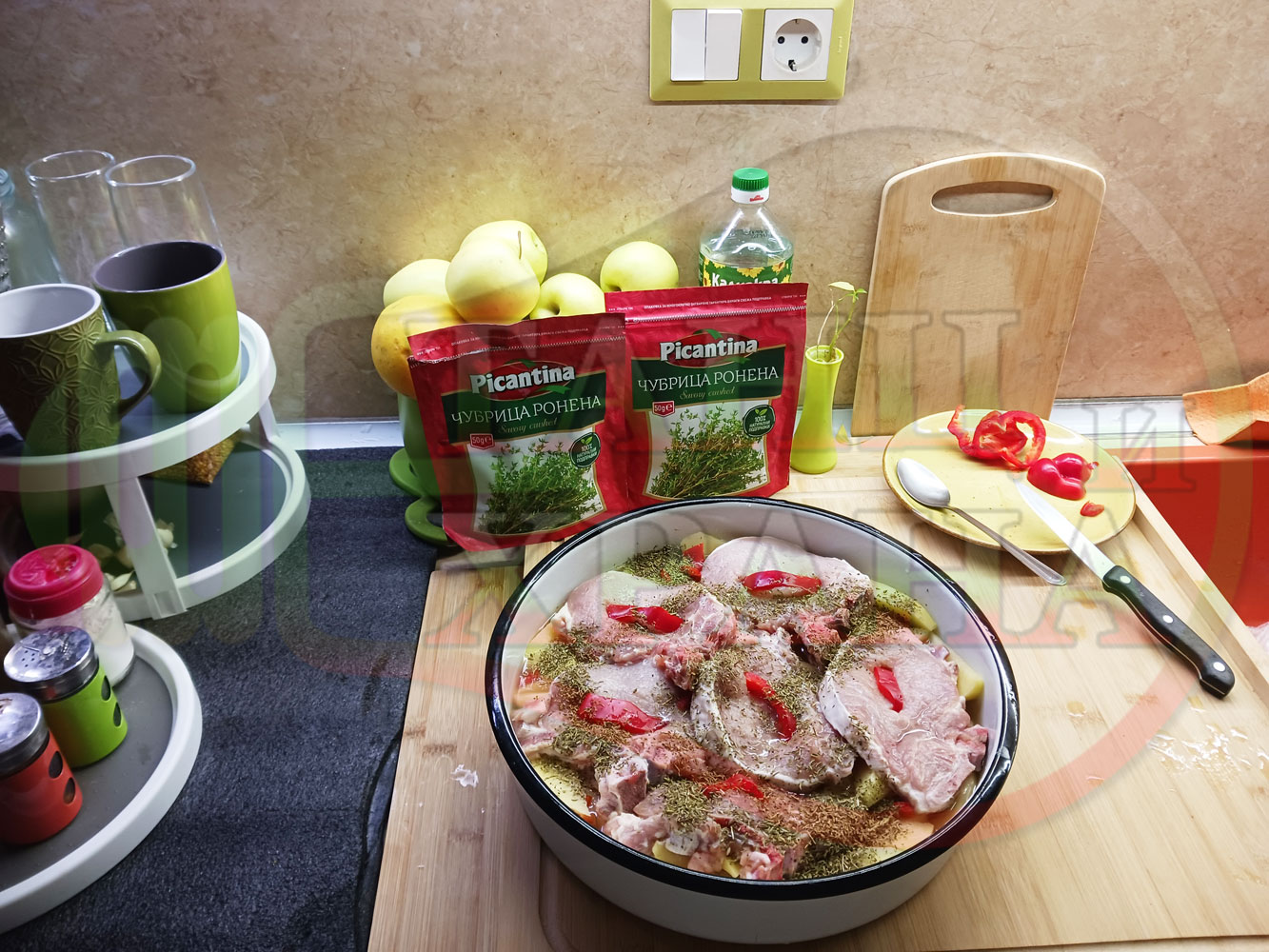 Свински пържоли "Червеночушкови роненочубрицови БГмерудийни картофени" шпиковани с червени пресни чушки запечени на фурна с картофи, ронена чубрица, стар чесън и краве масло