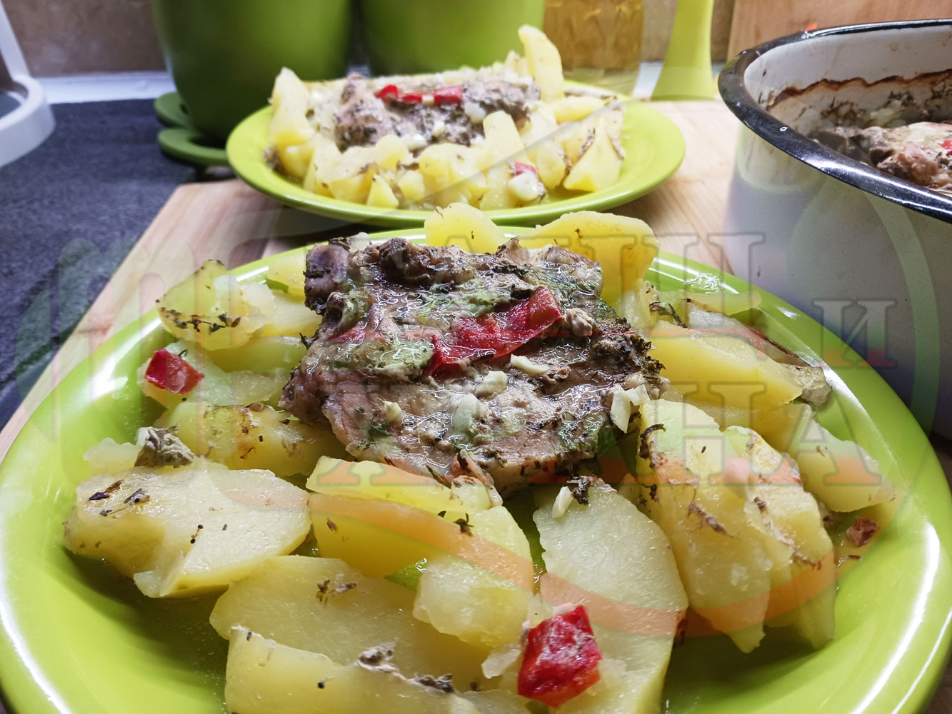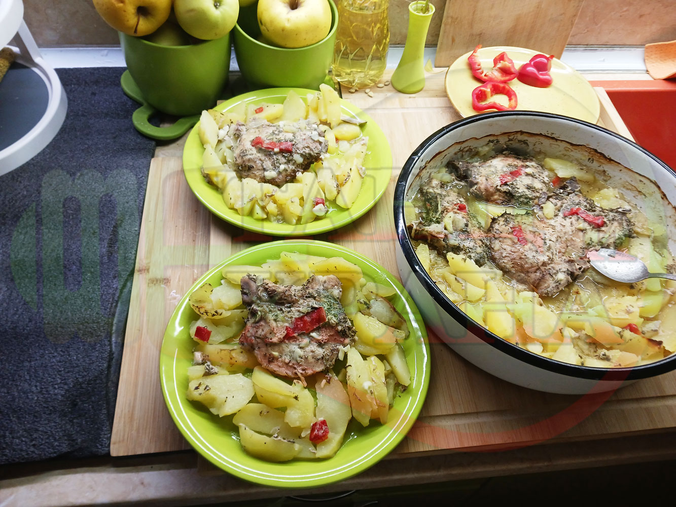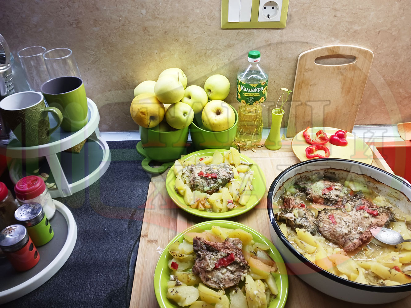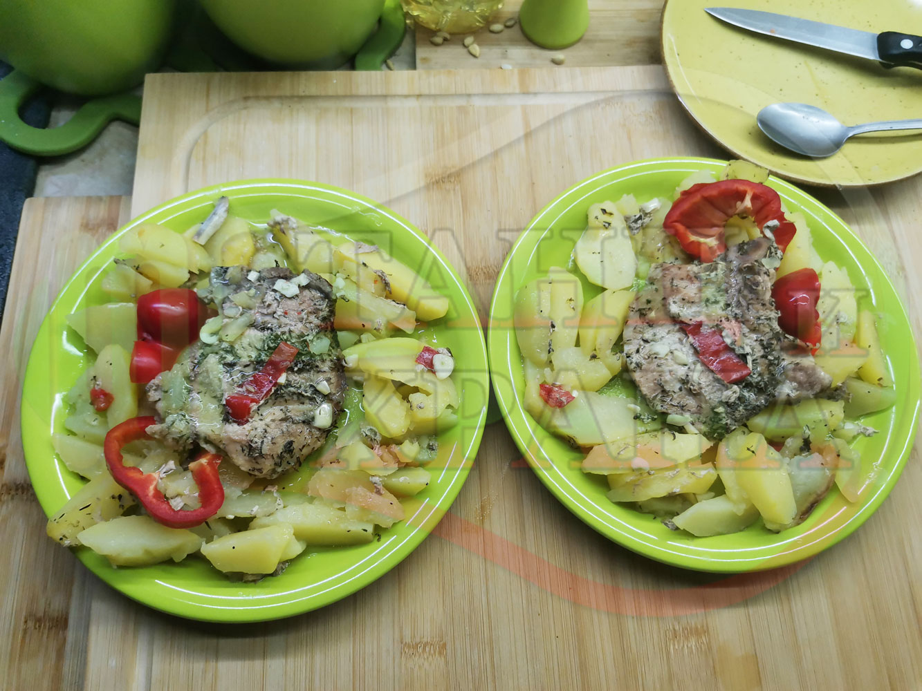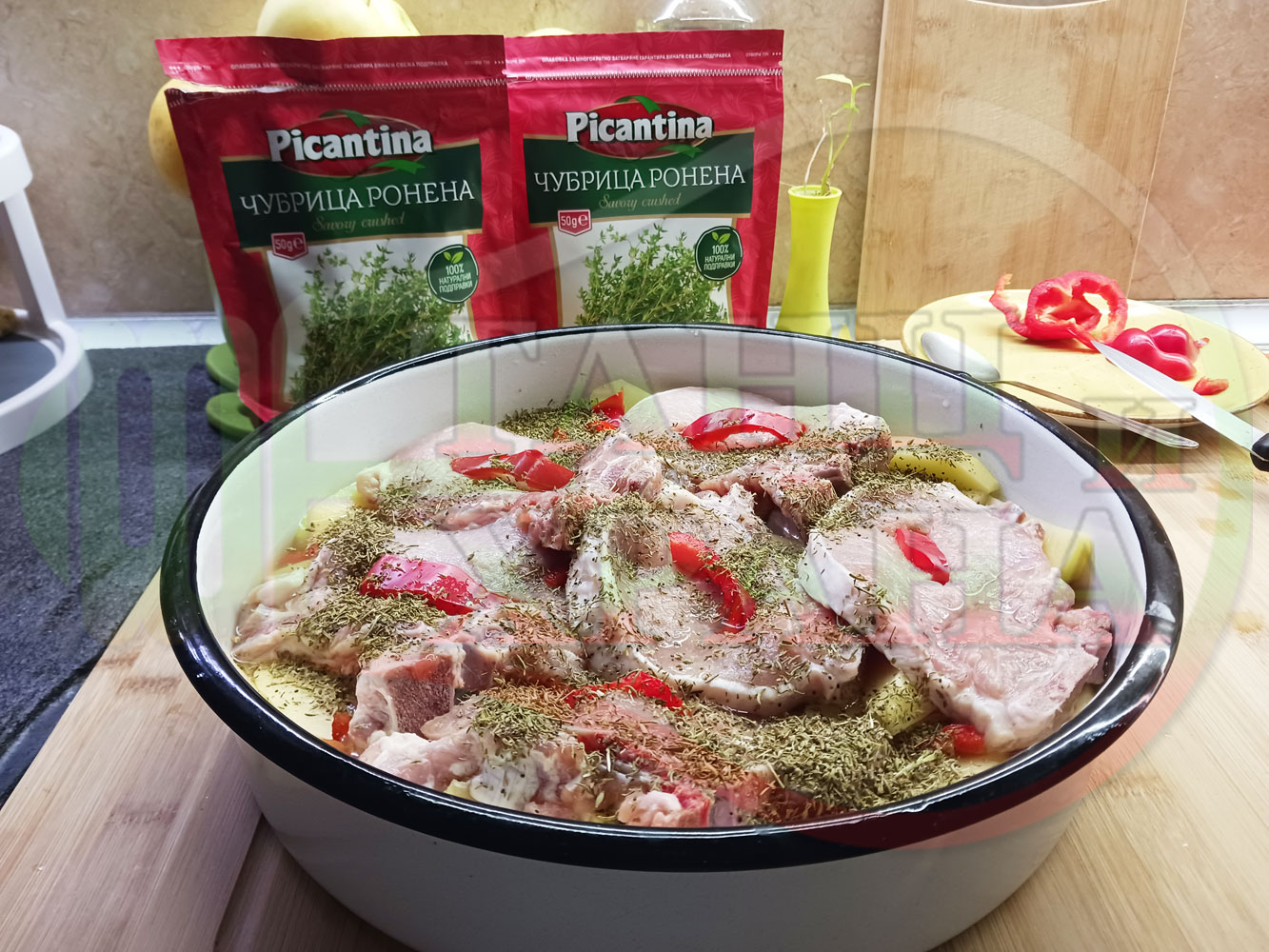 Свински пържоли "Червеночушкови роненочубрицови БГмерудийни картофени" шпиковани с червени пресни чушки запечени на фурна с картофи, ронена чубрица, стар чесън и краве масло