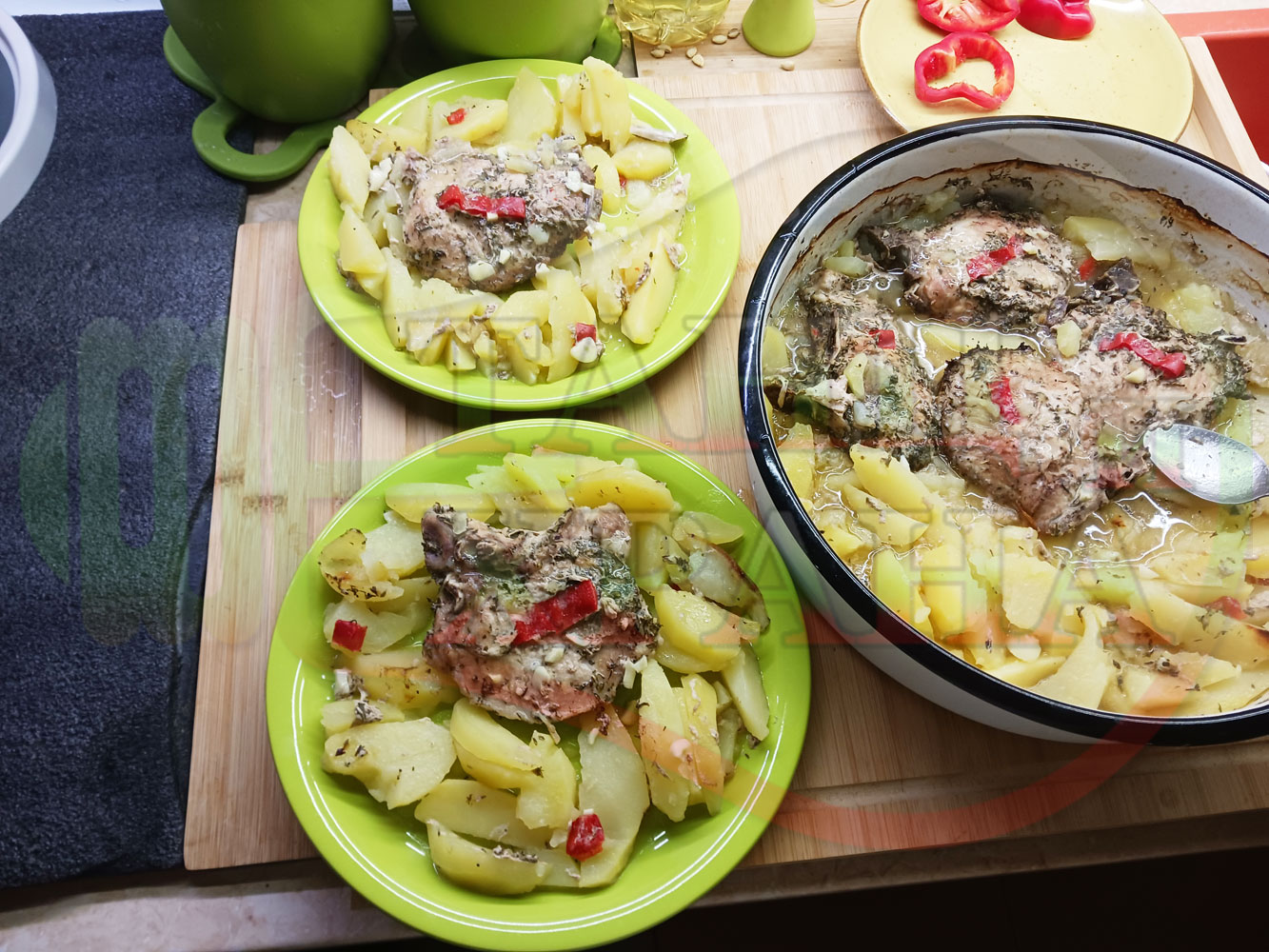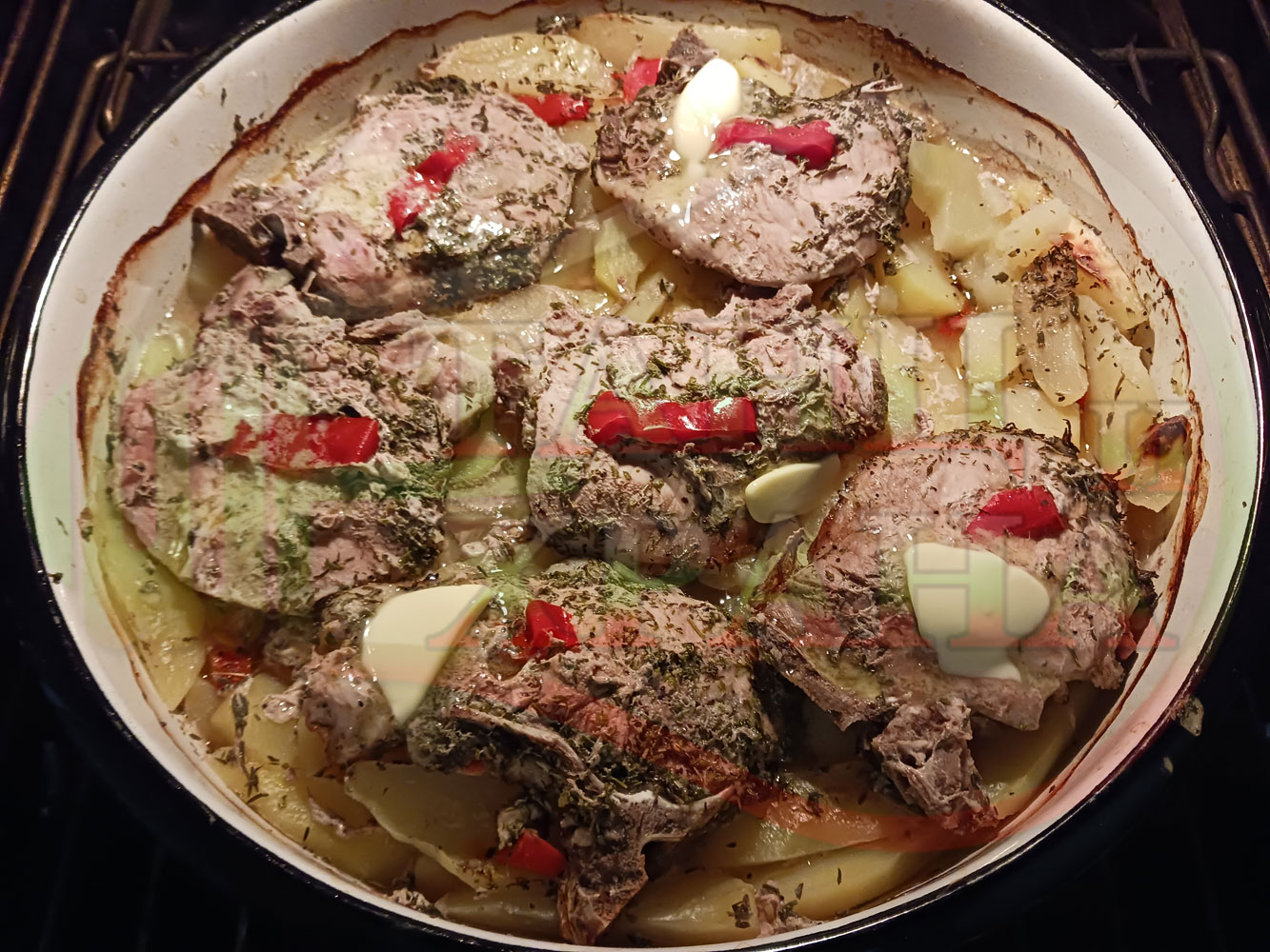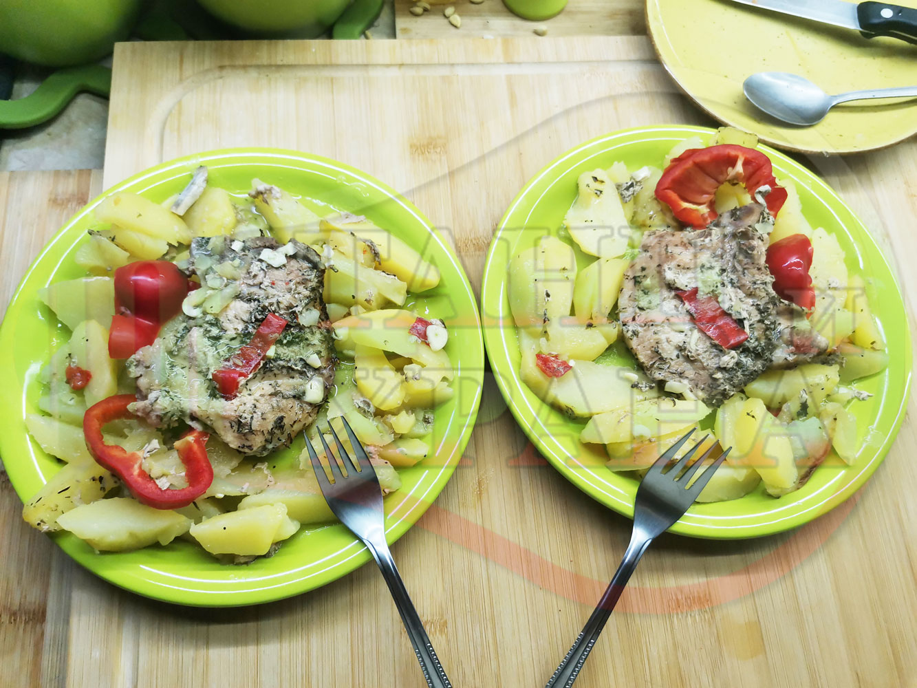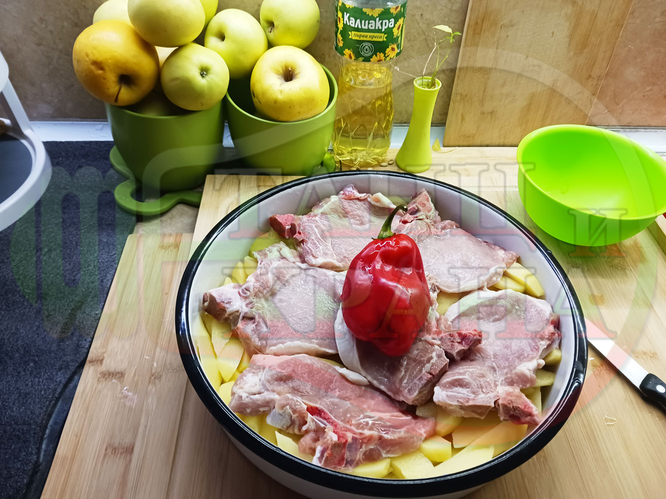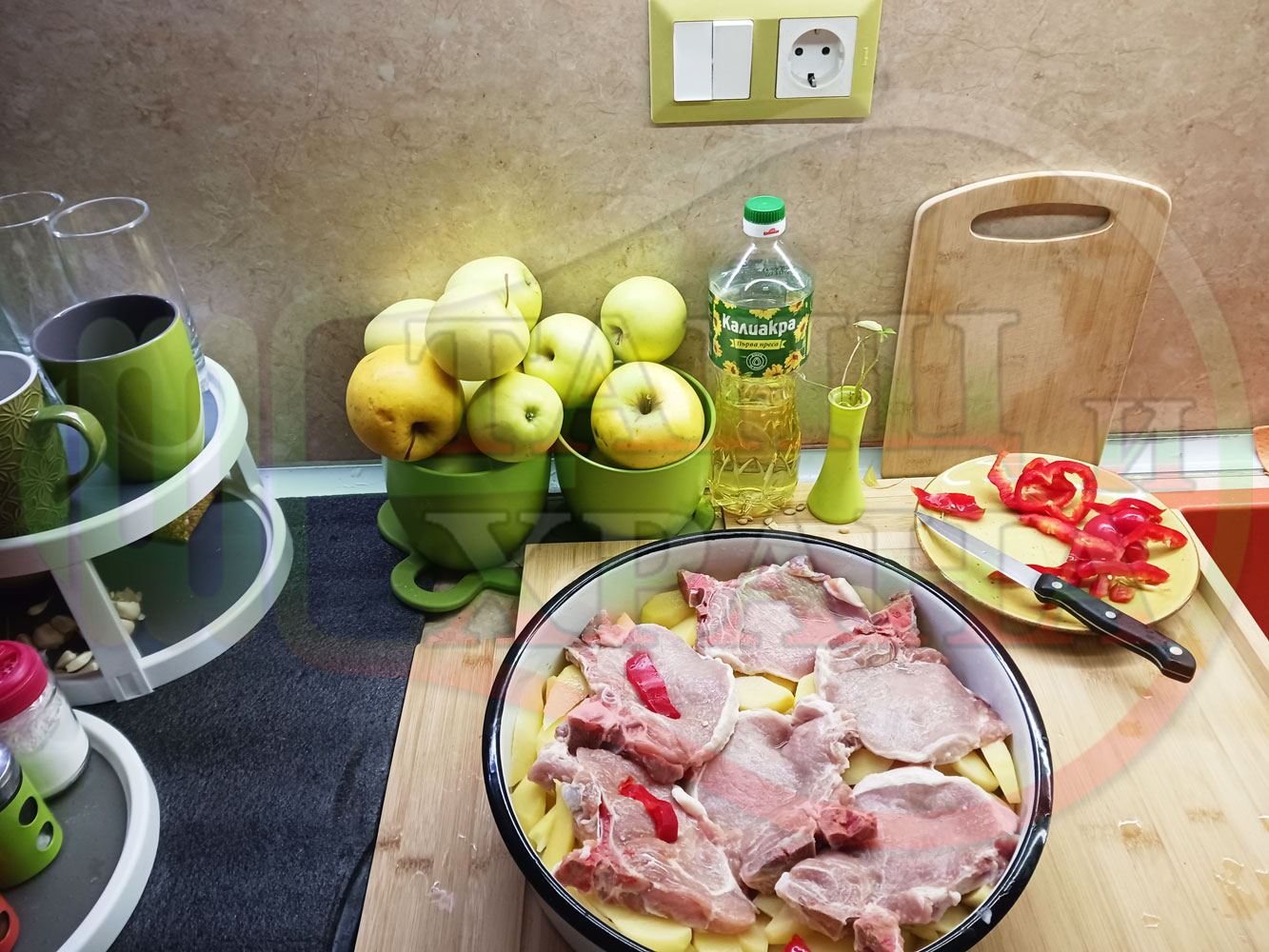 Свински пържоли "Червеночушкови роненочубрицови БГмерудийни картофени" шпиковани с червени пресни чушки запечени на фурна с картофи, ронена чубрица, стар чесън и краве масло
