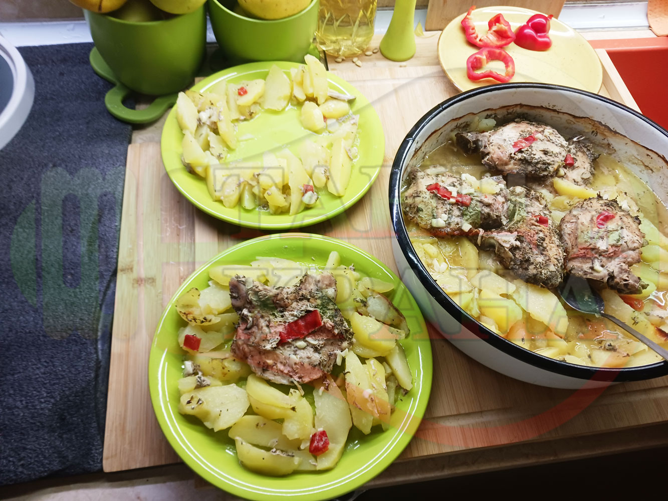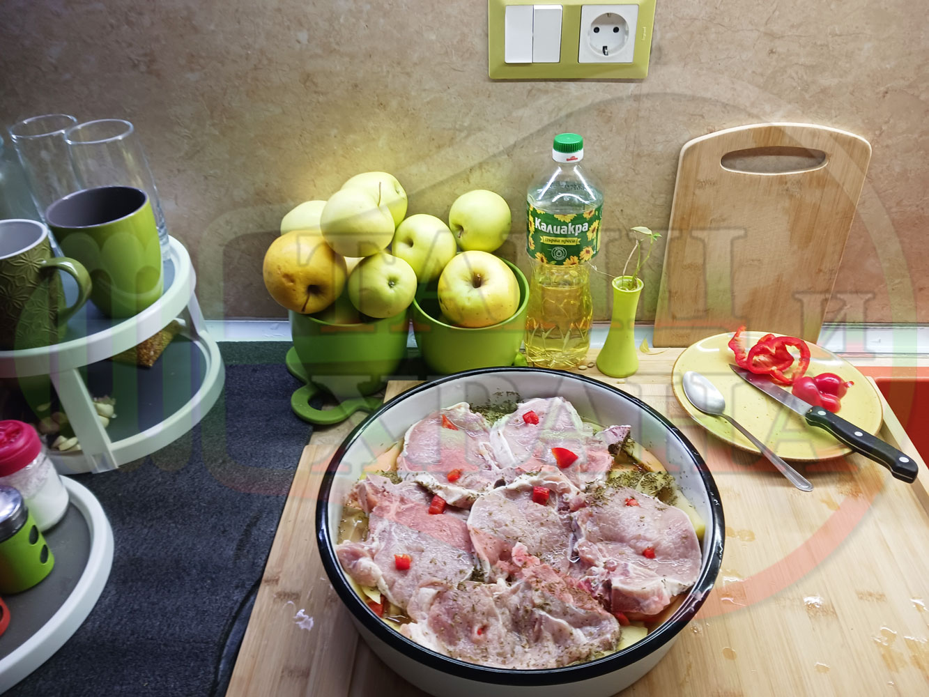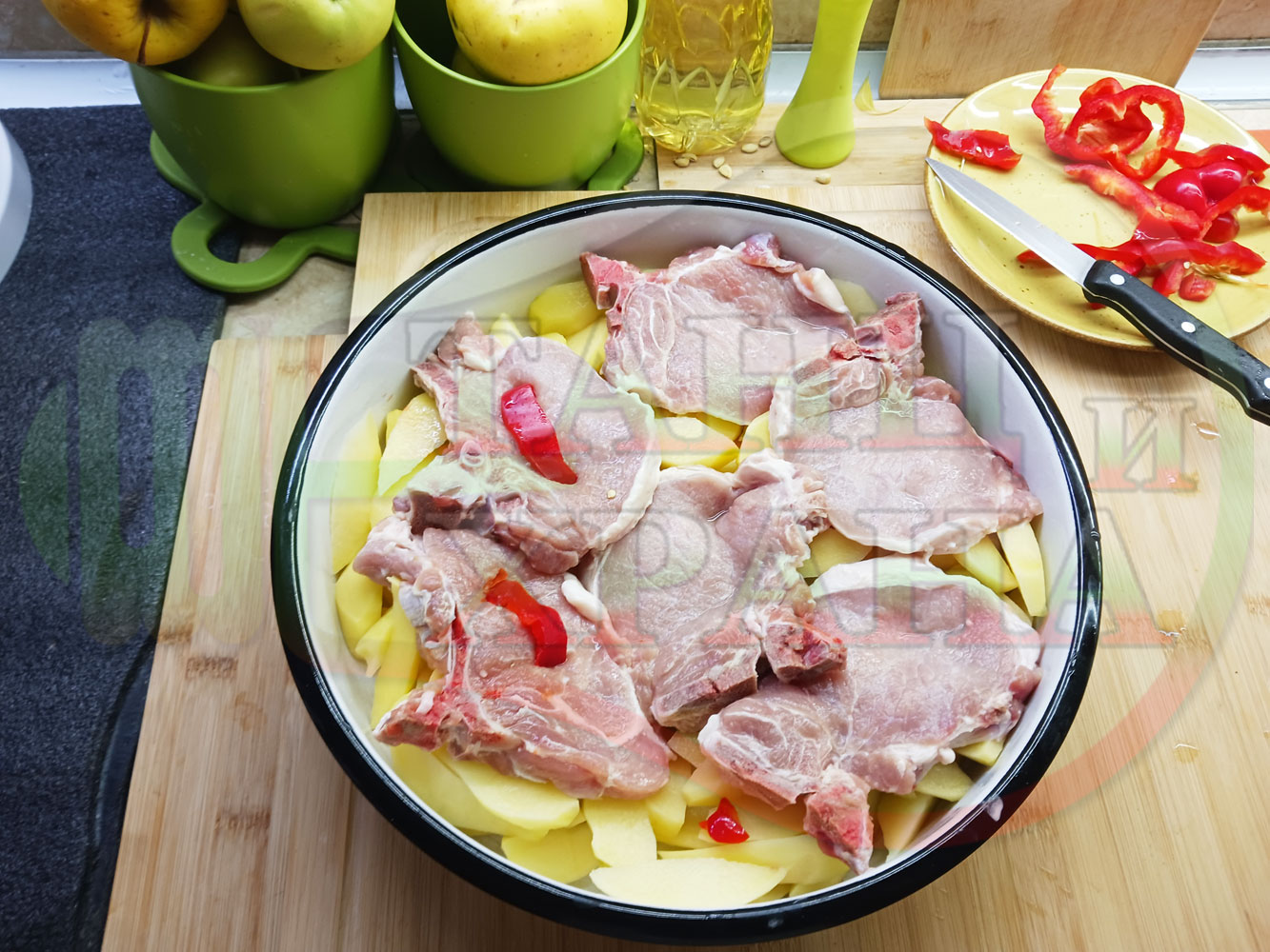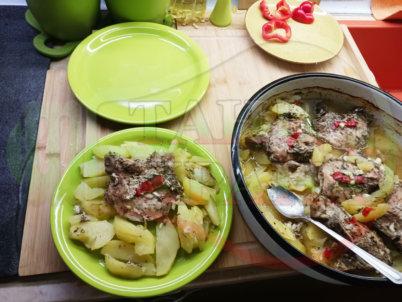 Свински пържоли "Червеночушкови роненочубрицови БГмерудийни картофени" шпиковани с червени пресни чушки запечени на фурна с картофи, ронена чубрица, стар чесън и краве масло
