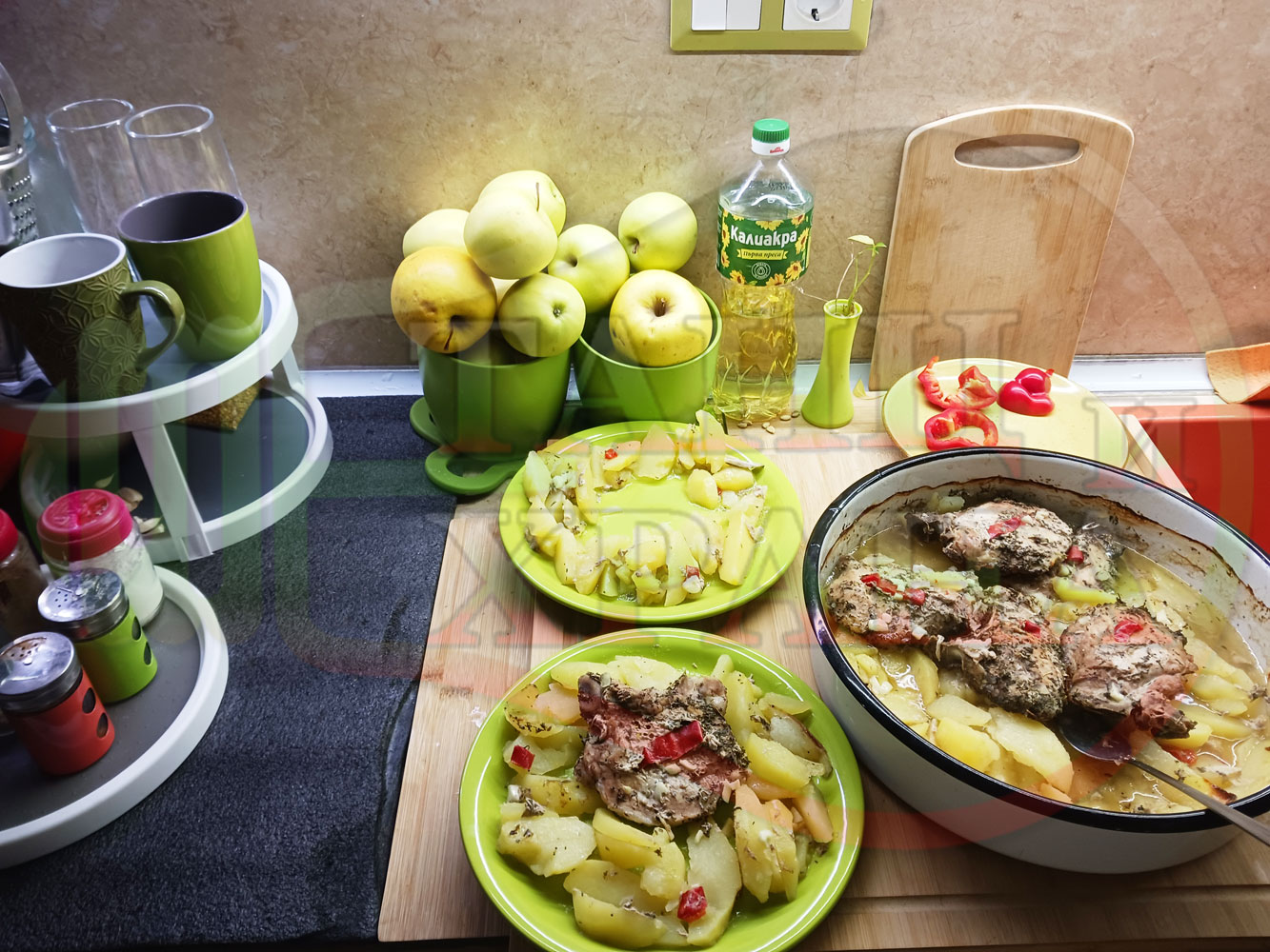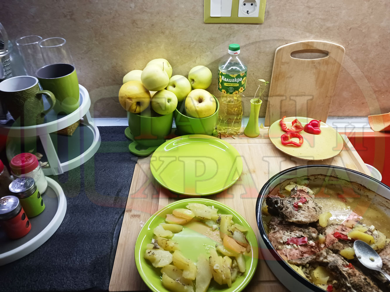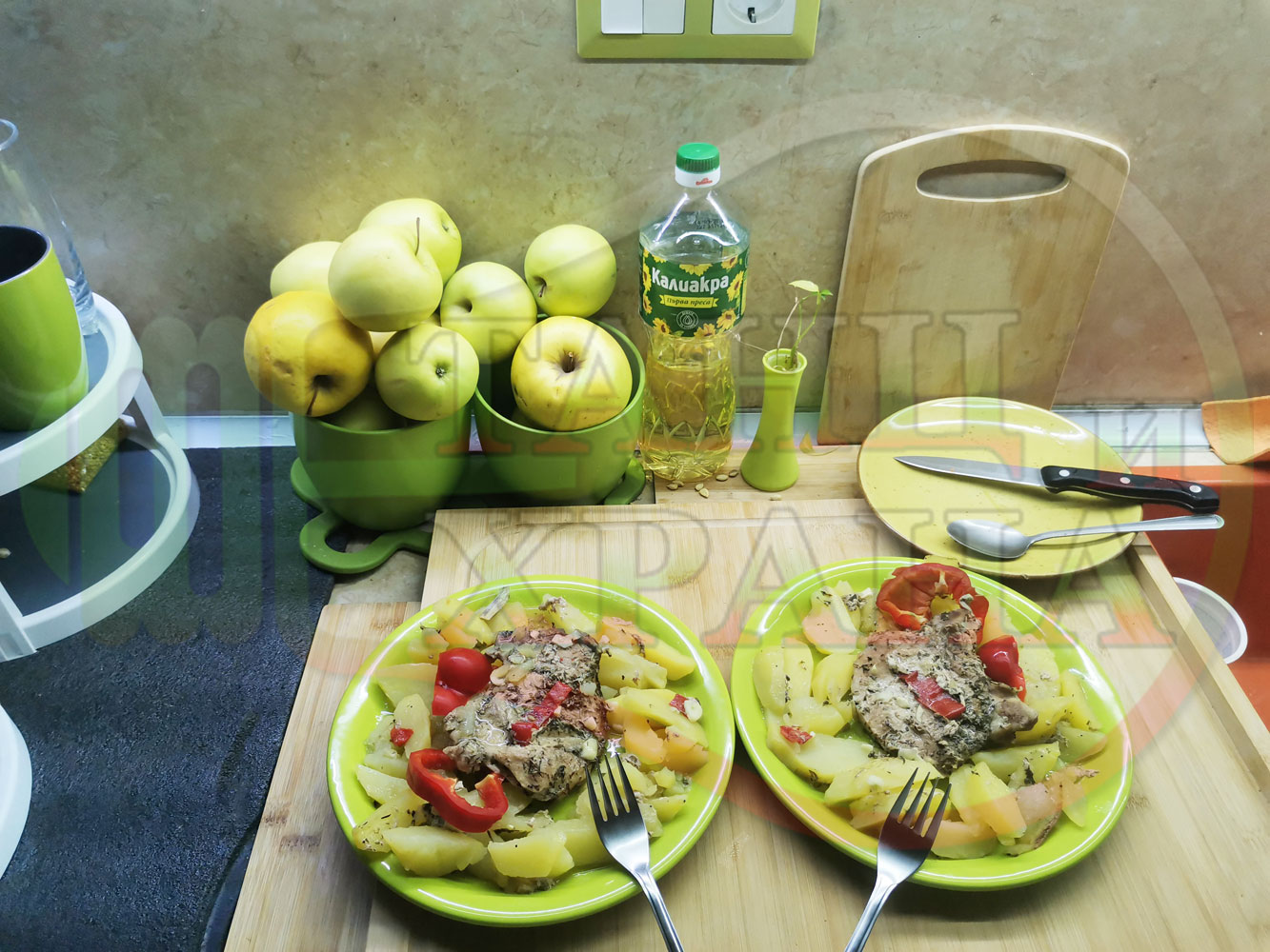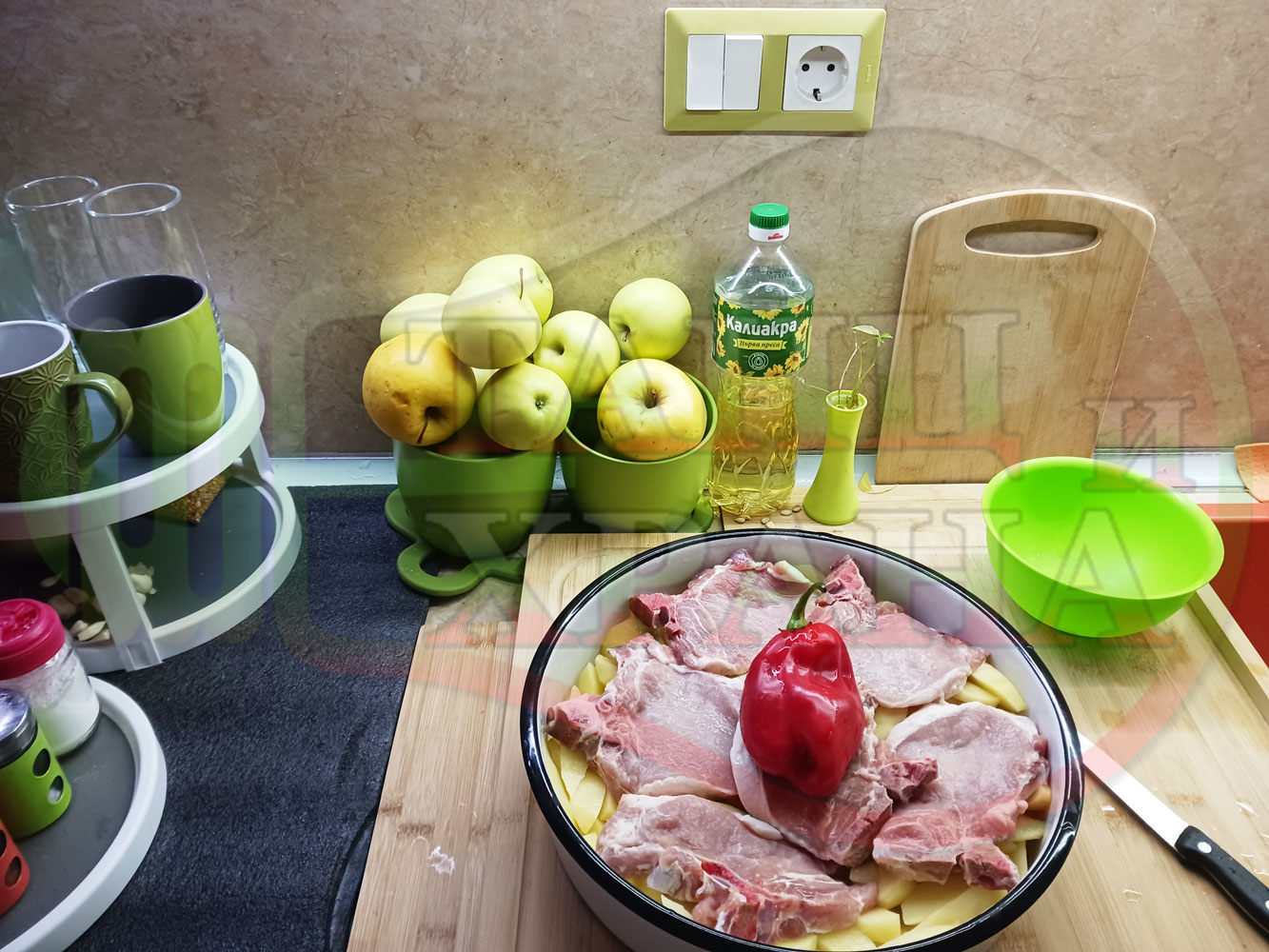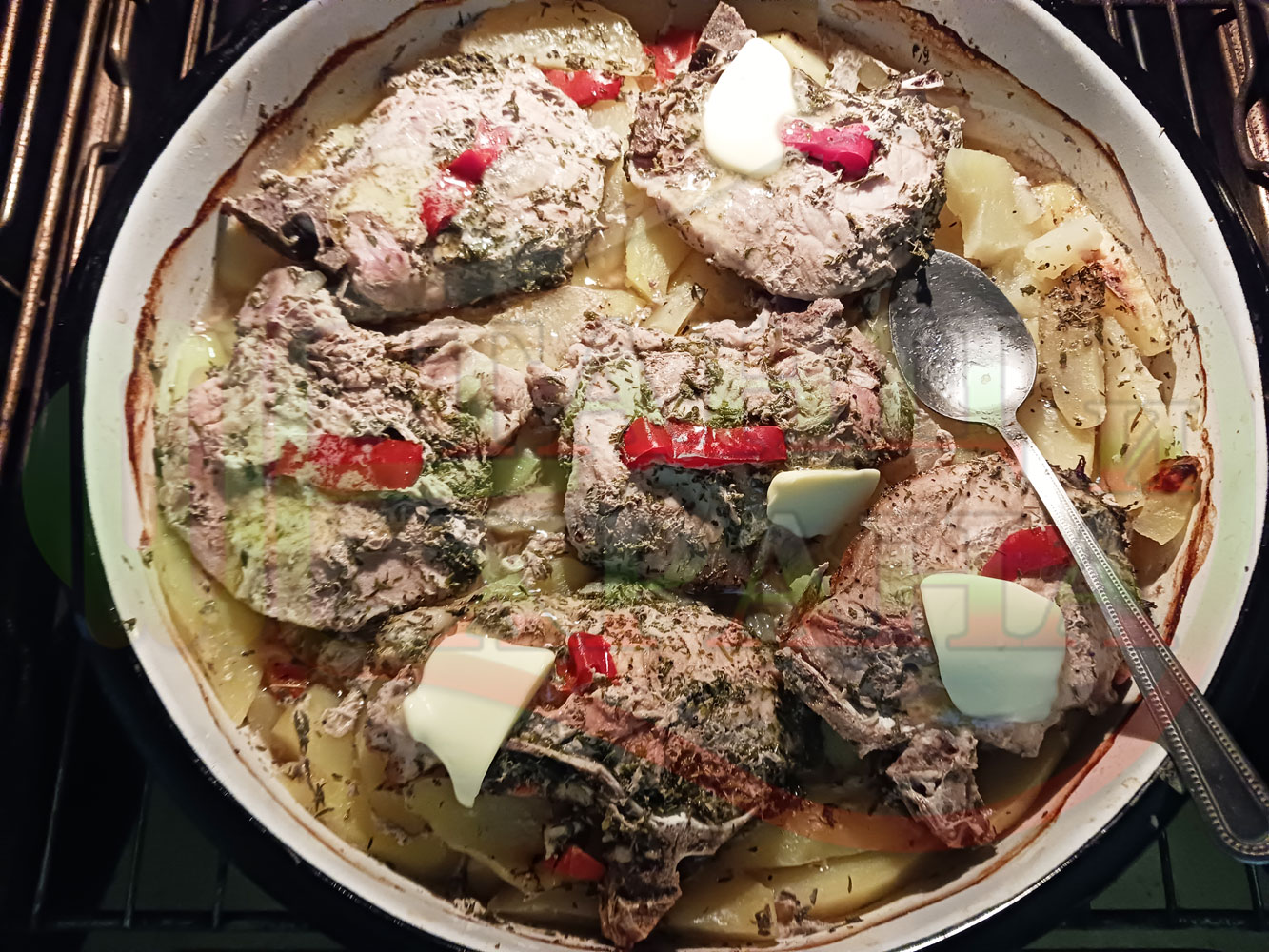 Свински пържоли "Червеночушкови роненочубрицови БГмерудийни картофени" шпиковани с червени пресни чушки запечени на фурна с картофи, ронена чубрица, стар чесън и краве масло