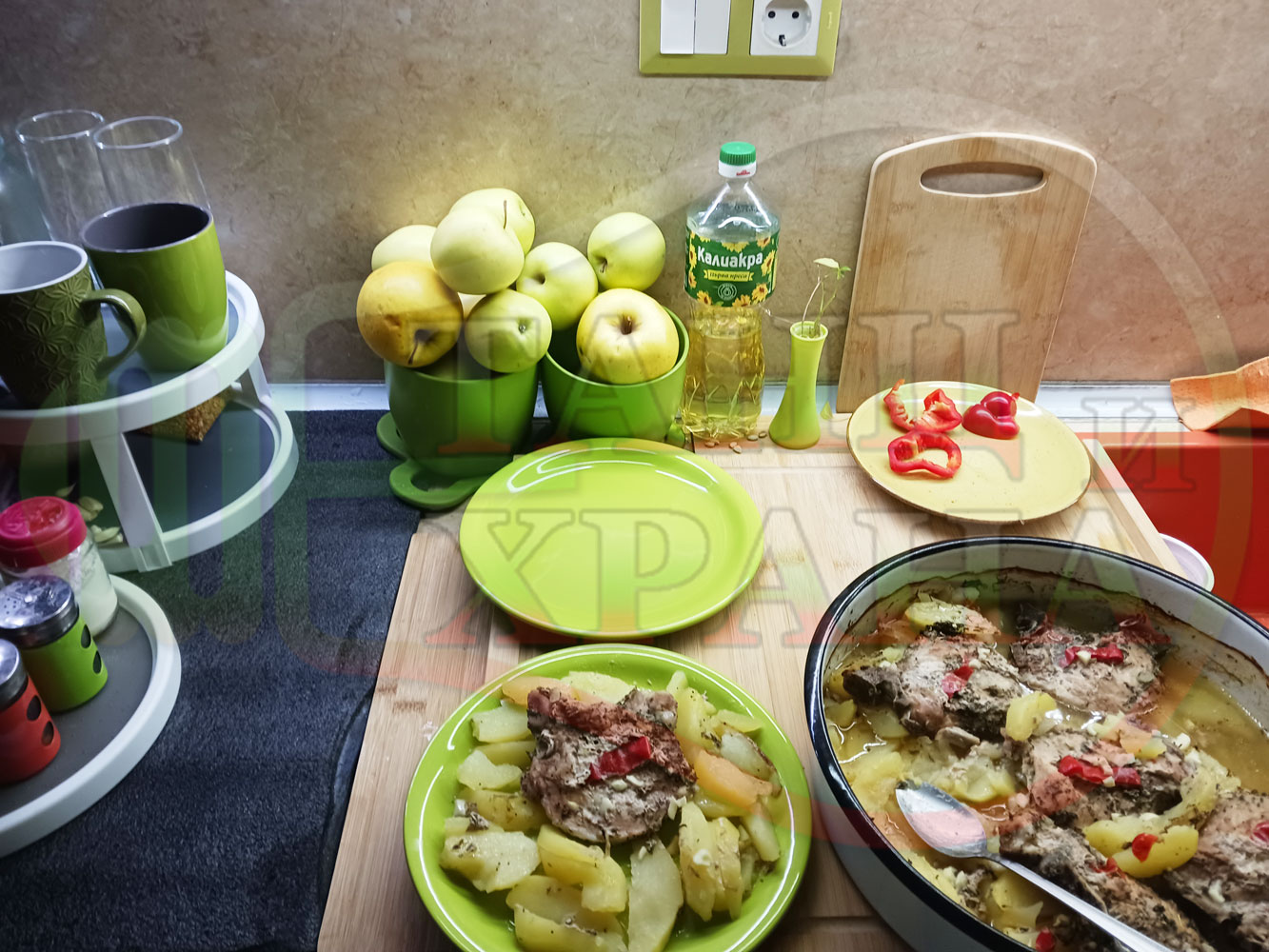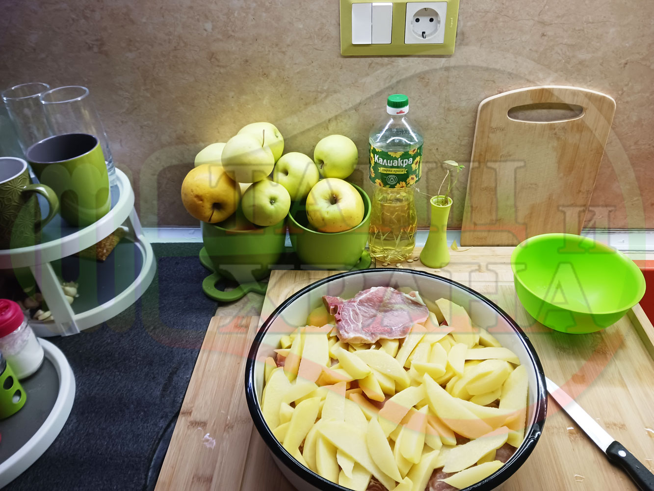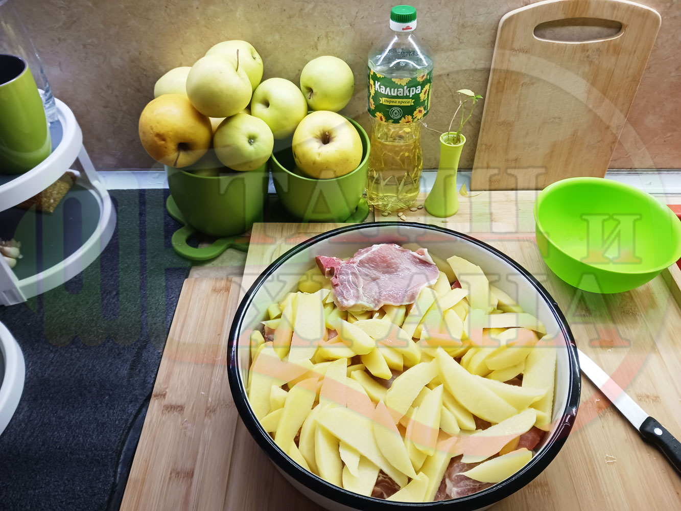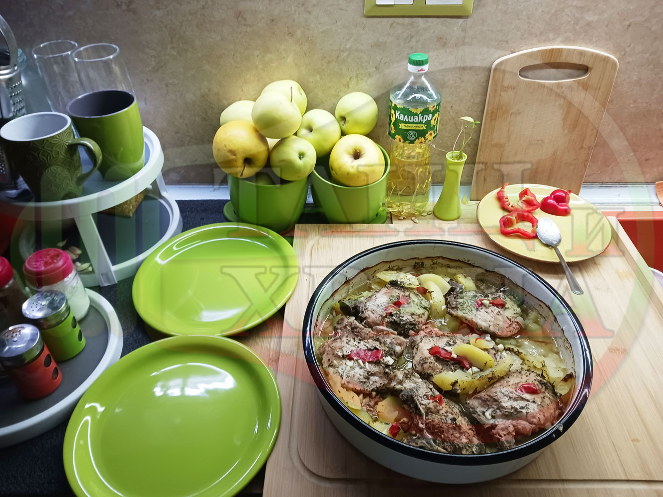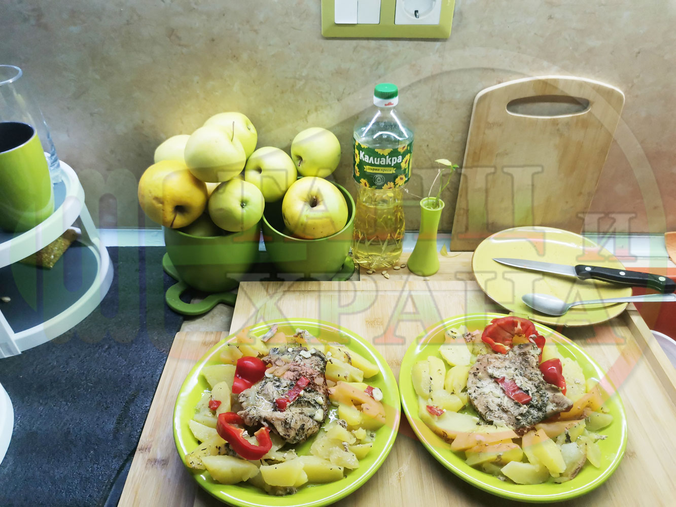 Свински пържоли "Червеночушкови роненочубрицови БГмерудийни картофени" шпиковани с червени пресни чушки запечени на фурна с картофи, ронена чубрица, стар чесън и краве масло