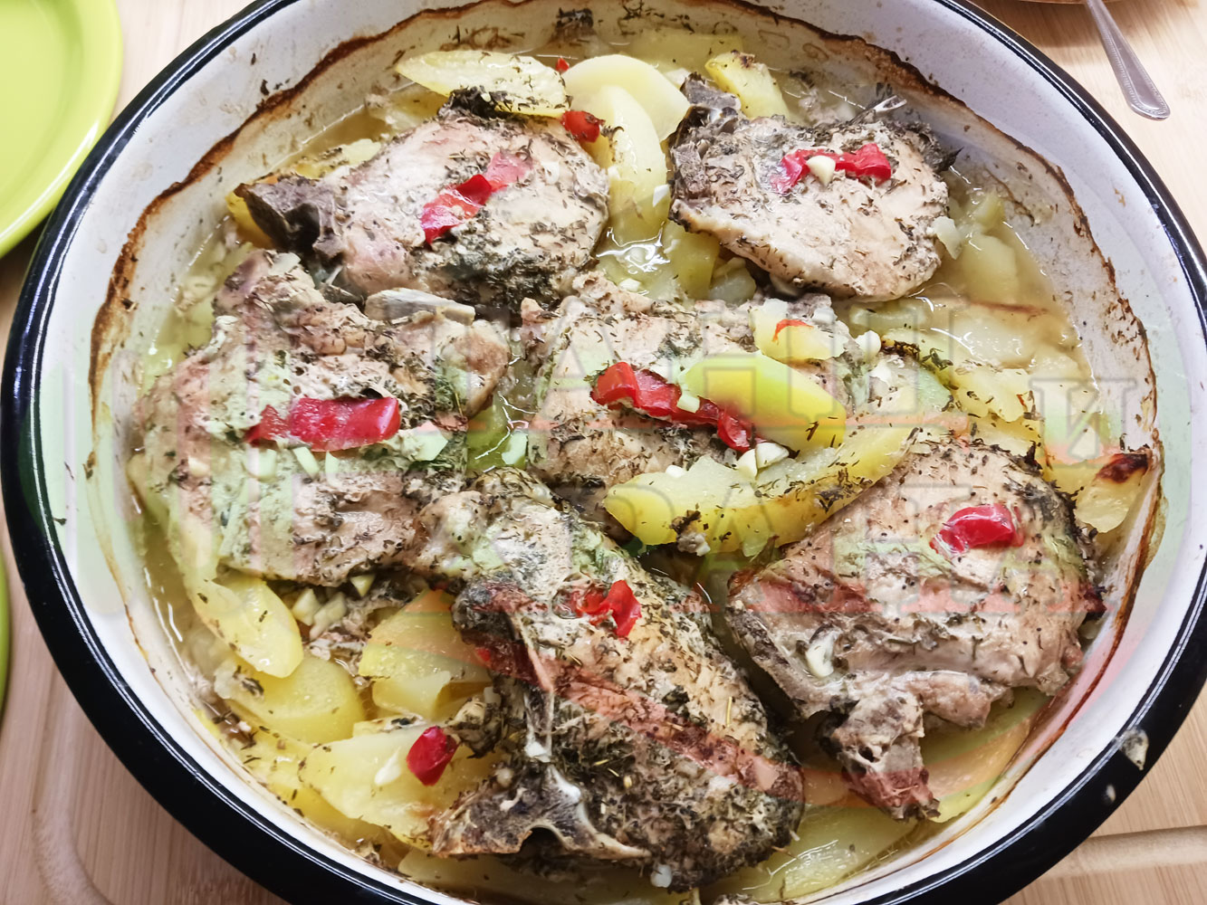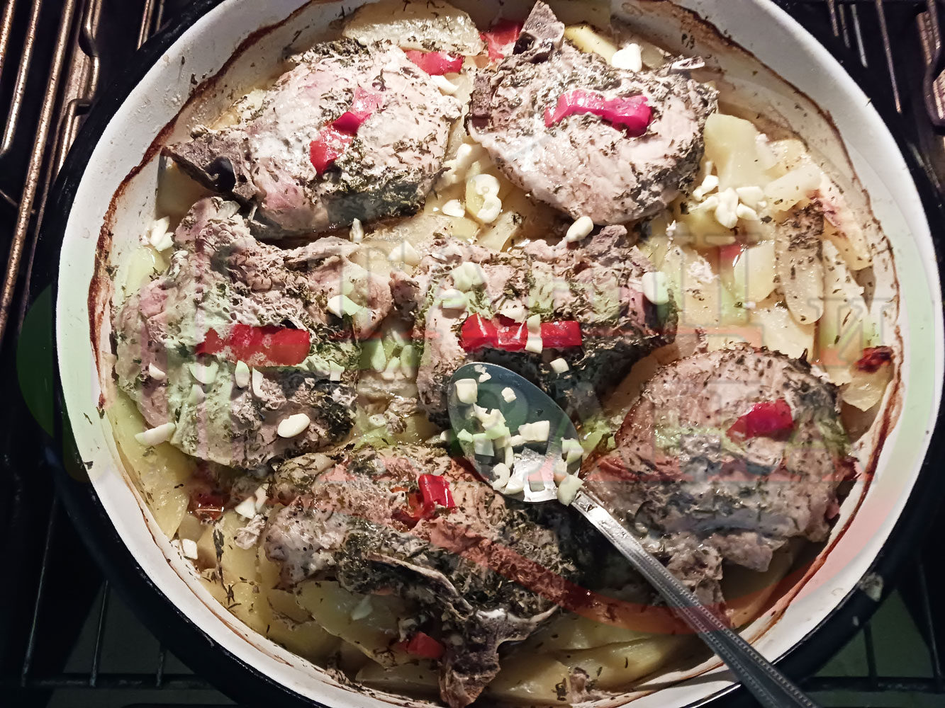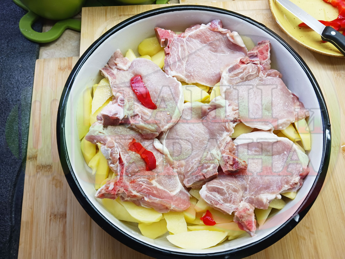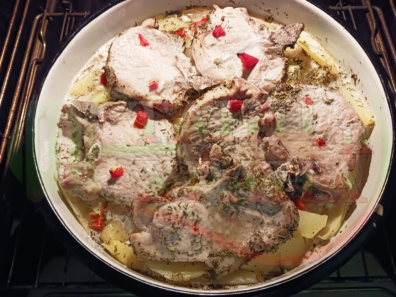 Най-вкусните "бели картофи със свинско", които приготвяше майка ми. Казвахме им бели защото не се добавяха никакви мерудии освен българска ронена чубрица. Реших да осъвременя рецептата като шпиковам пържолите с червени пресни чушки по метод на шпиковане, който създадох преди време. Няма как да обясня мириса и аромата, който се носи в кухнята на запечени пържоли и картофи с краве масло, овкусени от леката карамелизация на чушките, в идеална хармония с вкуса на изсушената на слънце чубрица. Отново се получи невероятна вкусно, вкусна, вкусотия (вкуснотия). laughing